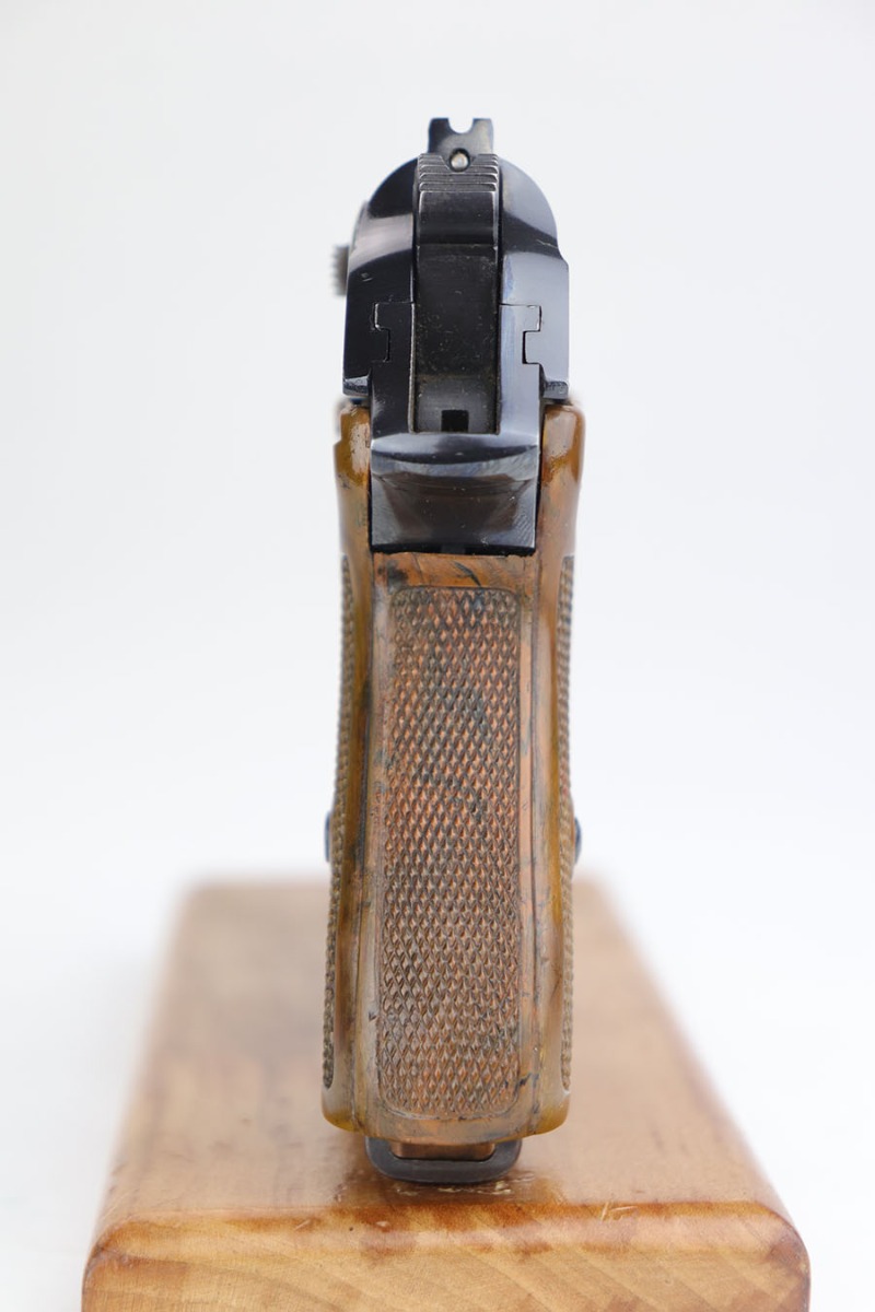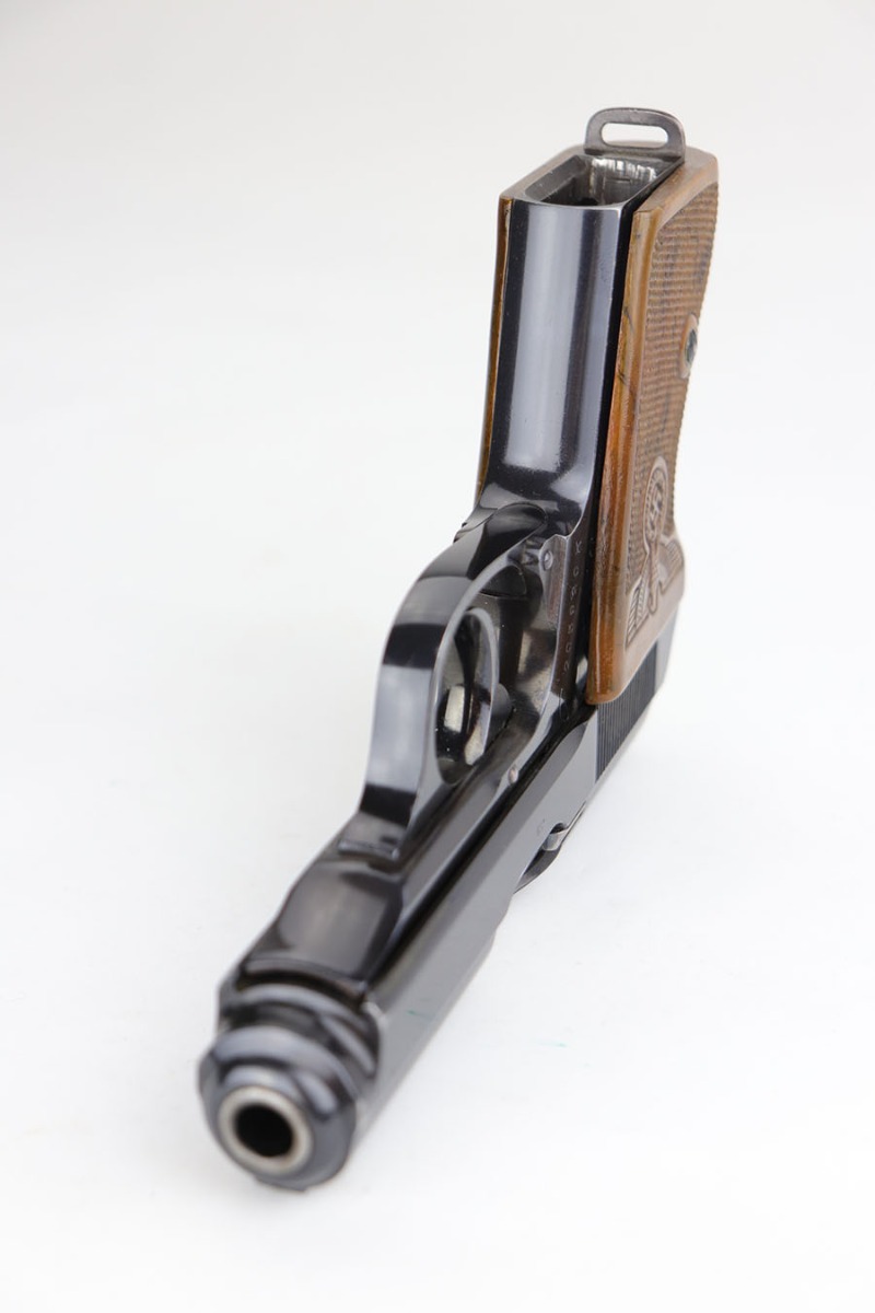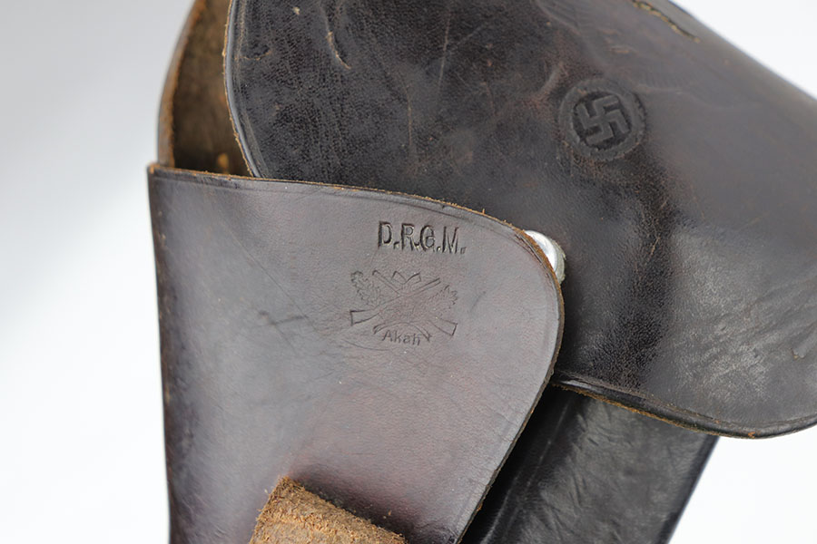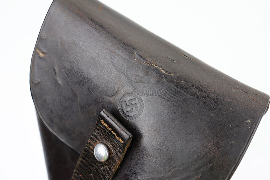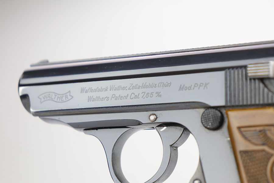 The Walther PPK with Party Leader Grips was the “Honor Weapon of the Political Leaders”. The Hoheitsabzeichen or High Insignia is the Eagle over Swastika found on either side of the grips where the Walther banner is normally located. The person entitled to wear the honor weapons that were awarded them by the Fuhrer were the Political Leaders of the national, regional and district territories, as well as leaders of local and support units. The persons who wore the honor weapon had their authorizations listed in the district personnel offices, and had to have in their possession a weapons permit issued by the police, which was obtained through official channels. These rare pistols were estimated to number around 3,500, and are widely faked, but this one is guaranteed original.