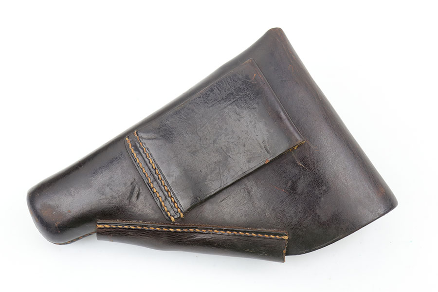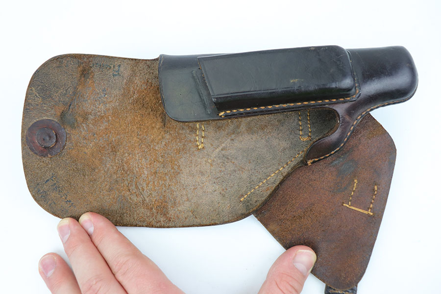 4/2/20 – This is an exquisite and rare Party Leader Walther PPK rig. The gun is all original finish and near-mint, with just some minor muzzle wear from the holster, and the fire bluing has worn off the safety. The serial dates it to 1939 and is in the correct range for the issuance of the Party Leader “Honor” Grip. The grip is excellent as well, with no cracks or chips. Nearly all PPK grips from that era will have tiny stress fractures and are to be expected if the grip is real. Minty bore and finger extension magazine. Rig includes a flat-bottom spare and an original Party Leader holster. The holster is in very good condition but the top flap does have a bit of cracking, and the Party Leader Eagle has faded some. The rig can be separated should the customer wish, with $9500 as price on the pistol, and $2250 on the holster.