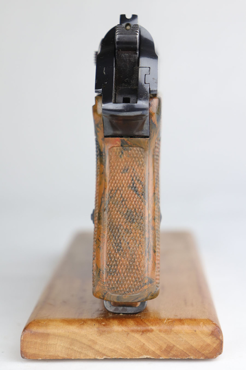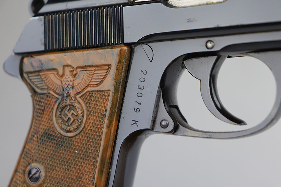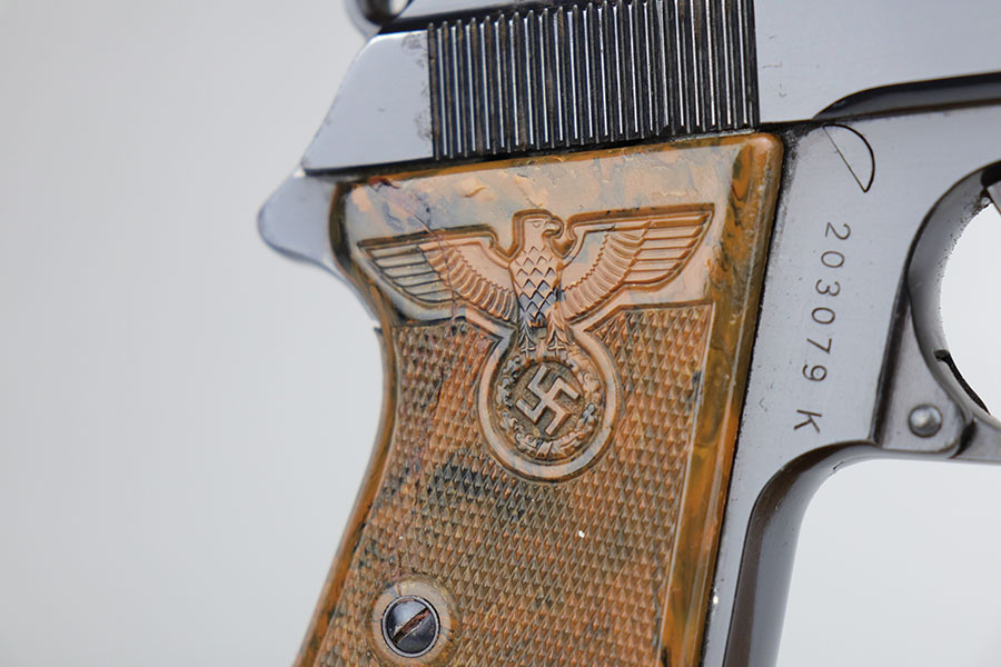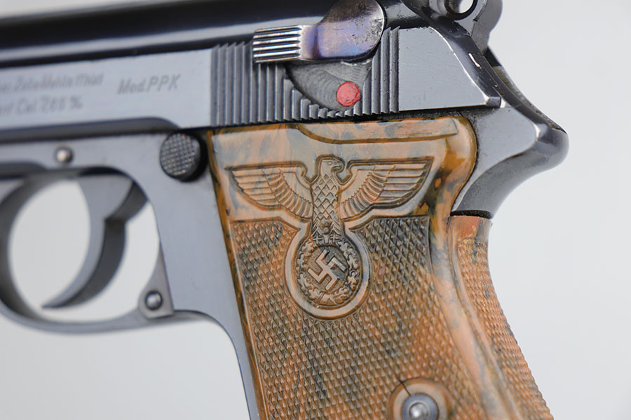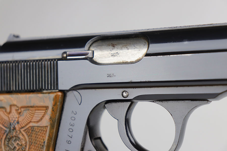 The Walther PPK with Party Leader Grips was the “Honor Weapon of the Political Leaders”. The Hoheitsabzeichen or High Insignia is the Eagle over Swastika found on either side of the grips where the Walther banner is normally located. The person entitled to wear the honor weapons that were awarded them by the Fuhrer were the Political Leaders of the national, regional and district territories, as well as leaders of local and support units. The persons who wore the honor weapon had their authorizations listed in the district personnel offices, and had to have in their possession a weapons permit issued by the police, which was obtained through official channels. These rare pistols were estimated to number around 3,500, and are widely faked, but this one is guaranteed original.