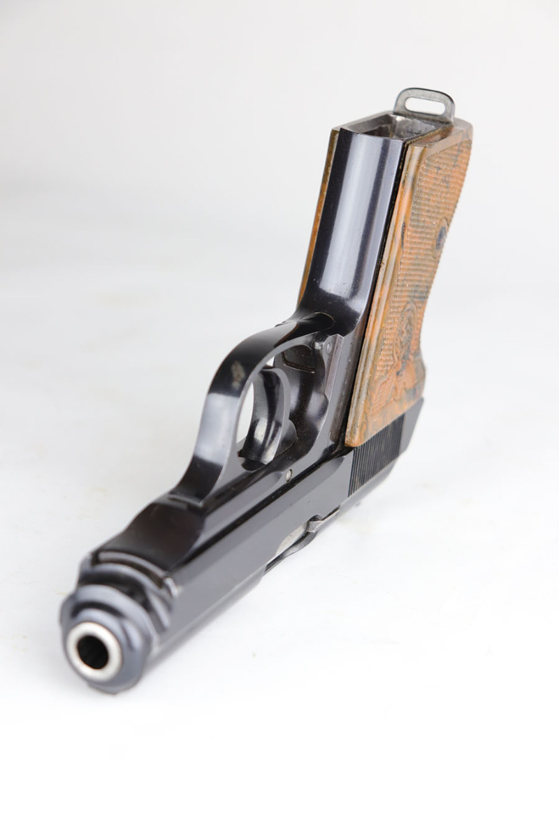 7/17/20 – This is a gorgeous and rare Party Leader Walther PPK from the Nazi era. The gun has excellent original finish with just a bit of muzzle wear on each side of the slide, as well as two small spots of wear on the trigger guard and right side of the slide. There is also a bit of pinpricking on the left side muzzle and rear right side of the slide. The serial dates it to 1939, and is in the correct range for the issuance of the Party Leader “Honor” Grip. The grip is excellent as well, but does have a repaired crack on the right side. Mint bore and excellent finger extension magazine.