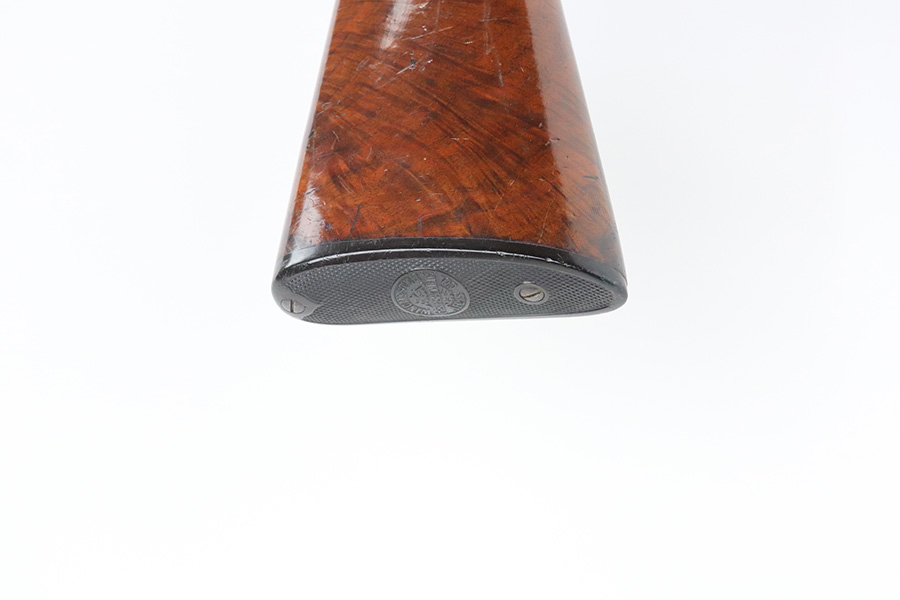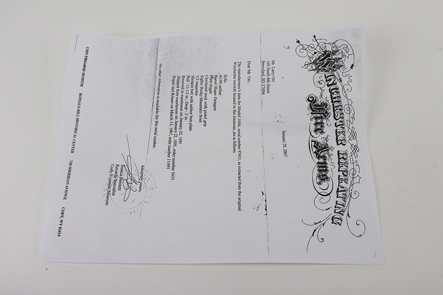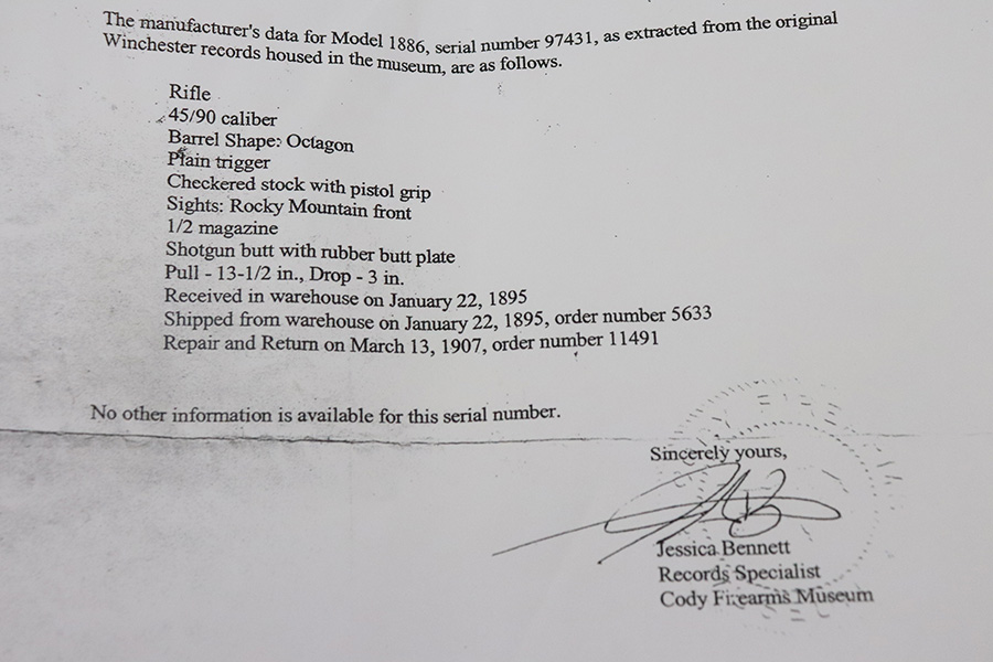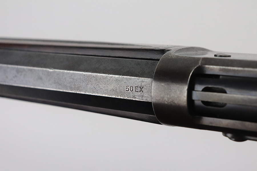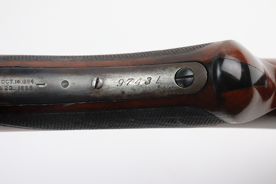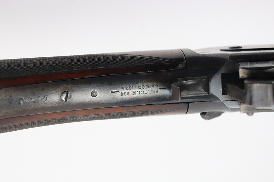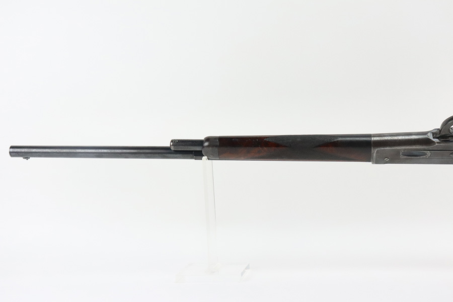 7/28/21 – This is a very nice example of a rare Winchester Model 1886 Deluxe Short Rifle in .50 express. It has gorgeous 3x deluxe checkered wood with all of its original piano varnish. It has a 24in half octagon barrel, extra shot 1/2 mag, and shotgun butt. The rifle started out as a 45-90 deluxe as the factory letter states, but went back to the factory in 1907 and came back in .50 express with no provision for a barrel rear sight and had a Lyman receiver sight installed in its place as well. The rifle has been in this configuration since 1907, and has remained untouched in original condition since then. It is in excellent condition overall with 80-85% blue remaining, with most of the wear on the underside of the receiver, but visible surface oxidation on each side as well. Beautiful bore, shiny with strong rifling.