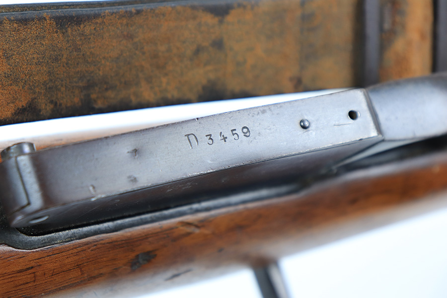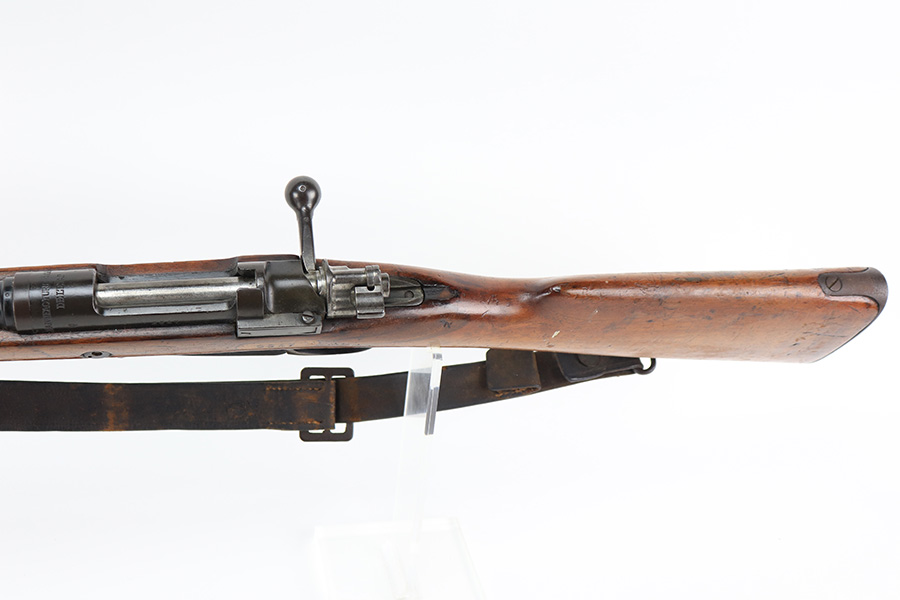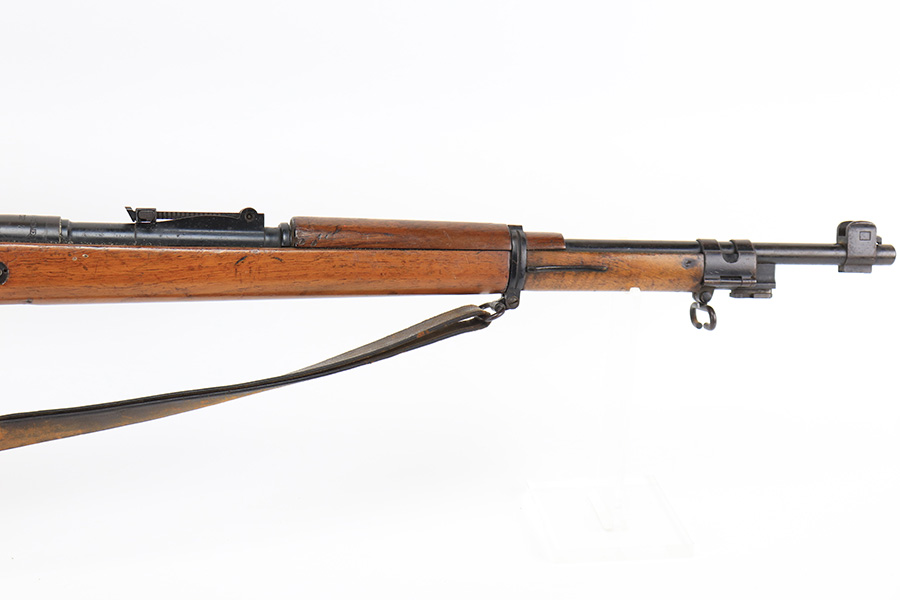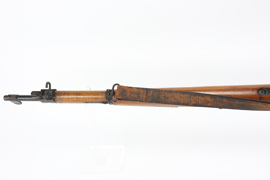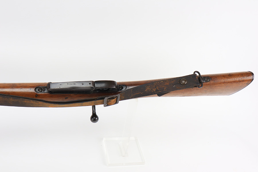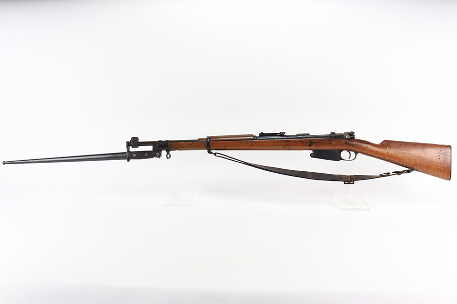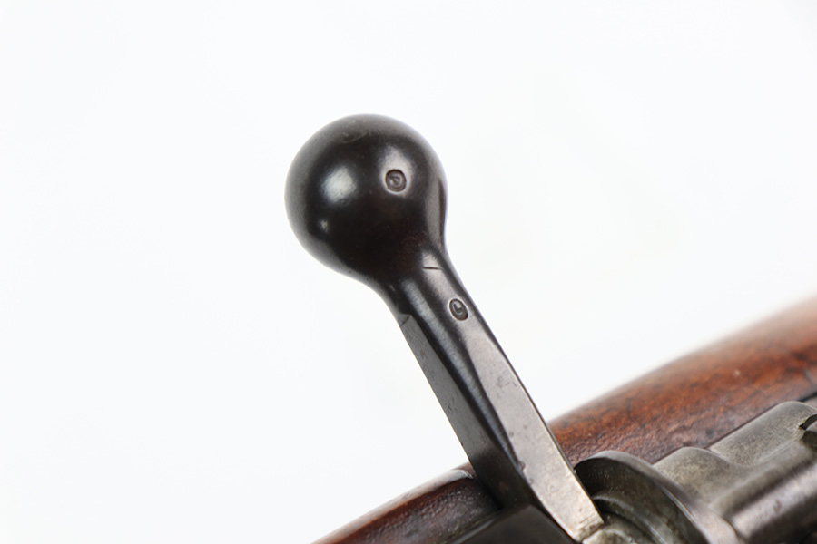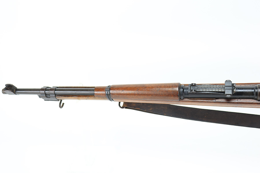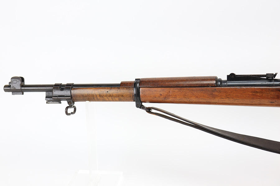 3/31/22 – This is a nice example of a rare Belgian Model 1889/36. Originally manufactured as a Model 1889 rifle, it was subsequently rebuilt just prior to WWII and modified into its current, somewhat more modern configuration. This rifle is chambered for the 7.65x53mm cartridge and had a new 23″ Model 1935 style barrel installed when it was reworked by Manufacture d’Armes de l’Etat. Numerous other modifications to the original rifle were performed during the same rebuild including shortening the front of the stock, installation of new barrel bands & bayo lug, and fitting of a Mauser 98 style bolt sleeve and safety. These rifles saw service with Belgian troops defending their homeland against the invading Nazi’s during WWII and were also in service with Belgian Congolese troops fighting the Germans in North Africa. The barrel and stock (arsenal-renumbered) match the receiver. Bolt assembly, magazine, and butt plate are mismatched. No import marks. The gun comes with a period-correct bayonet, scabbard, and leather sling. There isn’t much actual finish loss, but there is freckling and light spotty oxidation throughout. Tiny dings, scratches, and bruises on the stock throughout. The bore has good rifling with minor pin-pricking in the grooves.