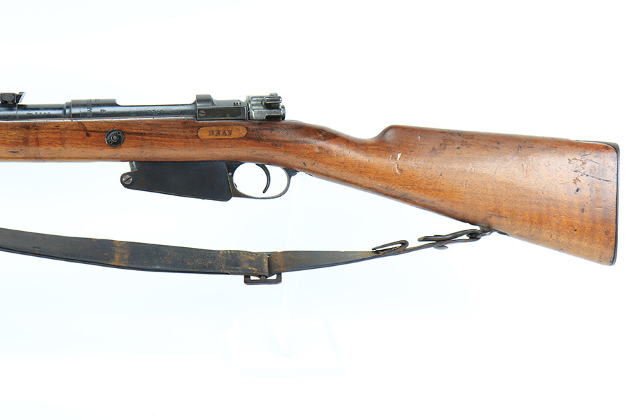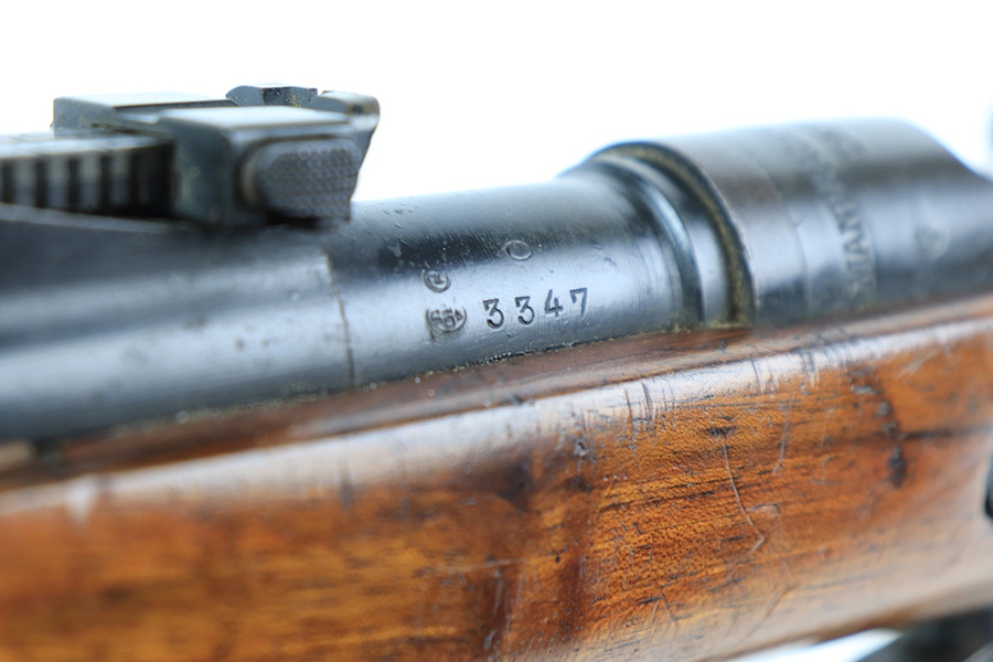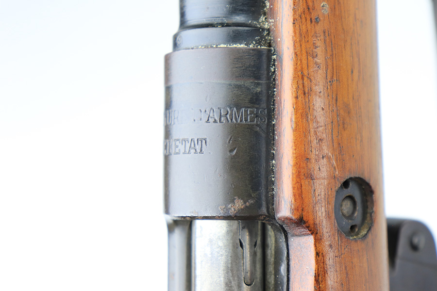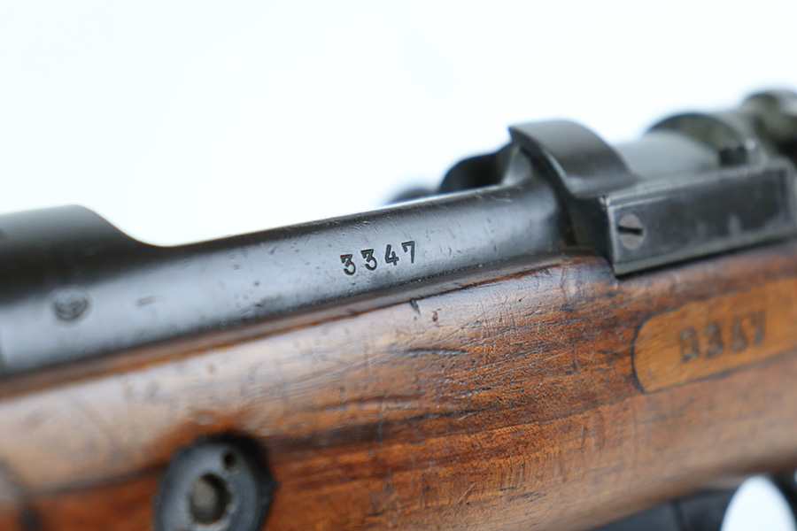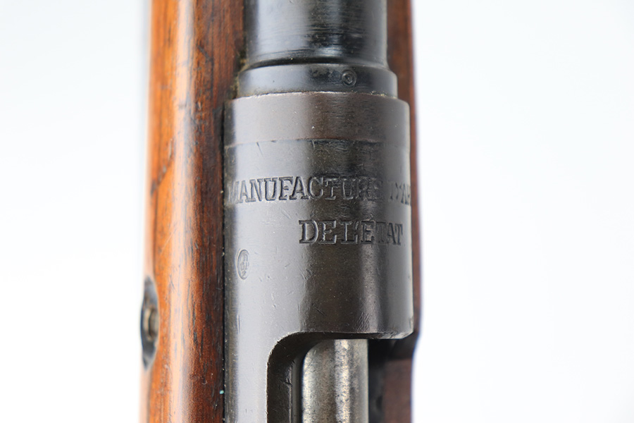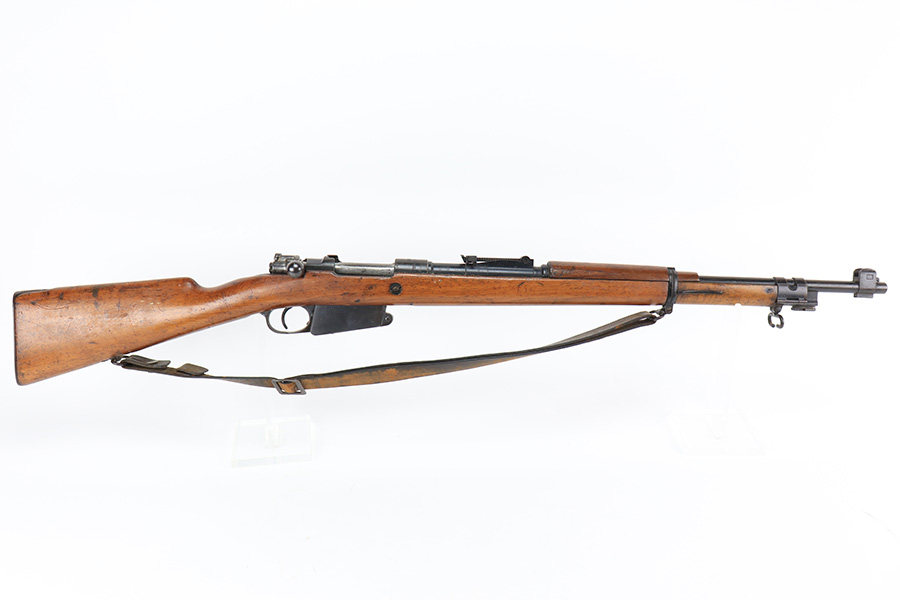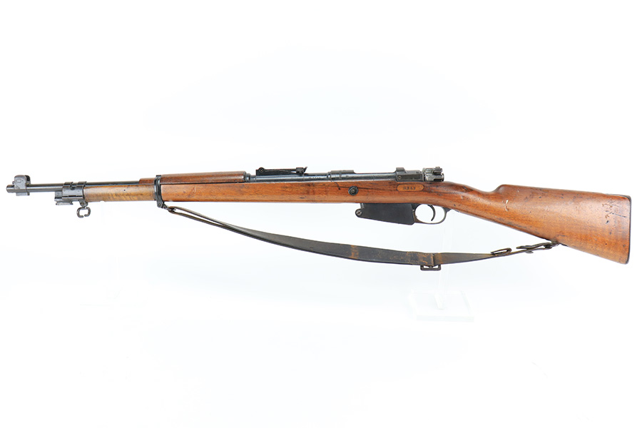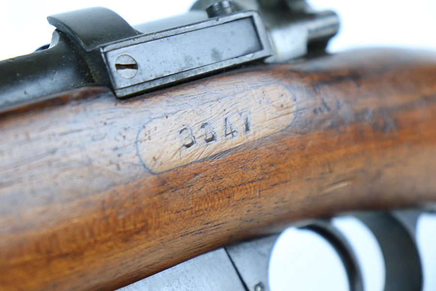 3/31/22 – This is a nice example of a rare Belgian Model 1889/36. Originally manufactured as a Model 1889 rifle, it was subsequently rebuilt just prior to WWII and modified into its current, somewhat more modern configuration. This rifle is chambered for the 7.65x53mm cartridge and had a new 23″ Model 1935 style barrel installed when it was reworked by Manufacture d’Armes de l’Etat. Numerous other modifications to the original rifle were performed during the same rebuild including shortening the front of the stock, installation of new barrel bands & bayo lug, and fitting of a Mauser 98 style bolt sleeve and safety. These rifles saw service with Belgian troops defending their homeland against the invading Nazi’s during WWII and were also in service with Belgian Congolese troops fighting the Germans in North Africa. The barrel and stock (arsenal-renumbered) match the receiver. Bolt assembly, magazine, and butt plate are mismatched. No import marks. The gun comes with a period-correct bayonet, scabbard, and leather sling. There isn’t much actual finish loss, but there is freckling and light spotty oxidation throughout. Tiny dings, scratches, and bruises on the stock throughout. The bore has good rifling with minor pin-pricking in the grooves.