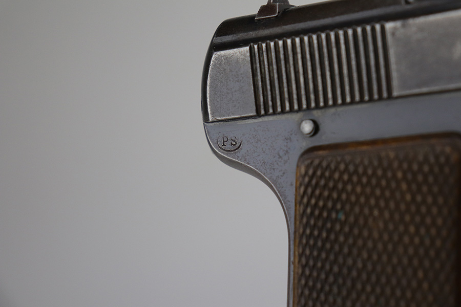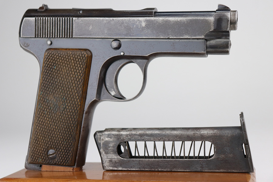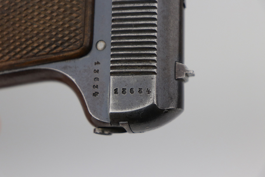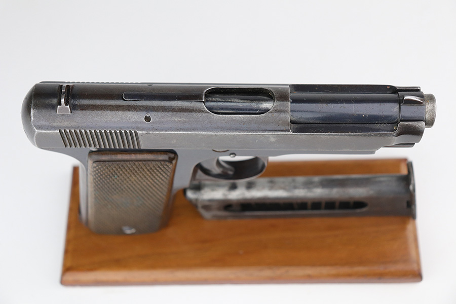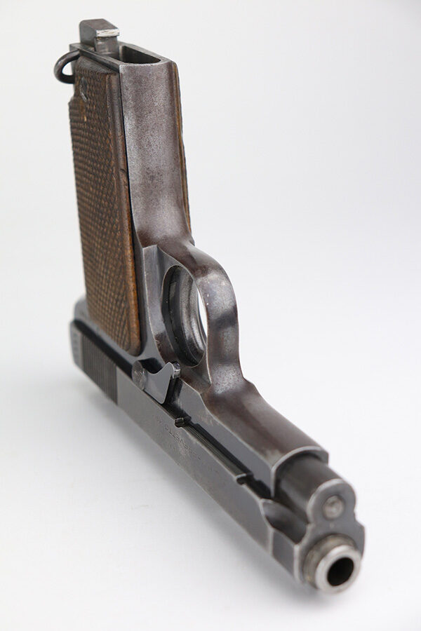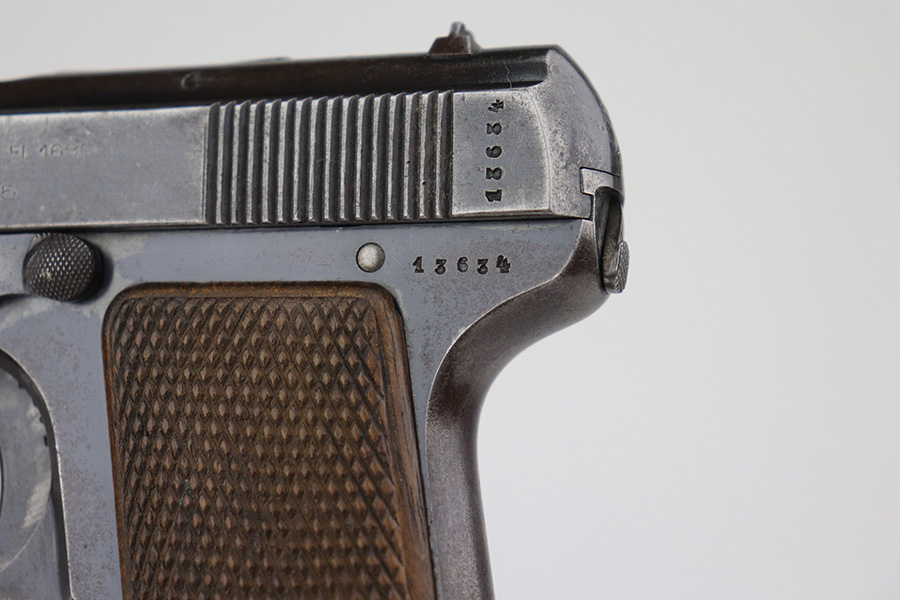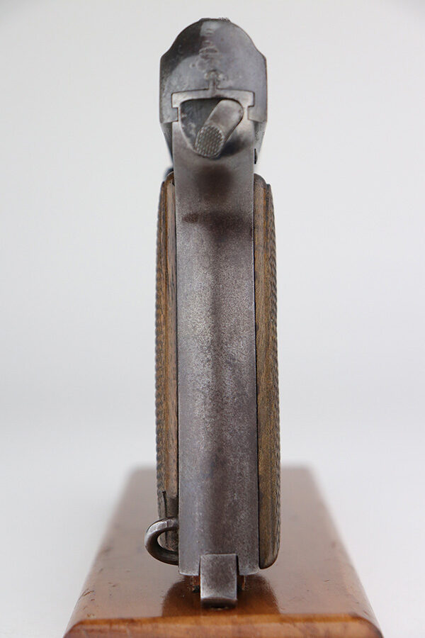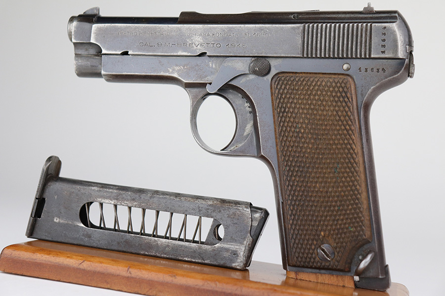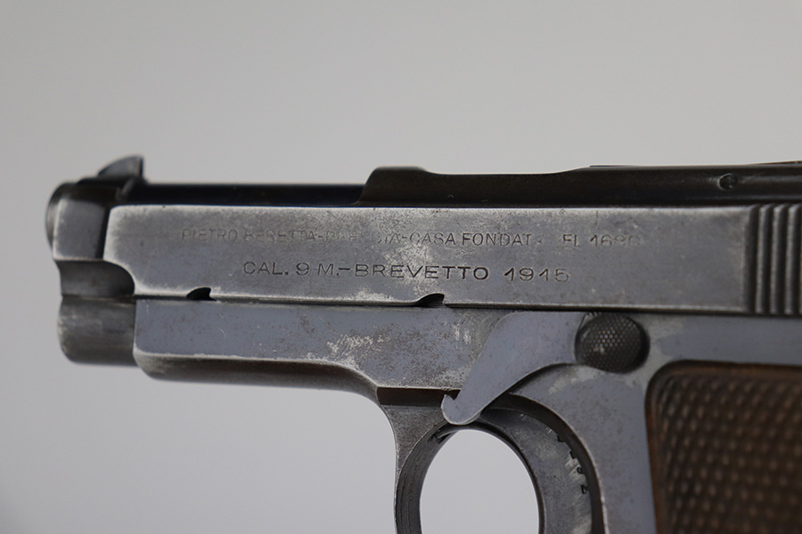 9/16/21 – This is a nice example of a Rare Beretta Model 1915, Beretta’s first semi-auto pistol. The Model 1915 came about when Beretta experienced a downturn in shotgun sales and sought to develop new products. Realizing the shortcomings of the then standard Italian military sidearm, the Glisenti 1910, Beretta set about designing a simpler and more robust pistol to sell to the Italian government. The Model 1915 was chambered for the 9mm Glisenti cartridge but was a simpler blow-back operated design than the Glisenti pistol. The Model 1915 has a number of unique features, some that are familiar even today. This one is all matching and was likely issued to the Royal Italian Army during WWI. They only made about 16,000 of these guns. It has retained roughly 60% of its original finish. Most of the finish loss is on the straps, but there is also wear on the high edges in general. Spotty wear on both sides of the slide. Spotty oxidation and patina throughout. Comes with excellent original wood grips and a period-correct magazine. The bore has decent rifling with spotty oxidation throughout. The safety lever is a little loose and does not hold the slide back on its own.