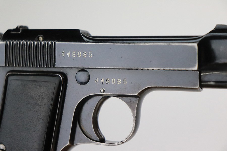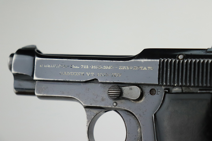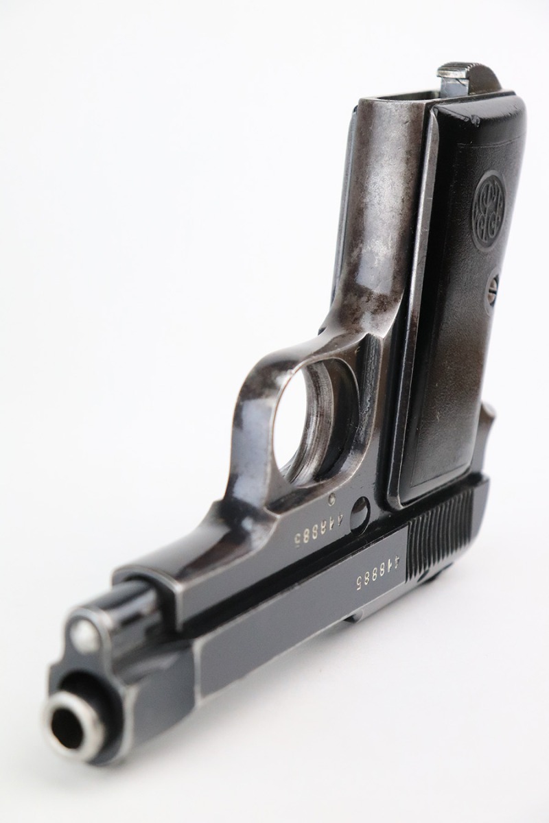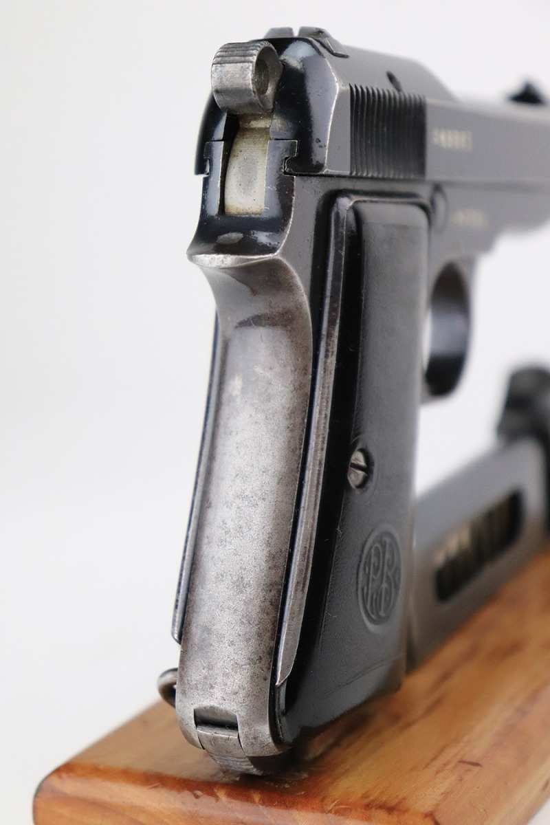 6/9/22 – This is a rare Beretta M1935 that was made in 1936 and issued to the Royal Italian Air Force. One of 8,000 produced, it is a first version example with the early inspector marks (TP). It has retained roughly 65% of its original high polish finish. The majority of the finish loss is on the grip straps, where there is also pin-pricking and spotty oxidation. Minor wear around the muzzle and high edges in general. Small spots of discoloration on both sides of the frame, most noticeable on the left side. Comes with nice period-correct black bakelite grips and a proper magazine. The rifling in the bore is worn with noticeable pitting throughout.