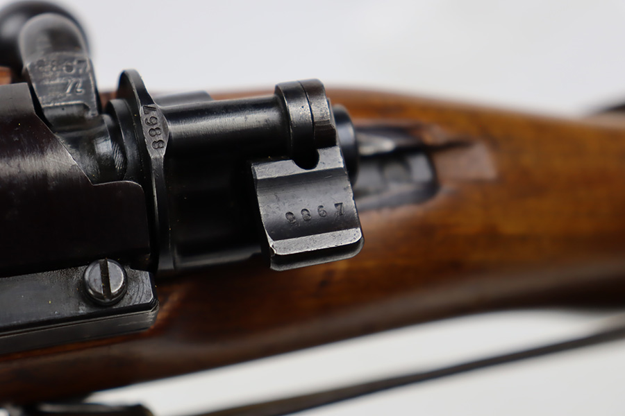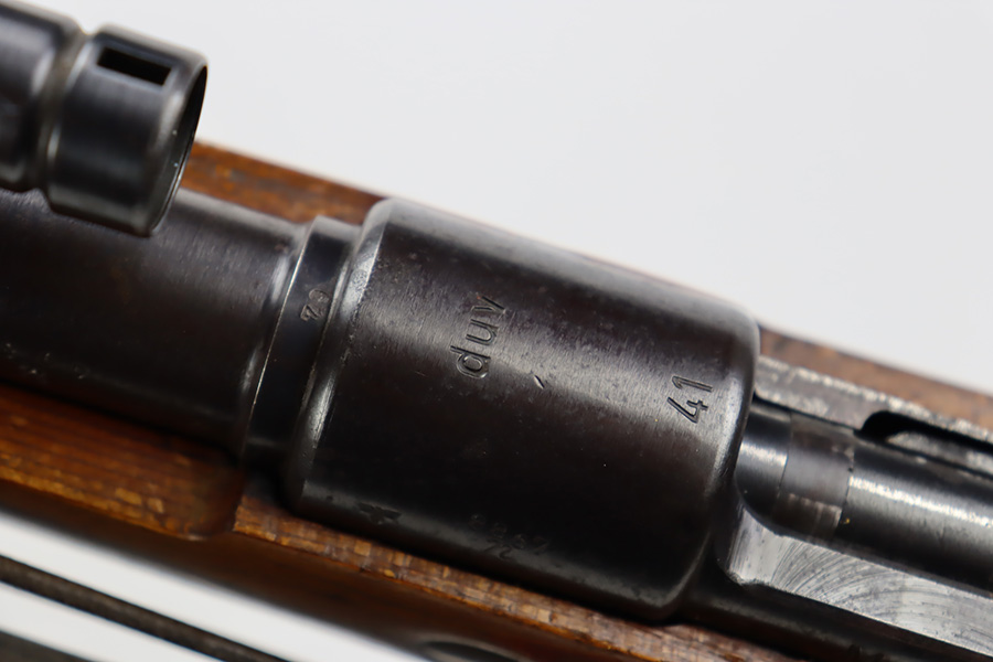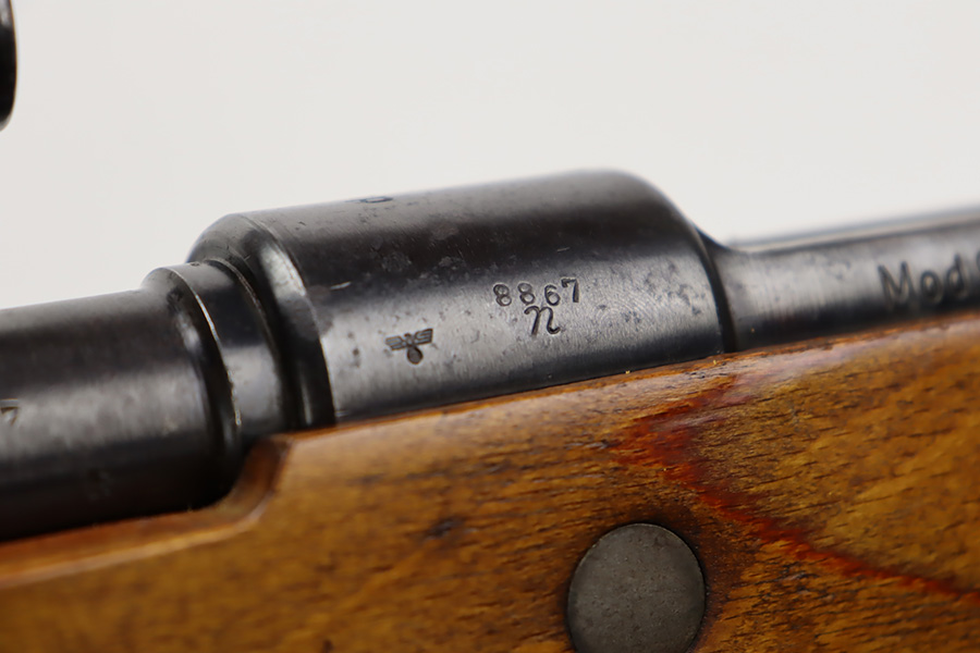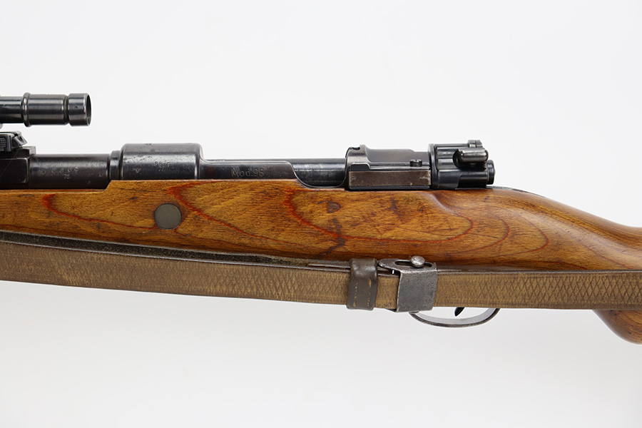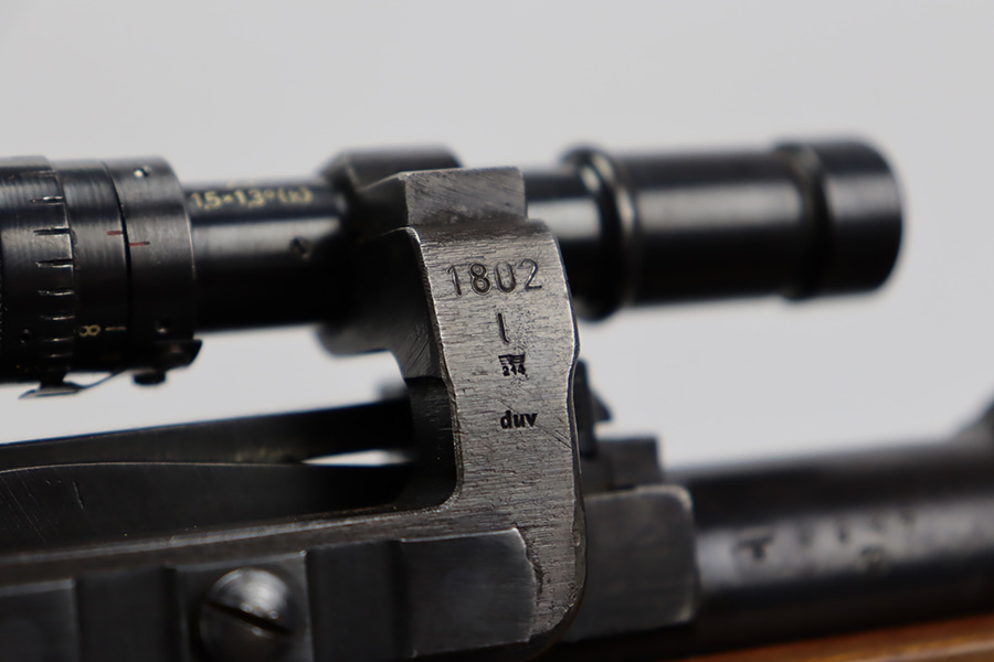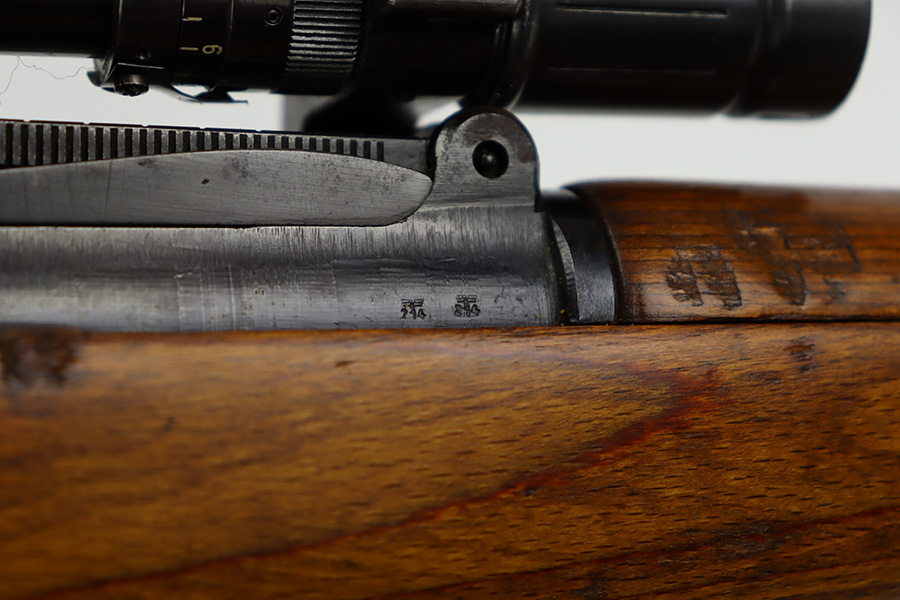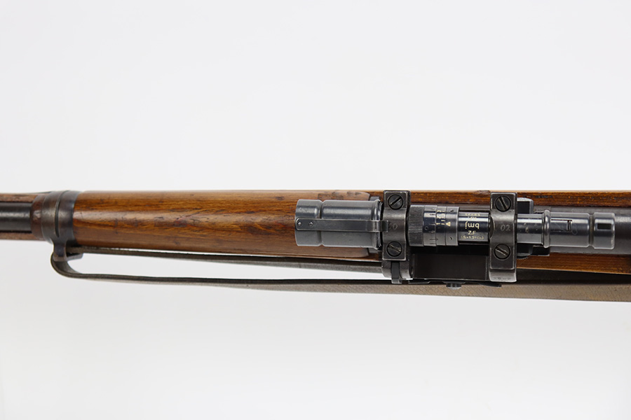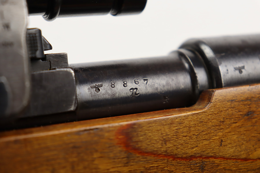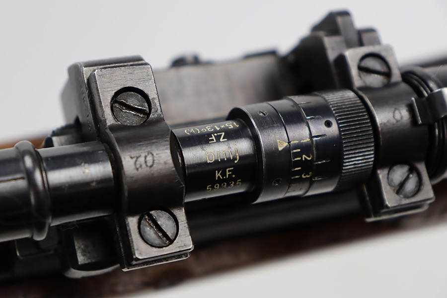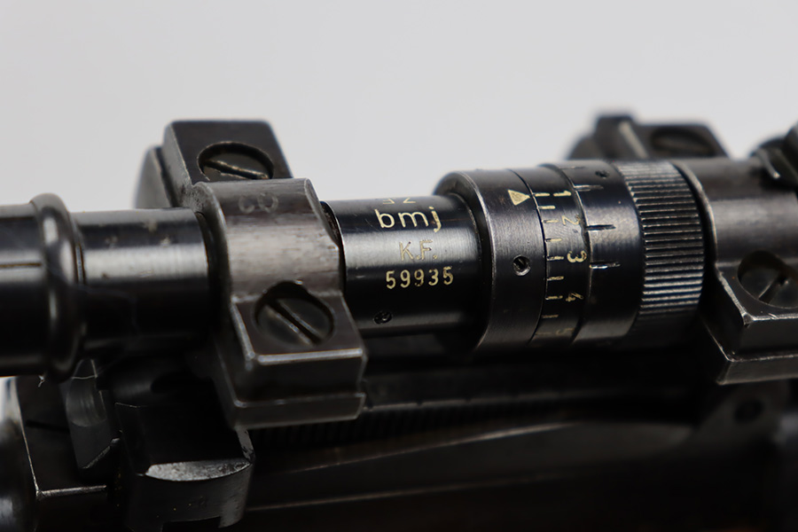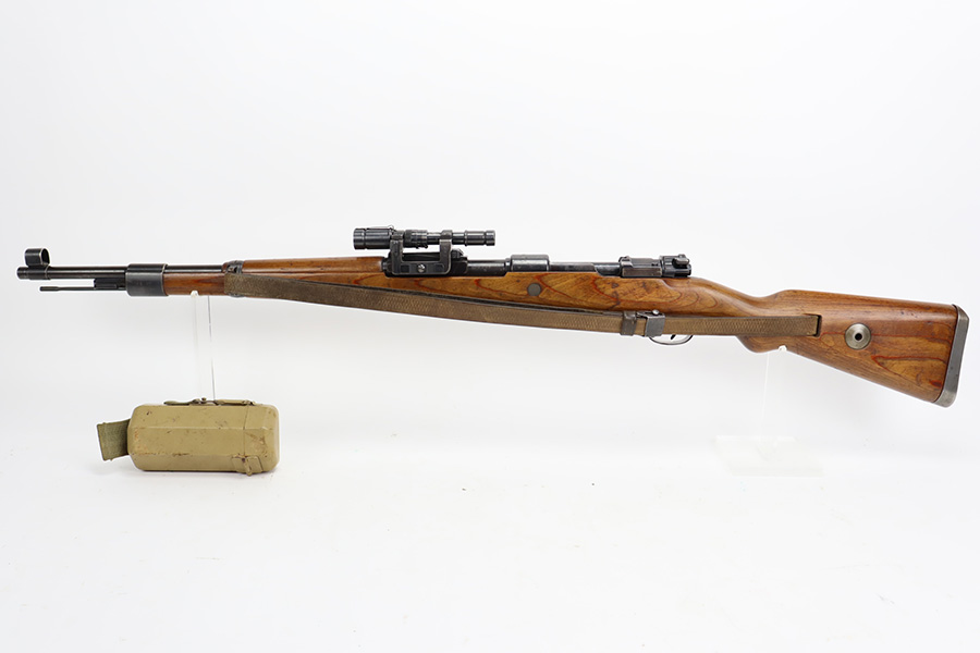 10/12/23 – This is a rare, early Berlin-Lubecker Z.F.41 K98 sniper rifle from 1941. The rifle is mostly matching, with only mismatched barrel bands (they match each other). Matching numbers on the bolt, stock, receiver, barrel, bolt release, floorplate, follower, etc. The stock is likely force matched though as it does not have the correct waffenamt. The screws in the trigger group are matching to each other but mismatched to the stock. The bluing on the rifle is very nice overall with minor oxidation on the receiver, and thinning on the trigger group. The stock has been lightly sanded, but waffenamts and serial are still visible. It has various dings and minor chips but no cracks. The rifle features the early flat roller mount with correct ‘duv’ scope mount. The scope is marked ‘Z.F’ with a ‘bmj’ maker mark. Scope is in good condition with slightly cloudy optics. The listing also includes a sling, cleaning rod and sight hood, as well as a scarce scope can.