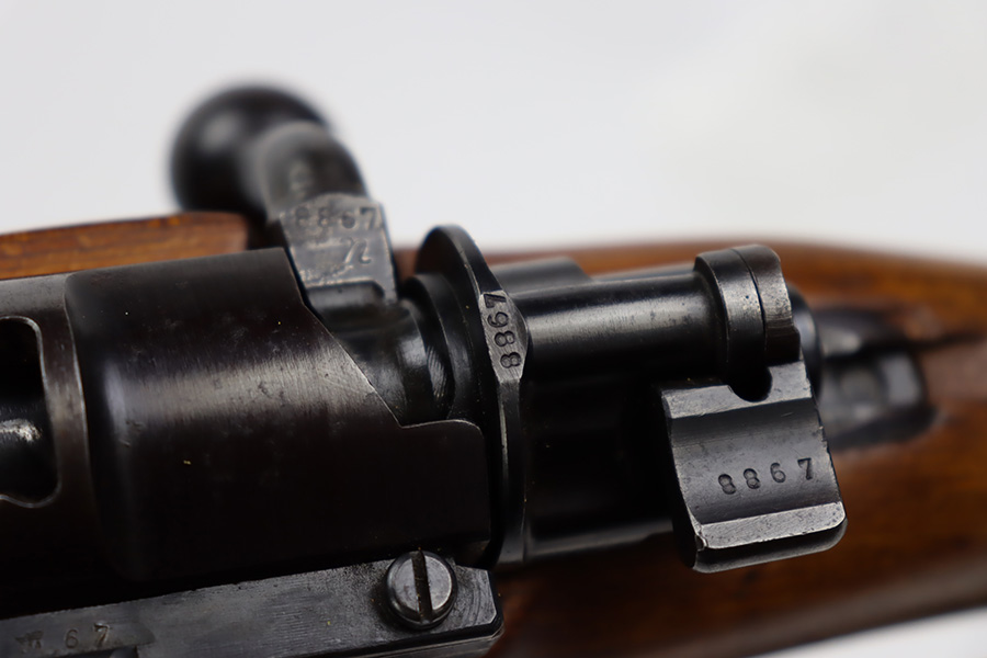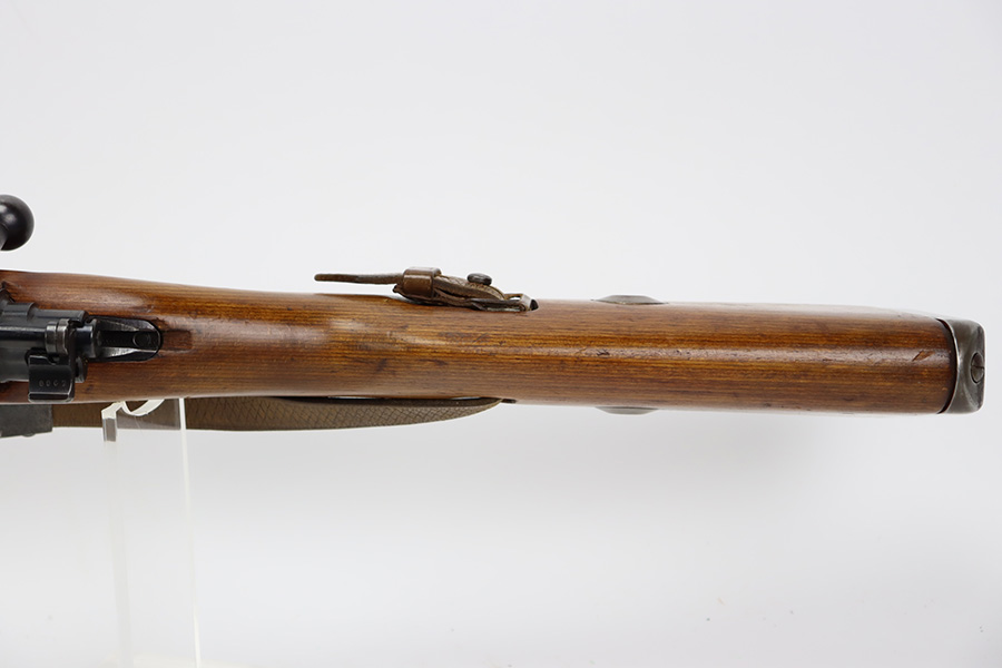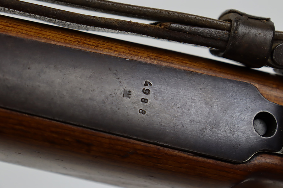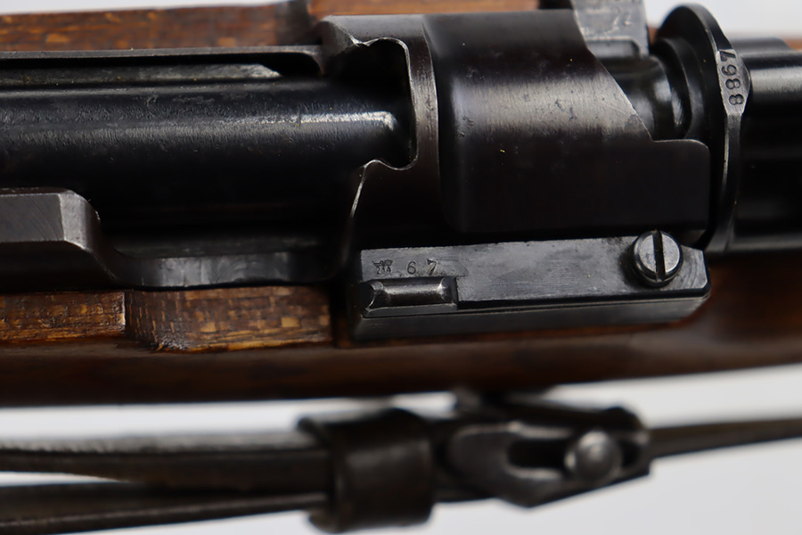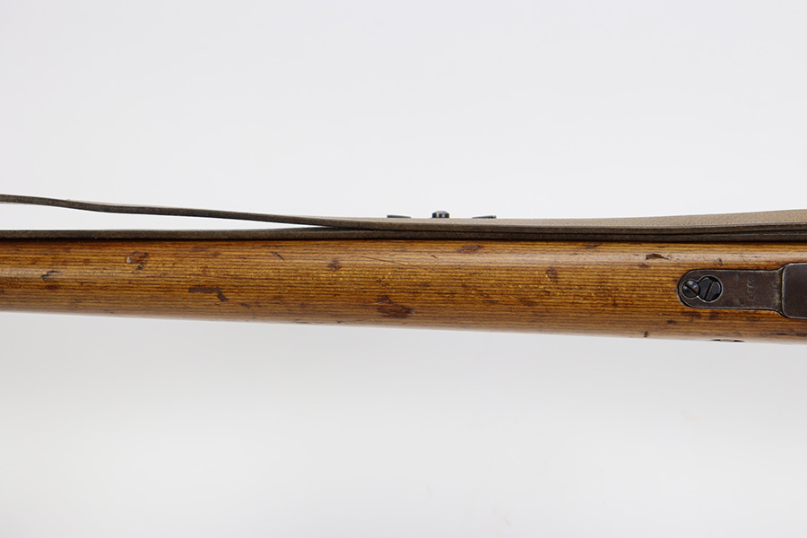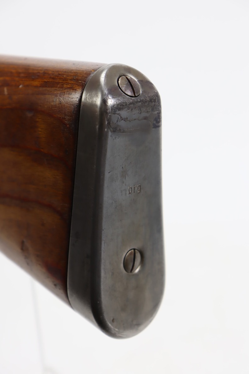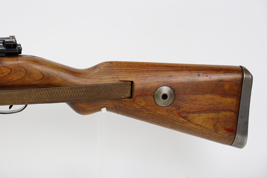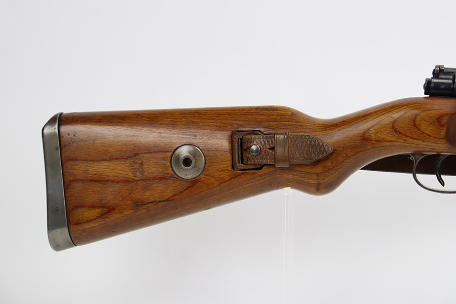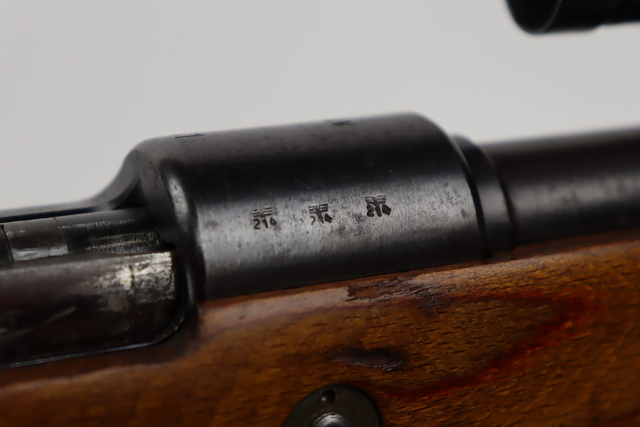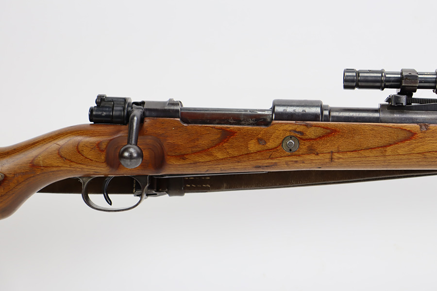 10/12/23 – This is a rare, early Berlin-Lubecker Z.F.41 K98 sniper rifle from 1941. The rifle is mostly matching, with only mismatched barrel bands (they match each other). Matching numbers on the bolt, stock, receiver, barrel, bolt release, floorplate, follower, etc. The stock is likely force matched though as it does not have the correct waffenamt. The screws in the trigger group are matching to each other but mismatched to the stock. The bluing on the rifle is very nice overall with minor oxidation on the receiver, and thinning on the trigger group. The stock has been lightly sanded, but waffenamts and serial are still visible. It has various dings and minor chips but no cracks. The rifle features the early flat roller mount with correct ‘duv’ scope mount. The scope is marked ‘Z.F’ with a ‘bmj’ maker mark. Scope is in good condition with slightly cloudy optics. The listing also includes a sling, cleaning rod and sight hood, as well as a scarce scope can.