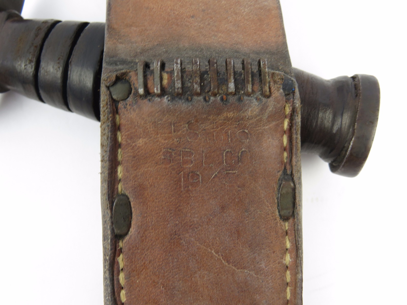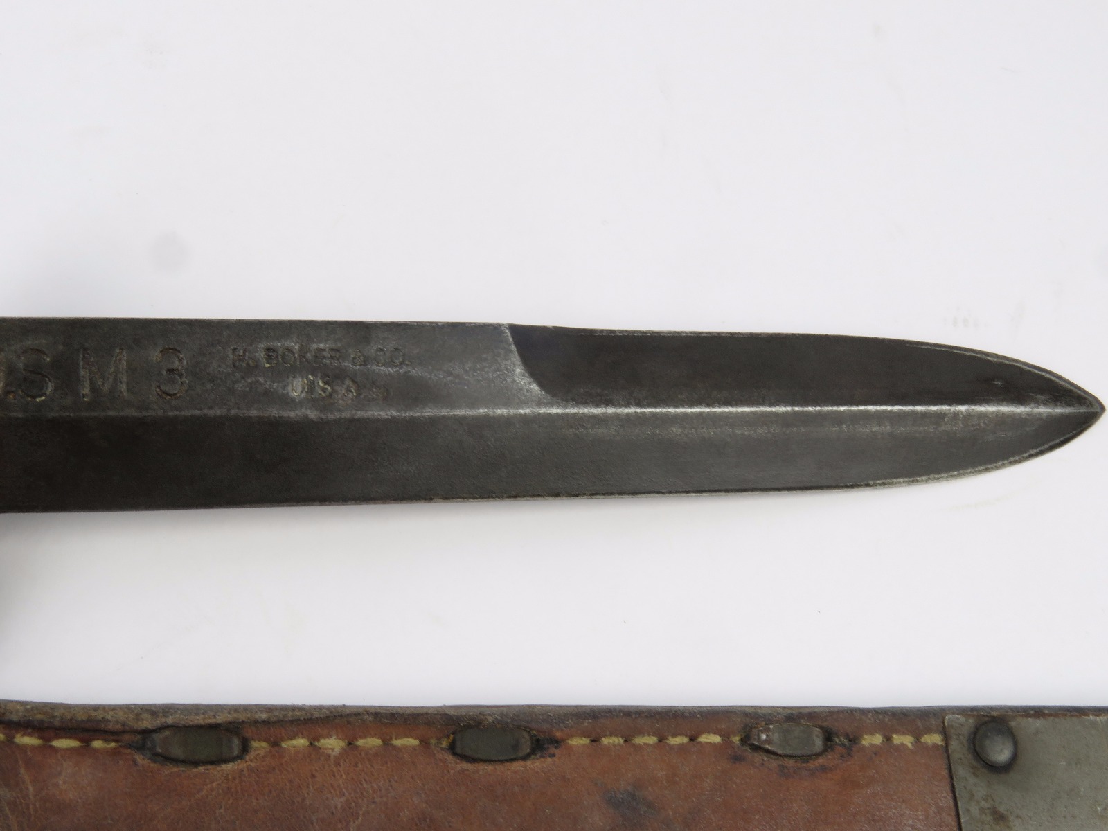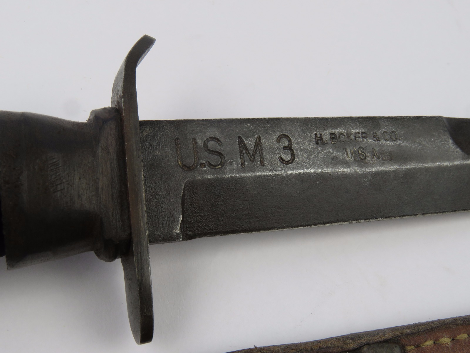 10/9/17 – This is an original 1943 production USM3 Fighting Knife made by Boker. Boker produced the least amount of M3 fighting knives during WW2, making these blades the most scarce and desirable variation of M3 fighting knives. The blade is maker stamped and blued, but has some wear throughout. The wear is mostly oil staining which results in some dark spots and staining throughout. The edge appears to have been honed or lightly sharpened and used. Comes with an original leather M6 scabbard made by “SBL Co” which is one of the most scarce scabbard makers! The scabbard, similar to the blade, has normal wear throughout. No major issues though and completely in tact. Guaranteed original and authentic!