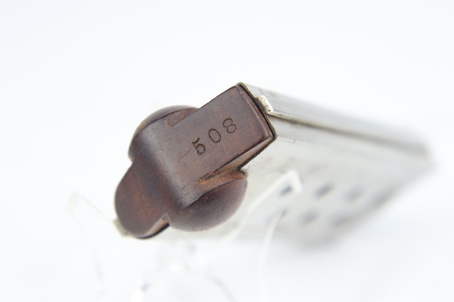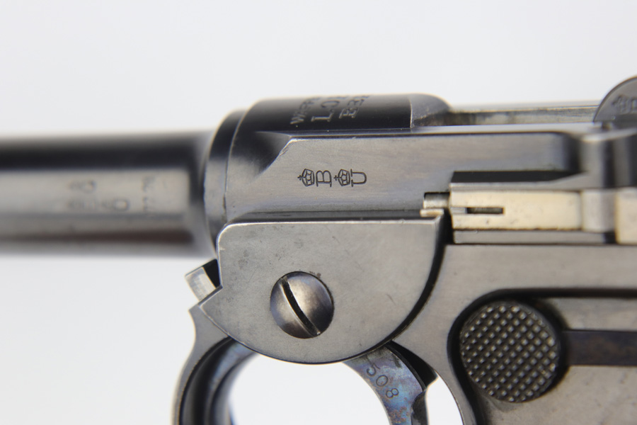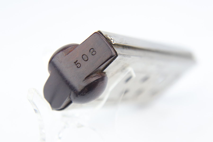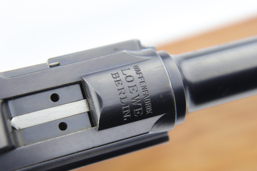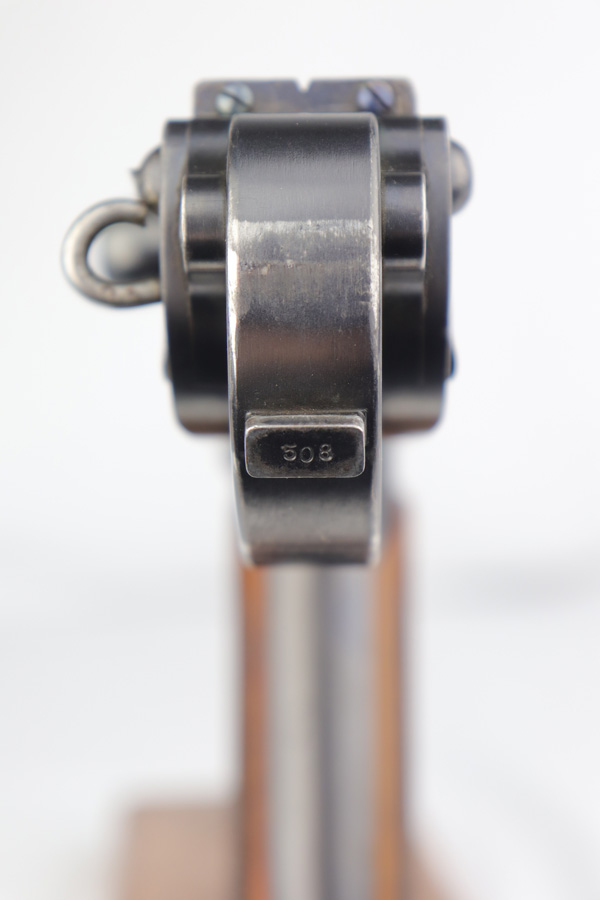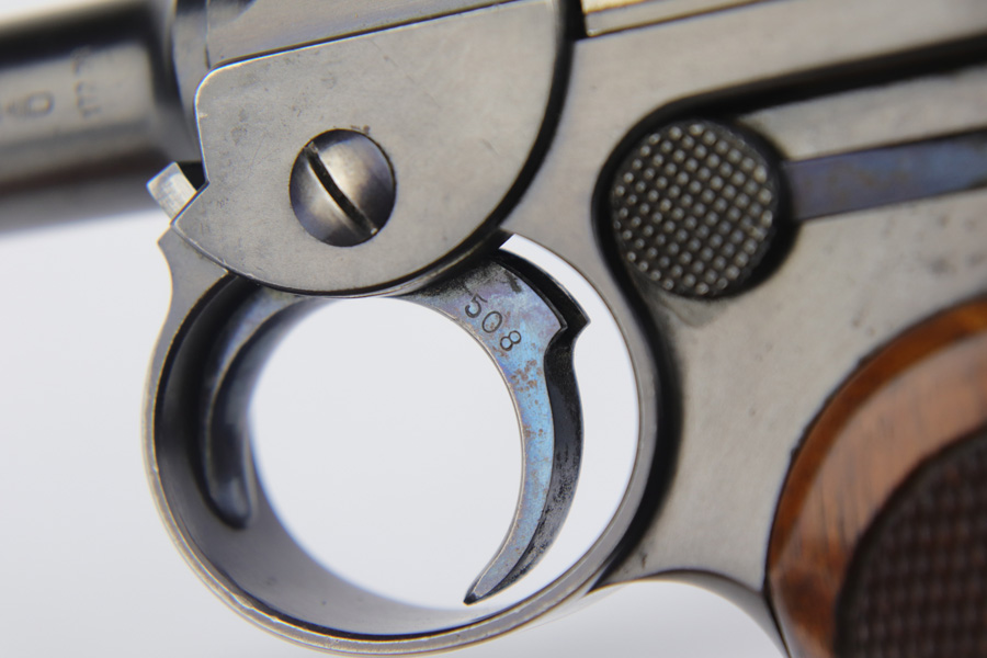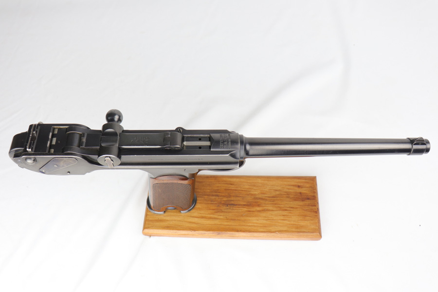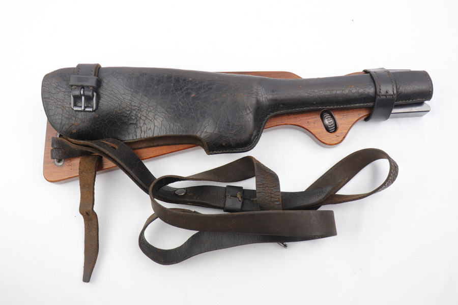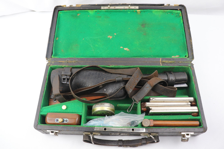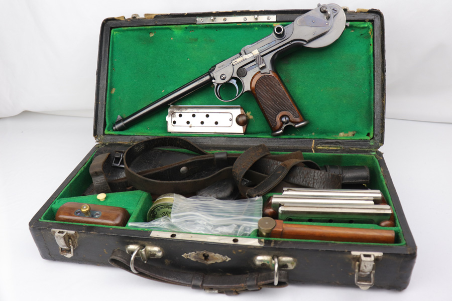 12/18/18 – This is a rare and gorgeous Borchardt luger, or C-93, with original case and extras. The original bluing rates at 96-97%, with minor edge and muzzle wear, and some finish loss where the stock attaches. The included accessories: four magazines that match the pistol, the wooden shoulder stock, cheekpiece, leather holster, screwdriver with extra bits, takedown wrench and pin-punches, brass cleaning rod, and oiler, which are all contained in a Borchardt black leather bound carrying case. The stock and the cheek pad are also matching numbered to the gun. The case is in very good condition, while the holster shows age but has held together quite nicely. Bore shows some use, which is actually highlighted in a signed letter from the previous owner, whose family has had this assembly for many decades.