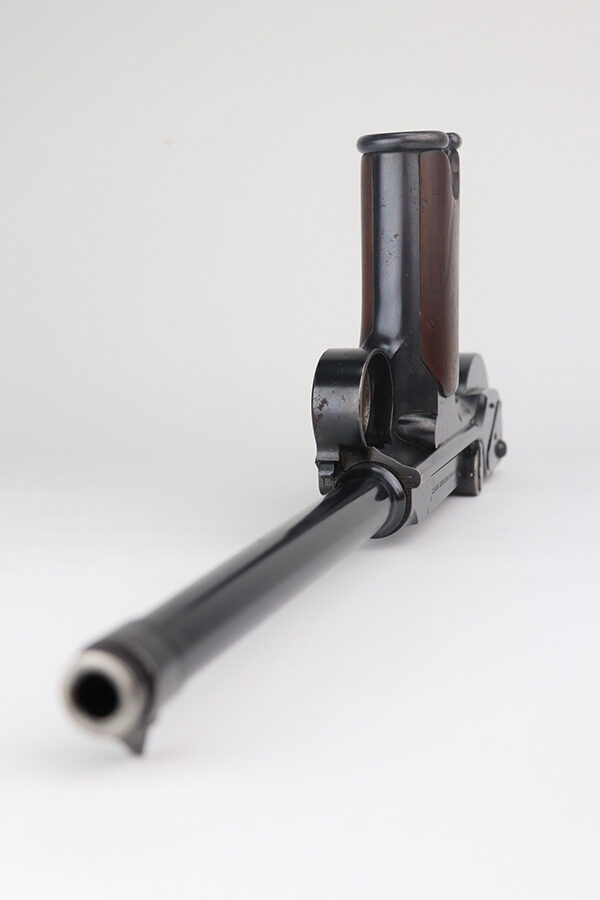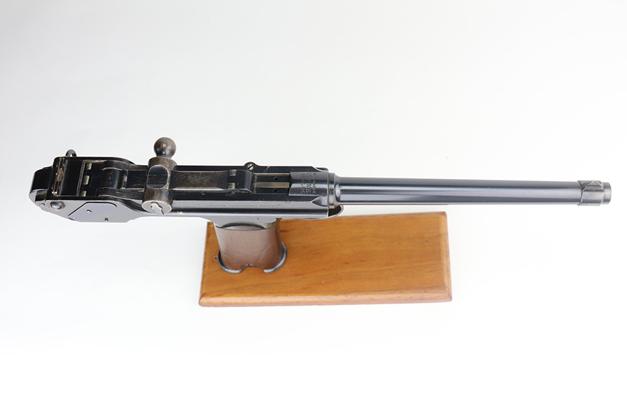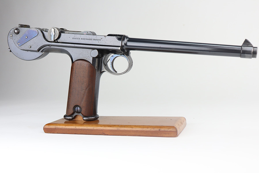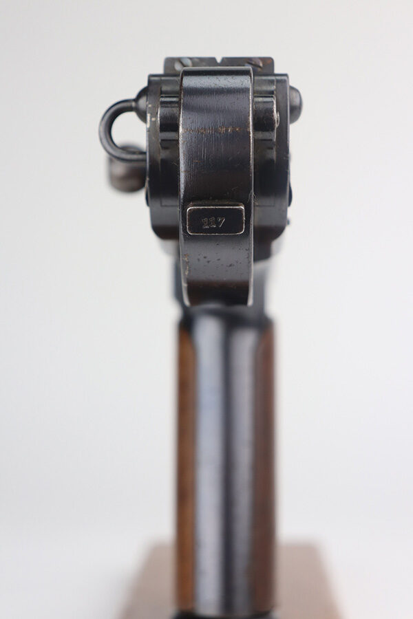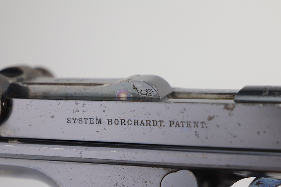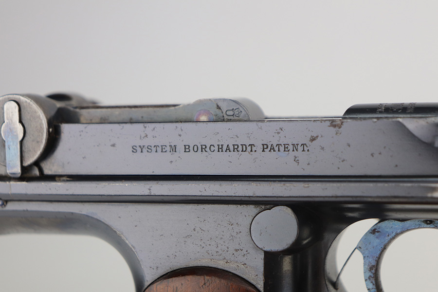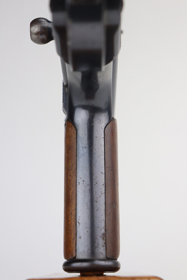 6/3/21 – This is an excellent example of the very rare and iconic Borchardt C-93 as manufactured by Loewe & Company of Berlin. The Borchardt pistol employed the unique toggling breech mechanism which was eventually adopted and refined by George Luger and was used for the production of the Luger P.08 pistol. It’s one of only 1,100 manufactured, and presumably only a couple dozen such examples still exist in such condition. It’s all matching and original, including the magazine. There is minimal bluing loss, with nearly all of it on the toggle mechanism. There is minor surface oxidation in several other areas though. Bore is shiny with pronounced rifling but there is some frost and freckling in the grooves. The only part we are unsure on is the slab style grips, as we haven’t seen other examples with this style (others were checkered). These grips are properly machined with several appropriate cutouts to fit the frame design of the C-93, so it’s possible they are original but we can’t say for certain. NOTE: A helpful customer has shown us another example of these grips on a pistol only 20 serial numbers off from this one, so we now believe they are period original and a rare variation.