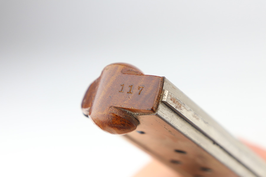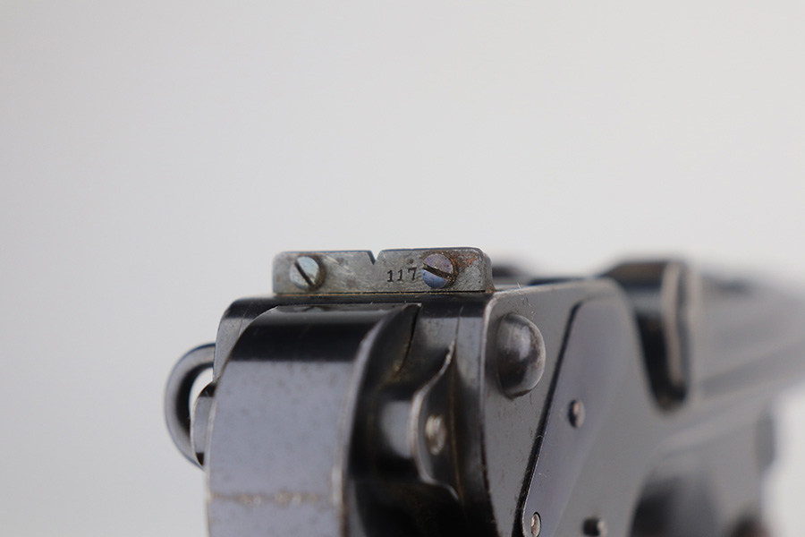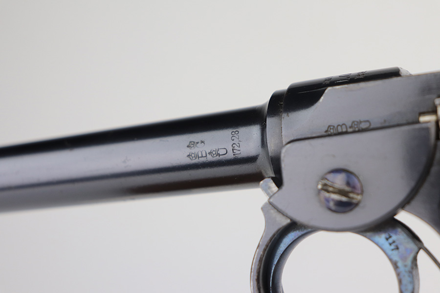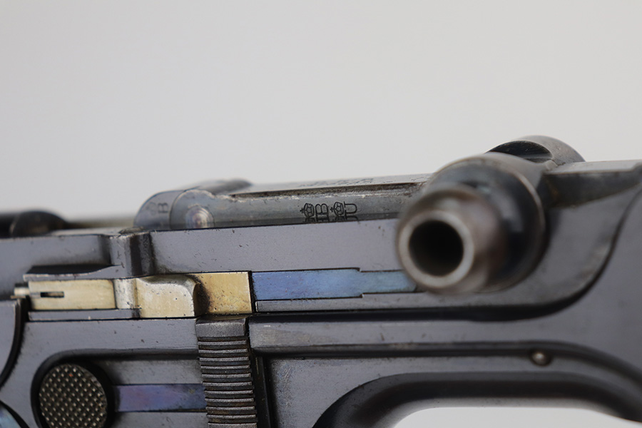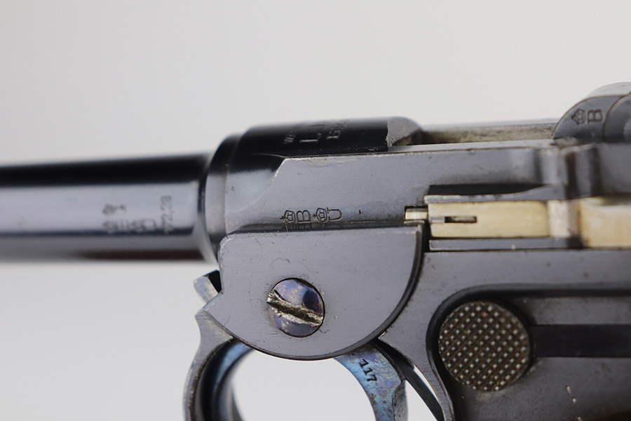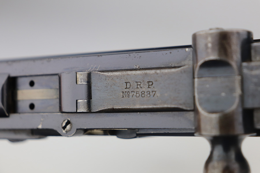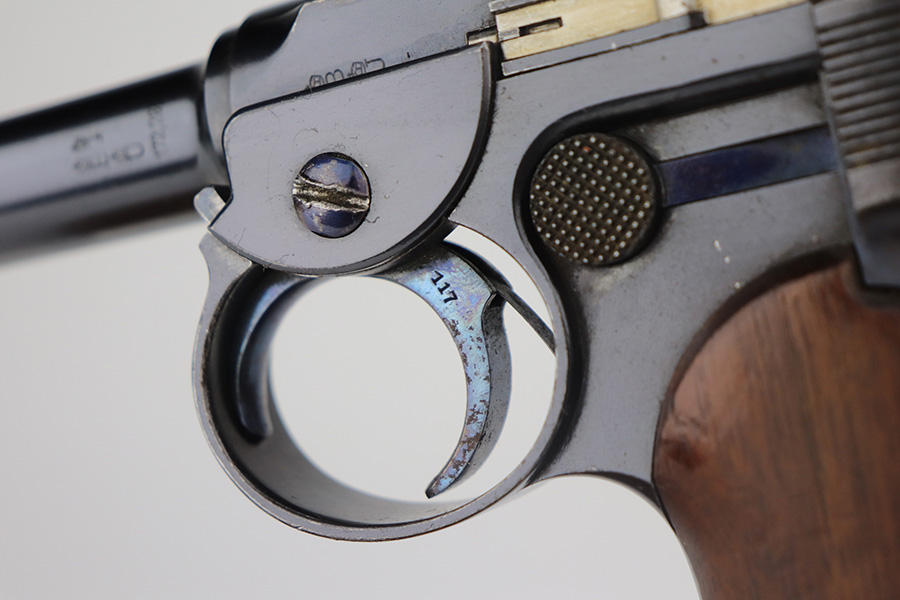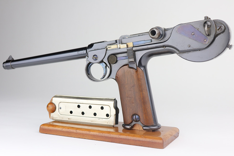 6/3/21 – This is an excellent example of the very rare and iconic Borchardt C-93 as manufactured by Loewe & Company of Berlin. The Borchardt pistol employed the unique toggling breech mechanism which was eventually adopted and refined by George Luger and was used for the production of the Luger P.08 pistol. It’s one of only 1,100 manufactured, and presumably only a couple dozen such examples still exist in such condition. It’s all matching and original, including the magazine. There is minimal bluing loss, with nearly all of it on the toggle mechanism. There is minor surface oxidation in several other areas though. Bore is shiny with pronounced rifling but there is some frost and freckling in the grooves. The only part we are unsure on is the slab style grips, as we haven’t seen other examples with this style (others were checkered). These grips are properly machined with several appropriate cutouts to fit the frame design of the C-93, so it’s possible they are original but we can’t say for certain. NOTE: A helpful customer has shown us another example of these grips on a pistol only 20 serial numbers off from this one, so we now believe they are period original and a rare variation.