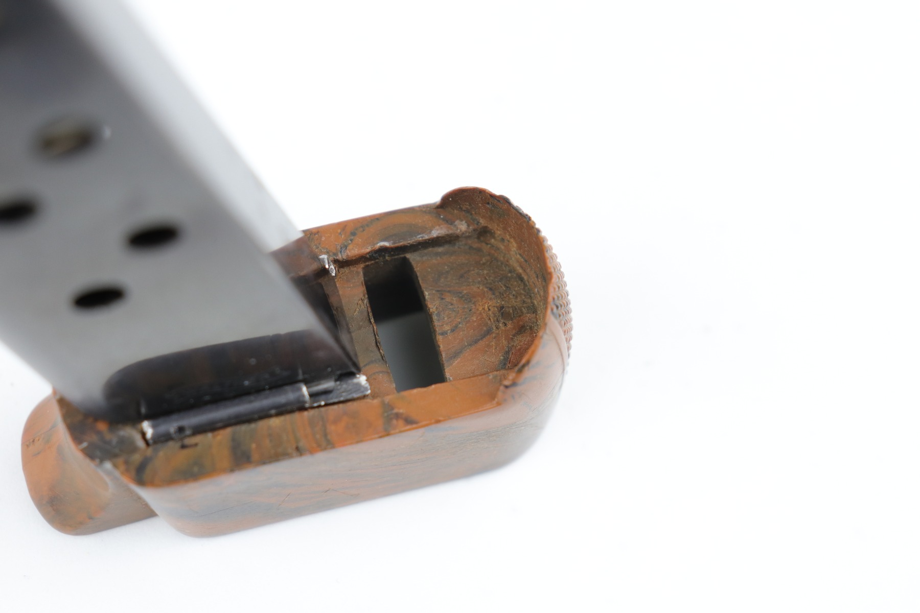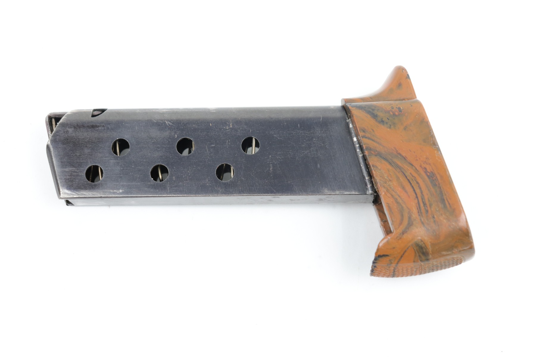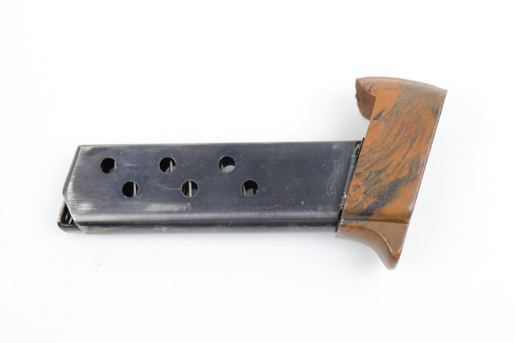 5/20/20 – This is a fairly rare, extended bottom PPK magazine, made in the 1930’s. This bakelite bottom does not extend the capacity of the magazine but adds to the holding comfort of the gun by adding about and inch to the grip portion of the gun. The magazine itself is an original pre-WW2 Walther banner-only mag. It would go nicely with any commercial Walther PPK made betwen 1930 and 1940. 7.65 or 32 caliber. The metal has original high polish blue finish and the bottom piece is without any major cracks or chips. There is a slight cracking on the spine of the mag from age. This is typical. See photo.