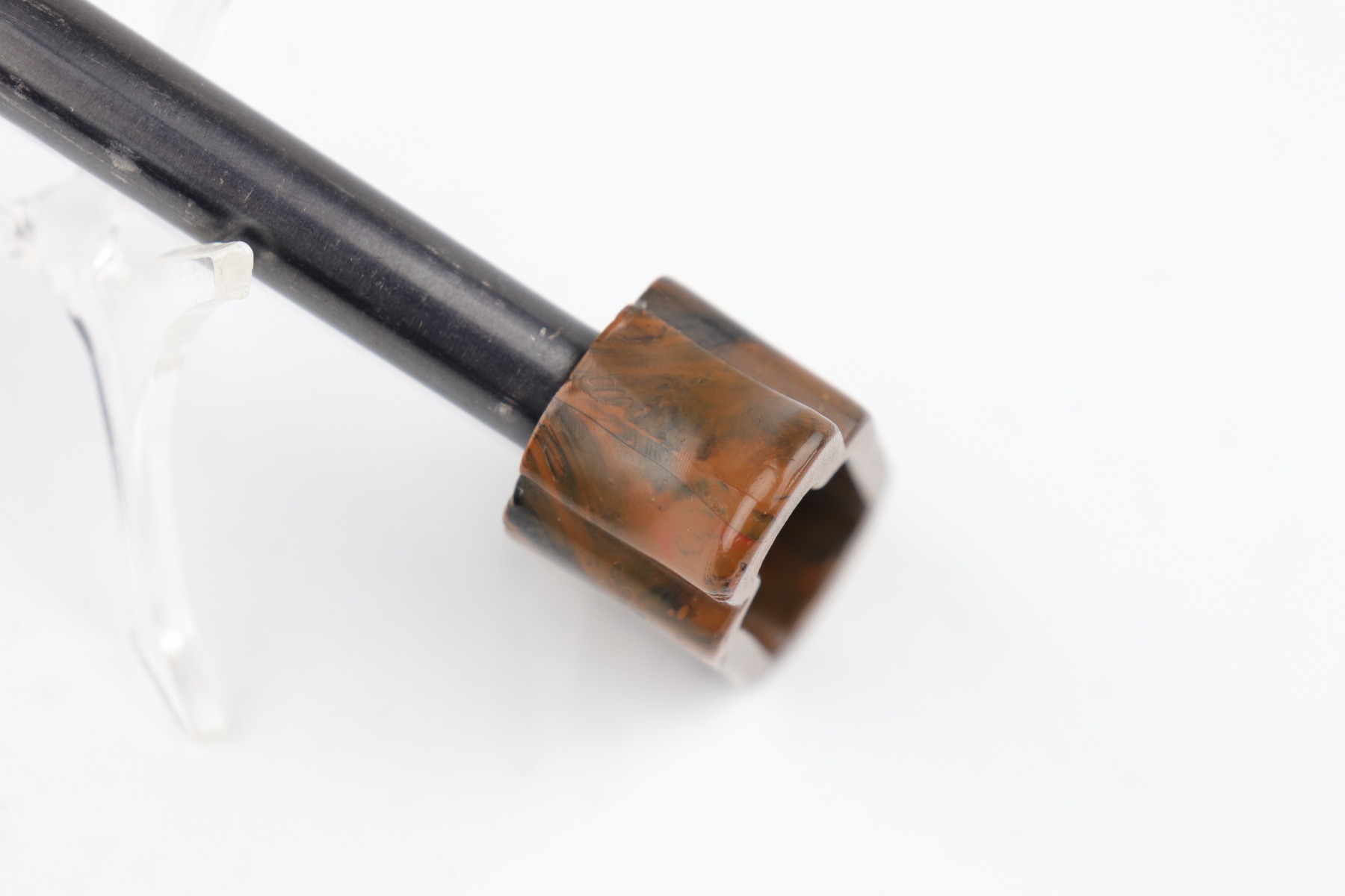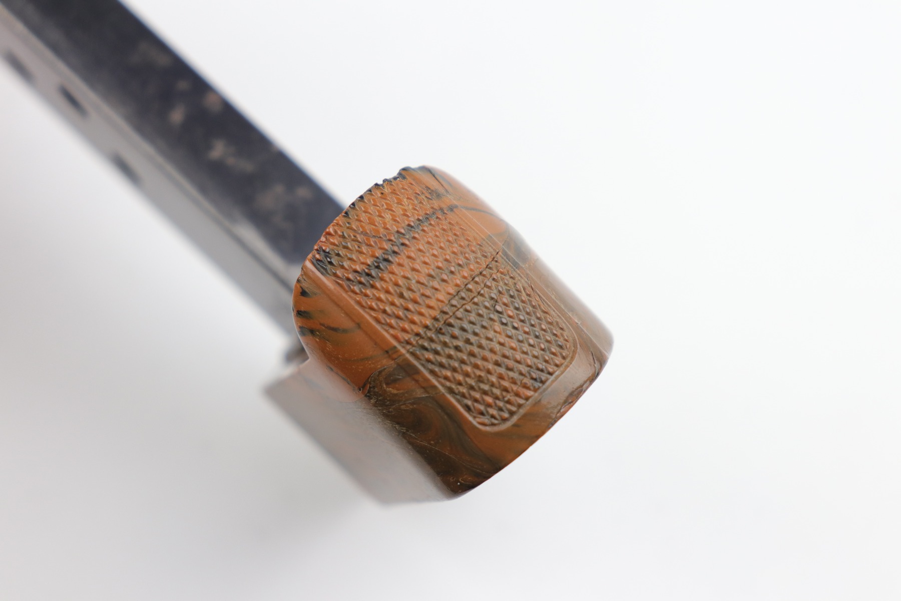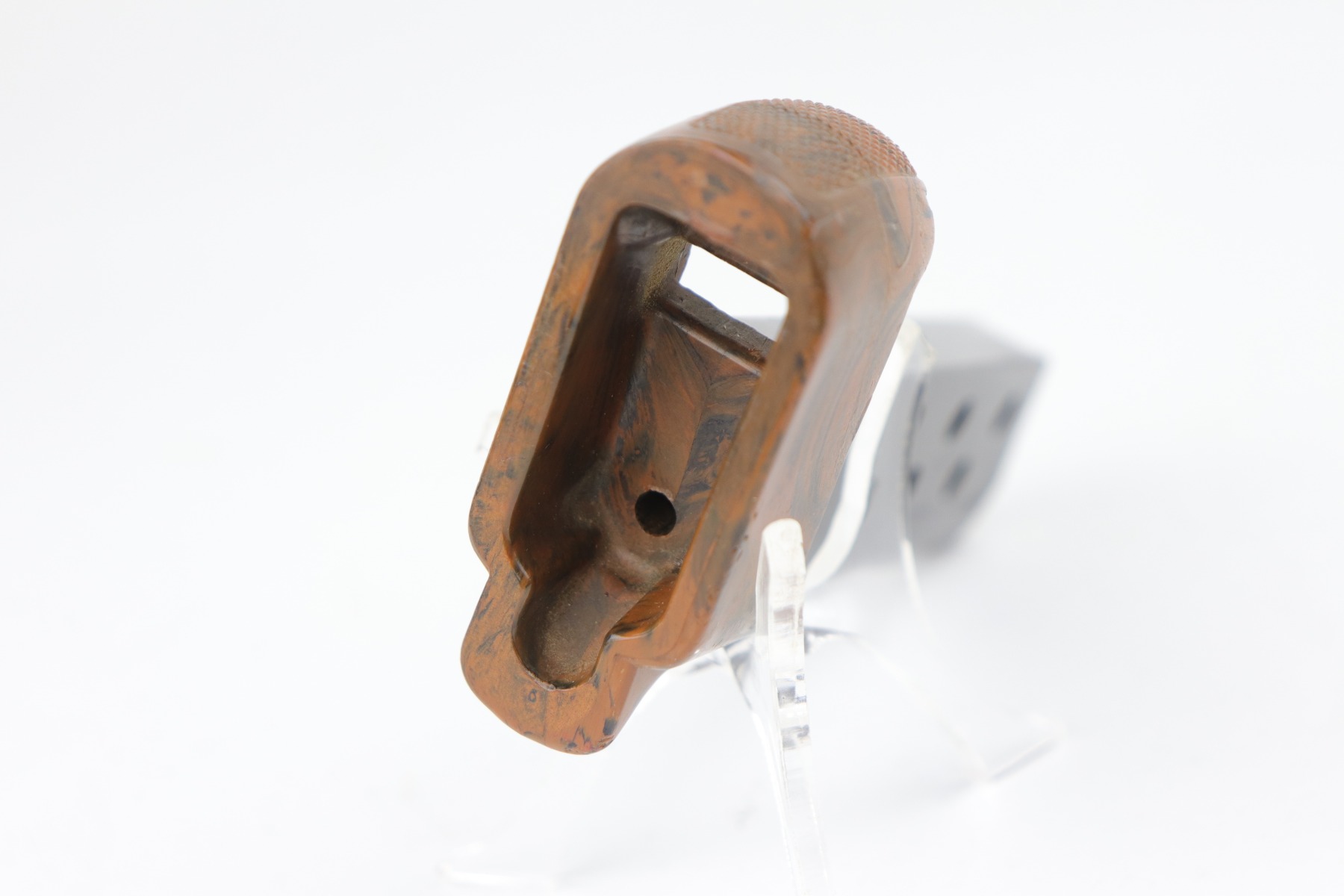5/20/20 – This is a fairly rare, extended bottom PPK magazine, made in the 1930’s. This bakelite bottom does not extend the capacity of the magazine but adds to the holding comfort of the gun by adding about and inch to the grip portion of the gun. The magazine itself is an original pre-WW2 Walther banner-only mag. It would go nicely with any commercial Walther PPK made betwen 1930 and 1940. 7.65 or 32 caliber. The metal has original high polish blue finish and the bottom piece is without any major cracks or chips. There is a slight cracking on the spine of the mag from age. This is typical. See photo.