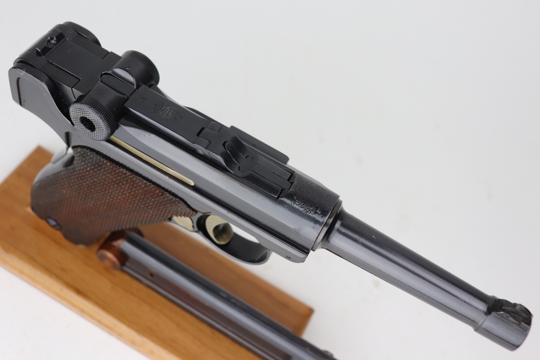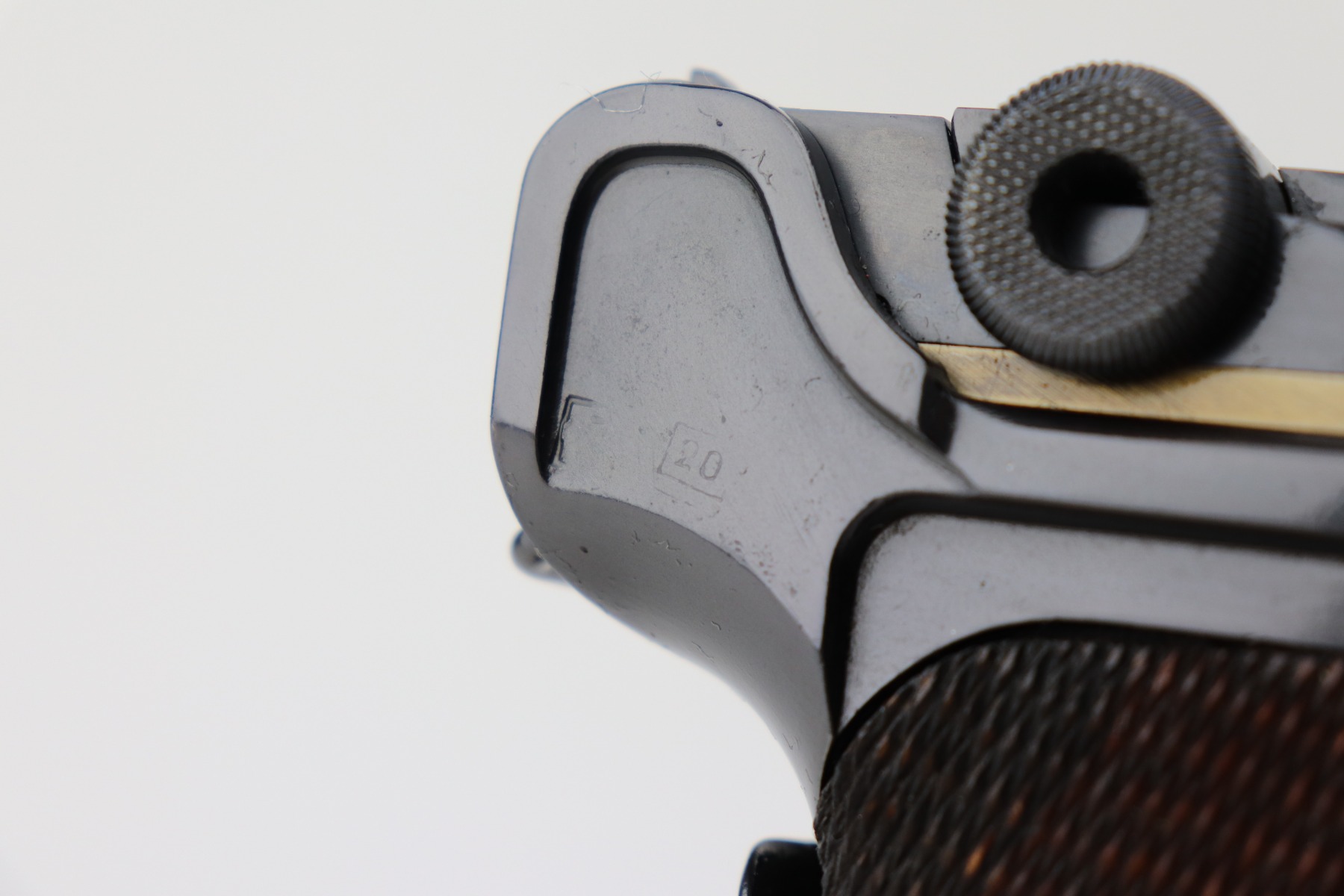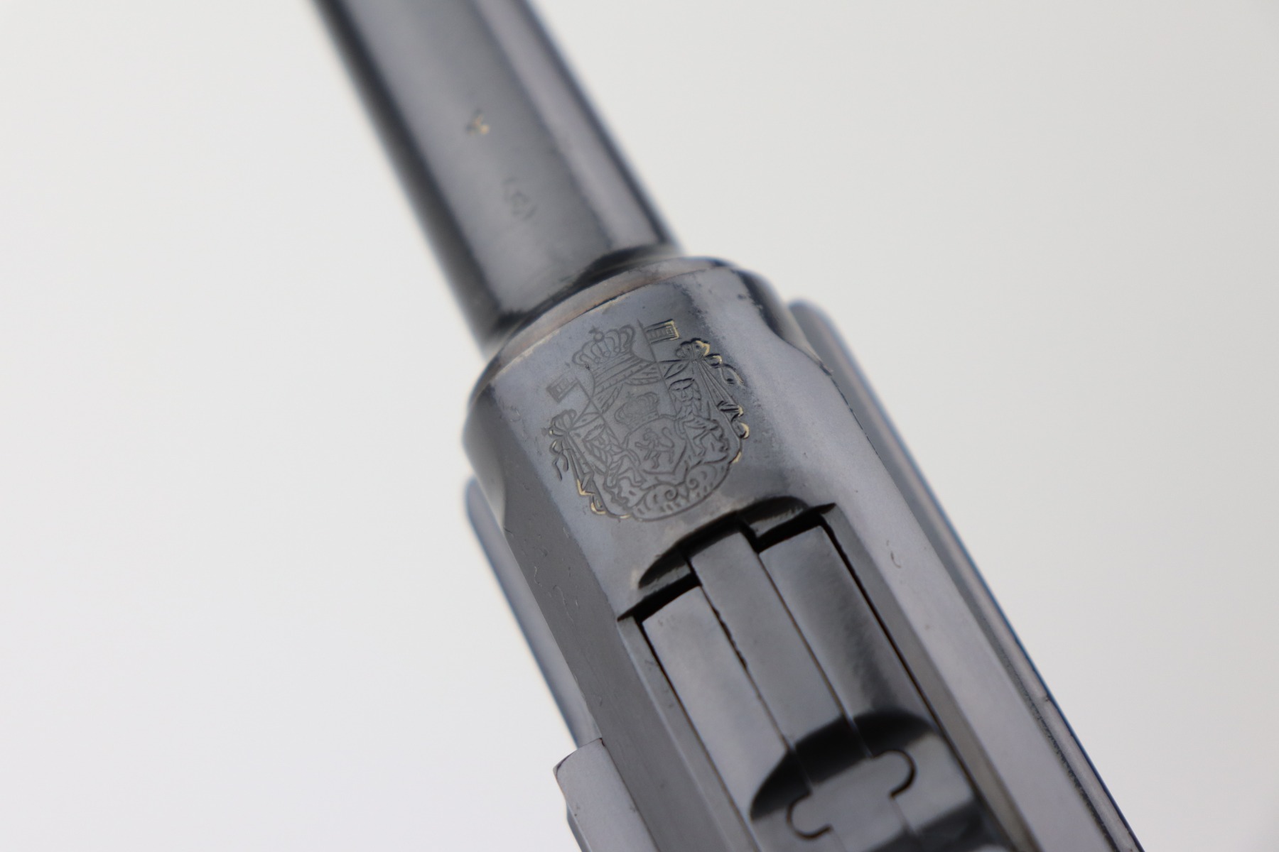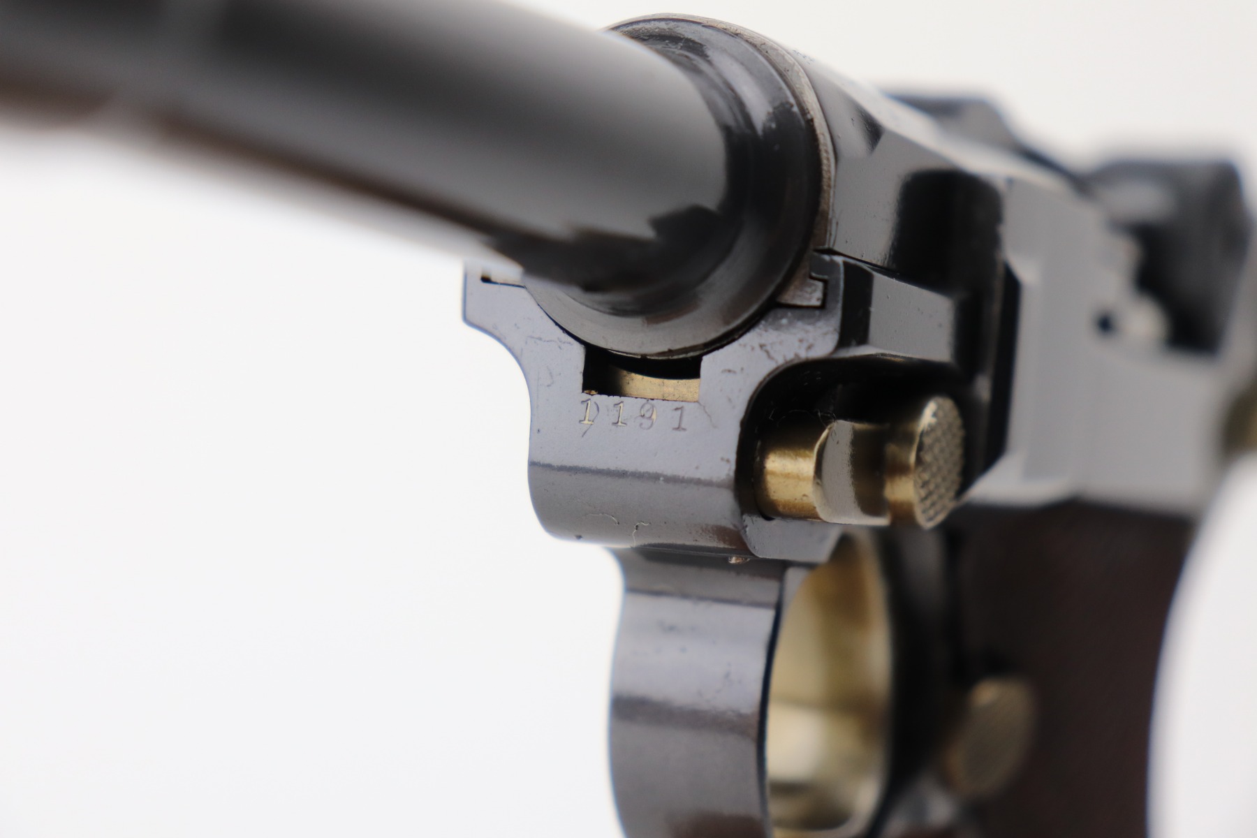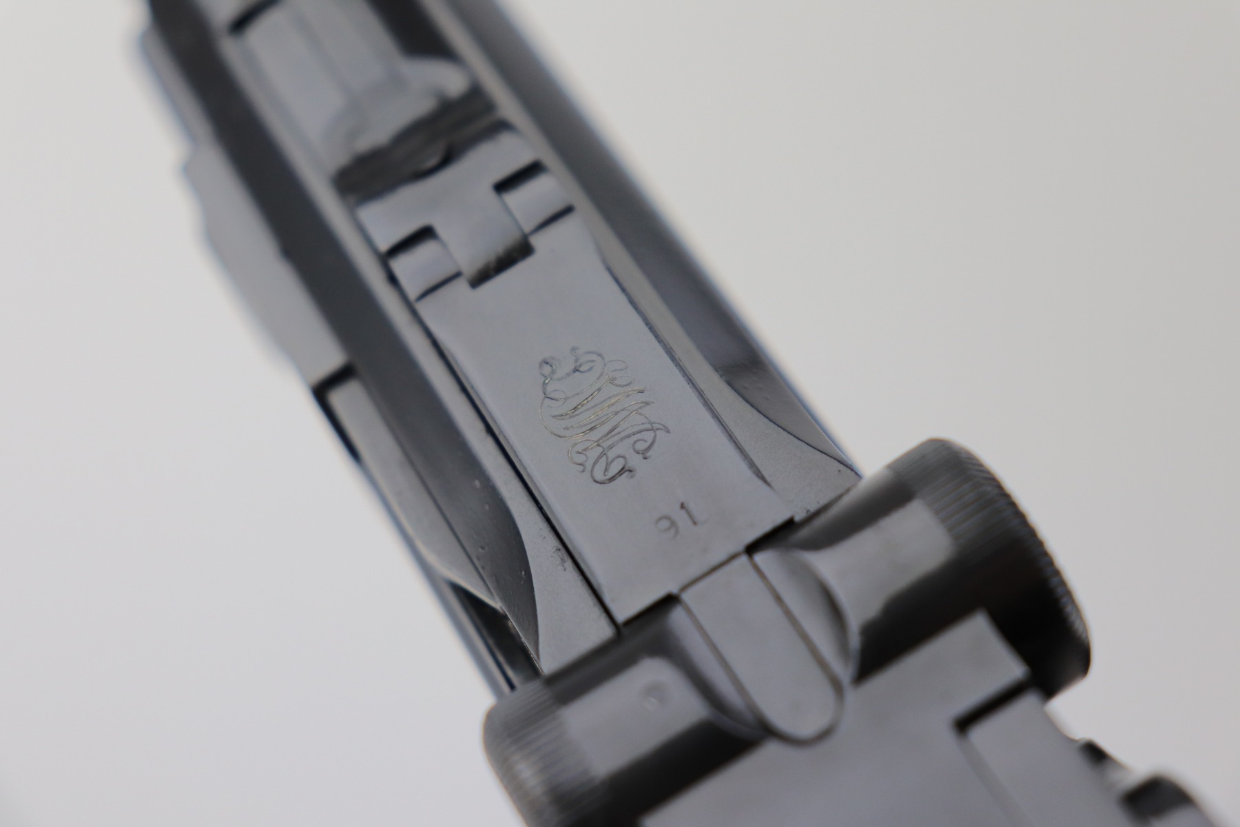 4/12/21 – This is an excellent example of an extremely rare DWM Model 1906 shipped to the Bulgarian government. It is matching and has the Bulgarian Crest on the chamber. As referenced in Jan Still’s Central Powers Pistols, there were only about 1,500 of these produced, with serials from 1-1500. Compare that to the 1908 Bulgarian, which total 10,000! This one is in near mint condition, but we believe it was professionally restored. As a result, the finish is bright and beautiful and the small parts have vibrant straw-coloring. It has retained about 99% of its bluing with a few very minor dings on the front strap. The grips are excellent. The right panel is matching and the left one is numbered “19” – could just be a mistake. The gun also comes with a matching-numbered wood-bottom magazine. The bore is very nice – strong rifling with very minor pin-pricking throughout.