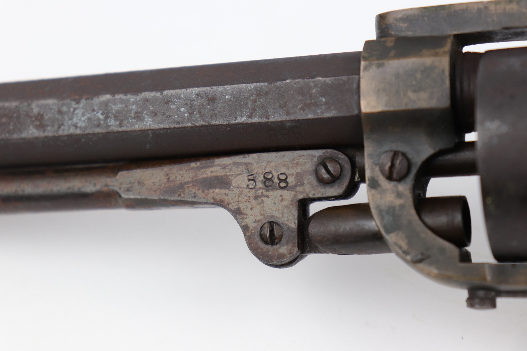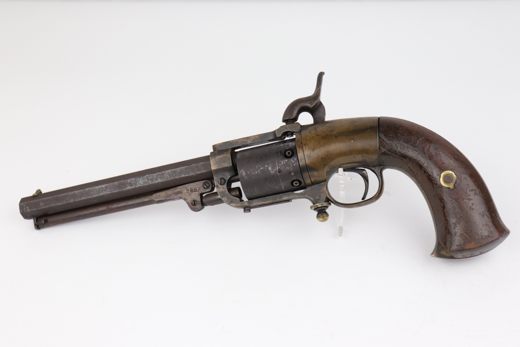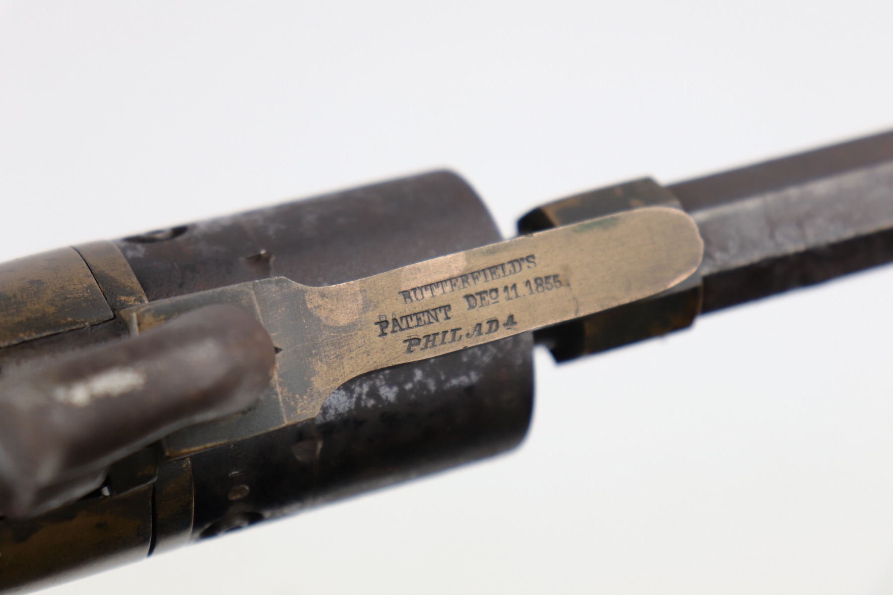This is an example of a Butterfield percussion revolver that was manufactured by Jesse Butterfield of Philadelphia, Pennsylvania in 1862. The Butterfield Revolvers were manufactured in anticipation of an order for 2,280 on a government contract. The contract was never awarded and production was limited to only about 640 revolvers. The revolver had a silver plated brass frame with blue five-shot cylinder, octagonal barrel, casehardened attached loading lever and two-piece flared walnut grips. The revolver is equipped with a special disc priming device loaded by loosening a thumb-screw in front of the trigger guard. The brass top strap is marked “BUTTERFIELD’S/PATENT DEC.11 1855/PHILADA”. The matching serial number is located on the right side of the barrel on the butt and on the bottom of each grip panel. The grips show obvious chips and a crack in each panel. Finish is obviously heavily patinated with some minor surface pitting/rust. Bore has decent rifling but deeply frosted throughout. This one still features the original percussion loading device, which is hard to find for these revolvers. The cylinder indexing spring is broken, so the cylinder obviously does not index.