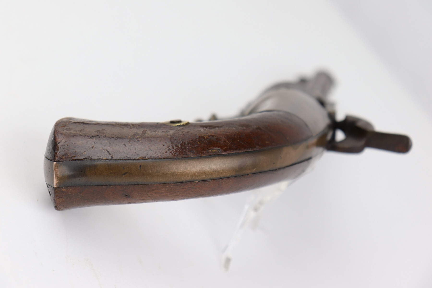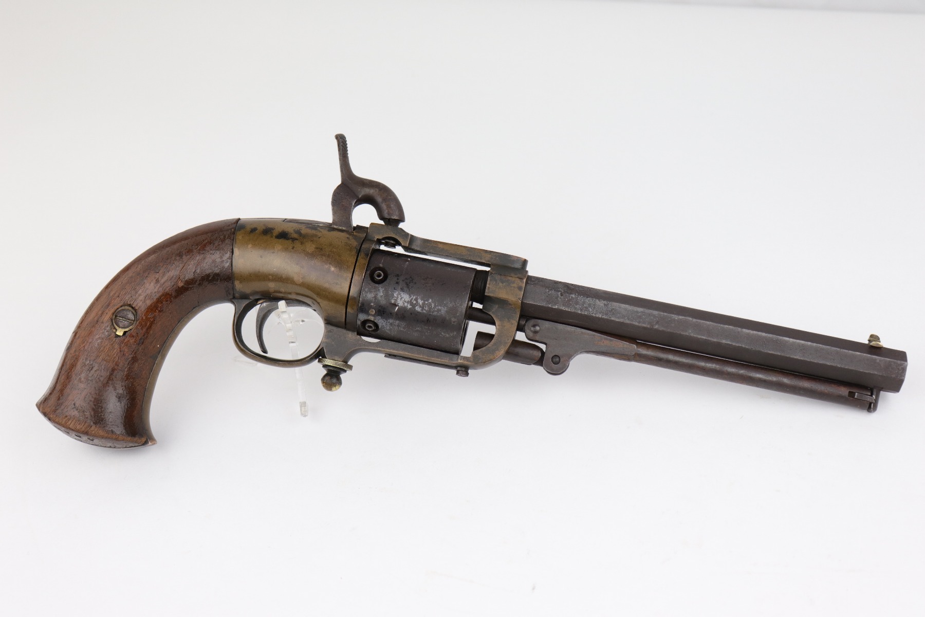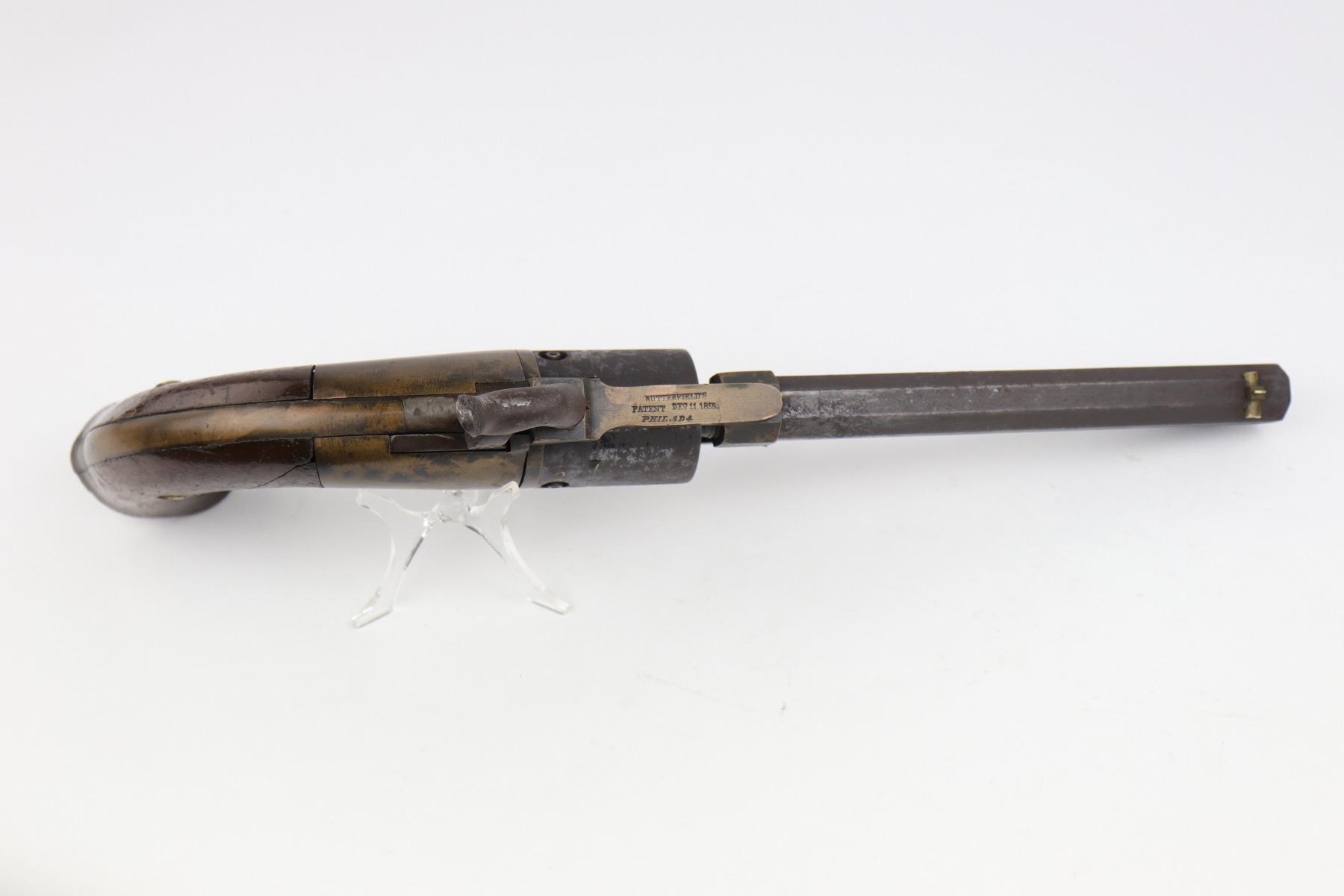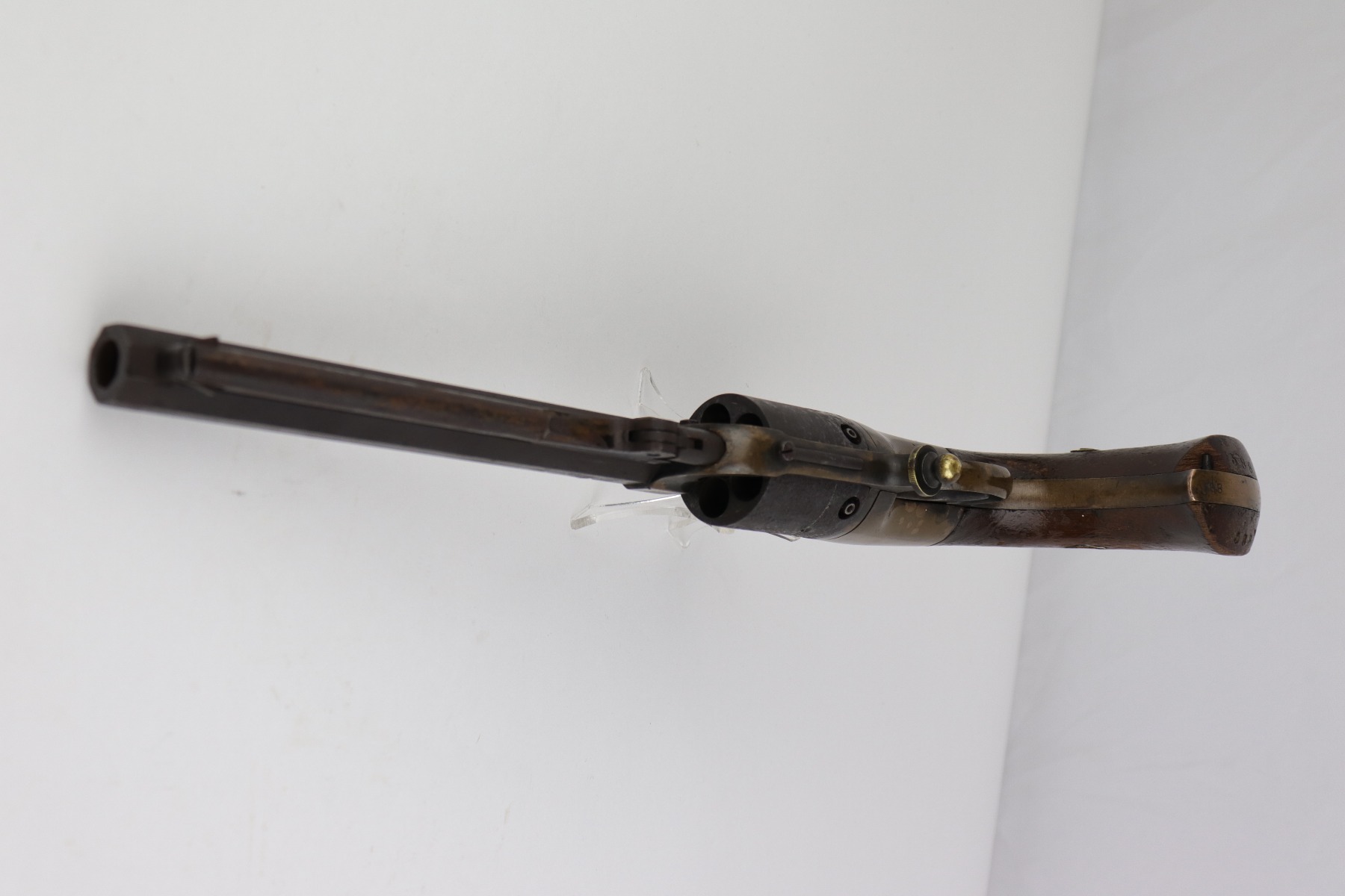 This is an example of a Butterfield percussion revolver that was manufactured by Jesse Butterfield of Philadelphia, Pennsylvania in 1862. The Butterfield Revolvers were manufactured in anticipation of an order for 2,280 on a government contract. The contract was never awarded and production was limited to only about 640 revolvers. The revolver had a silver plated brass frame with blue five-shot cylinder, octagonal barrel, casehardened attached loading lever and two-piece flared walnut grips. The revolver is equipped with a special disc priming device loaded by loosening a thumb-screw in front of the trigger guard. The brass top strap is marked “BUTTERFIELD’S/PATENT DEC.11 1855/PHILADA”. The matching serial number is located on the right side of the barrel on the butt and on the bottom of each grip panel. The grips show obvious chips and a crack in each panel. Finish is obviously heavily patinated with some minor surface pitting/rust. Bore has decent rifling but deeply frosted throughout. This one still features the original percussion loading device, which is hard to find for these revolvers. The cylinder indexing spring is broken, so the cylinder obviously does not index.