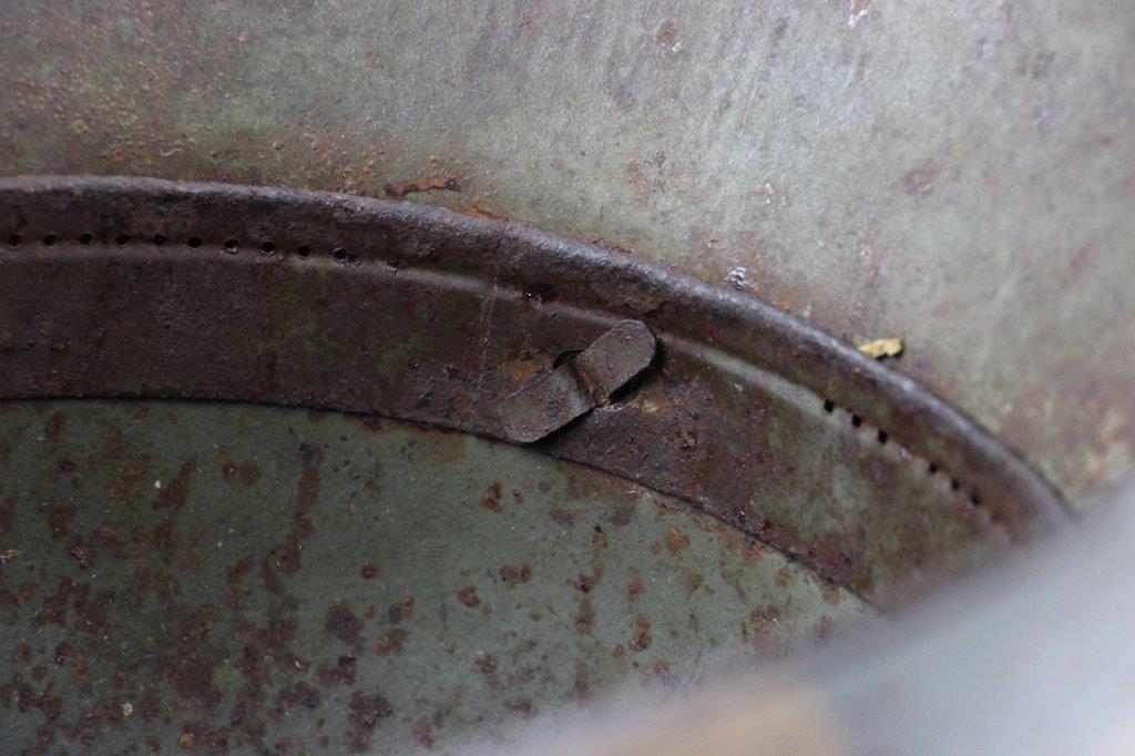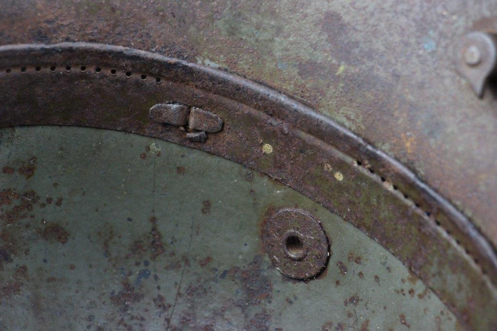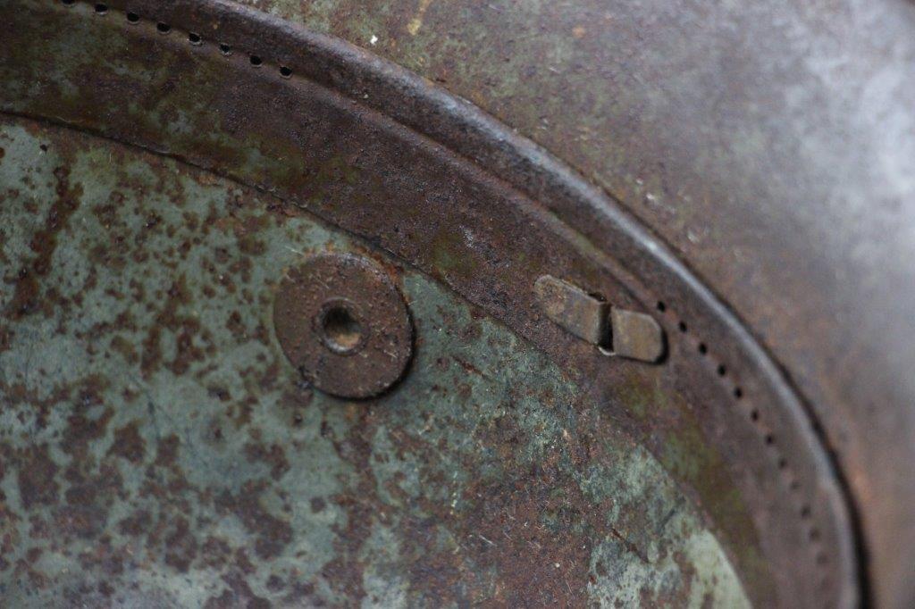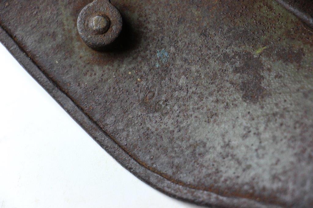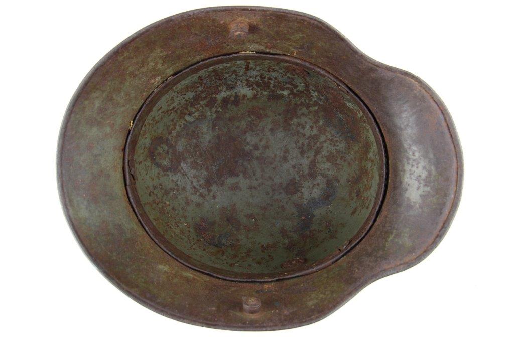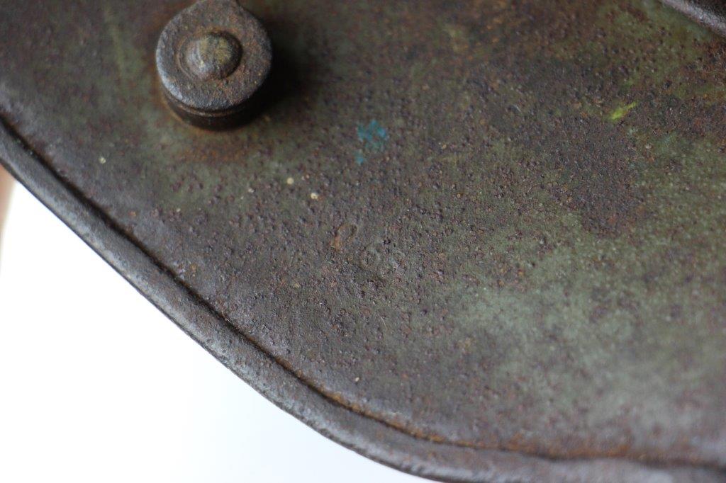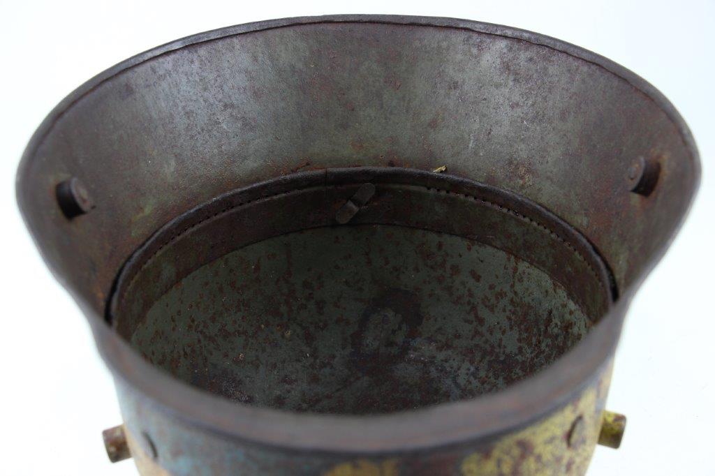 6/20/24 – This is an original WW1 German M1916 Helmet shell with original camouflage paint. The helmet is maker stamped on the interior shell “Q 66”, for F.W. Quist and size 66. The marking is somewhat hard to read due to the dark patina and wear around that area. The shell has normal, natural patina and surface wear throughout, but no dents or major issues. The camo painted exterior has brown, beige, greens, and some blue. Dark patina and surface aging throughout, which makes this example unmistakably original. The original liner rivets and liner band is still intact and attached, as shown. No liner pads however, and priced accordingly.