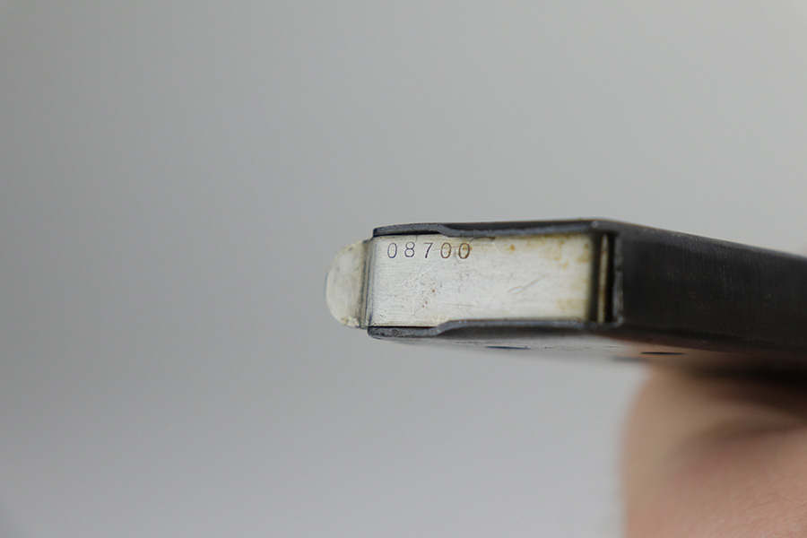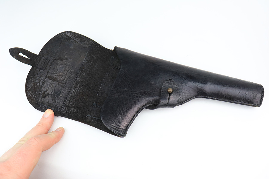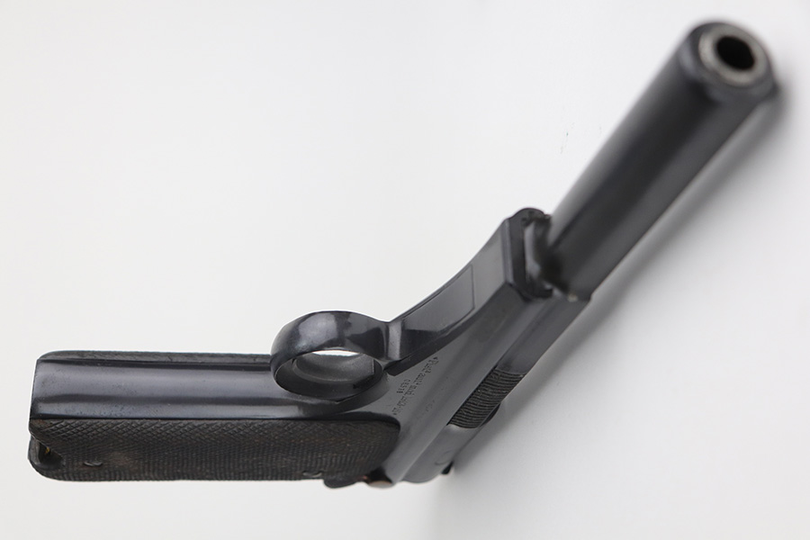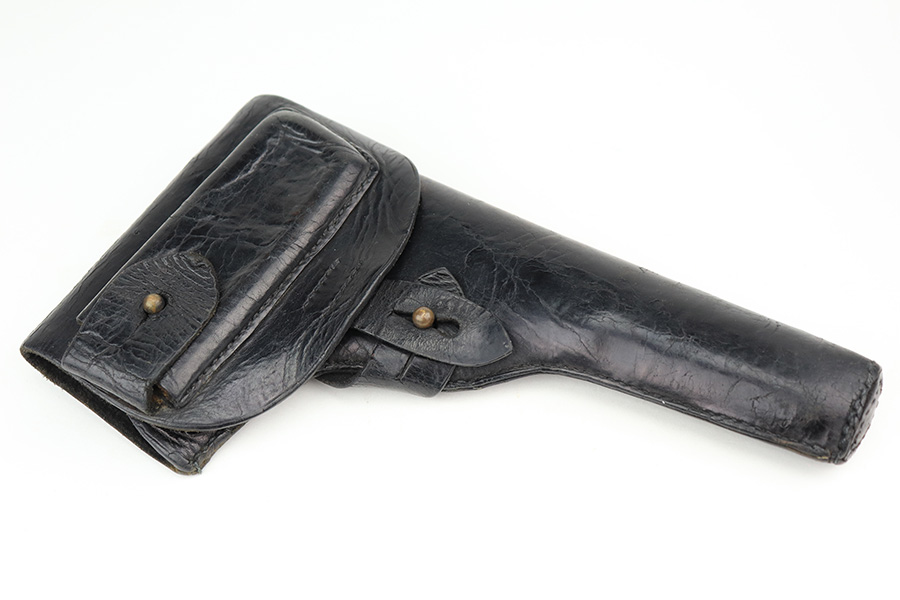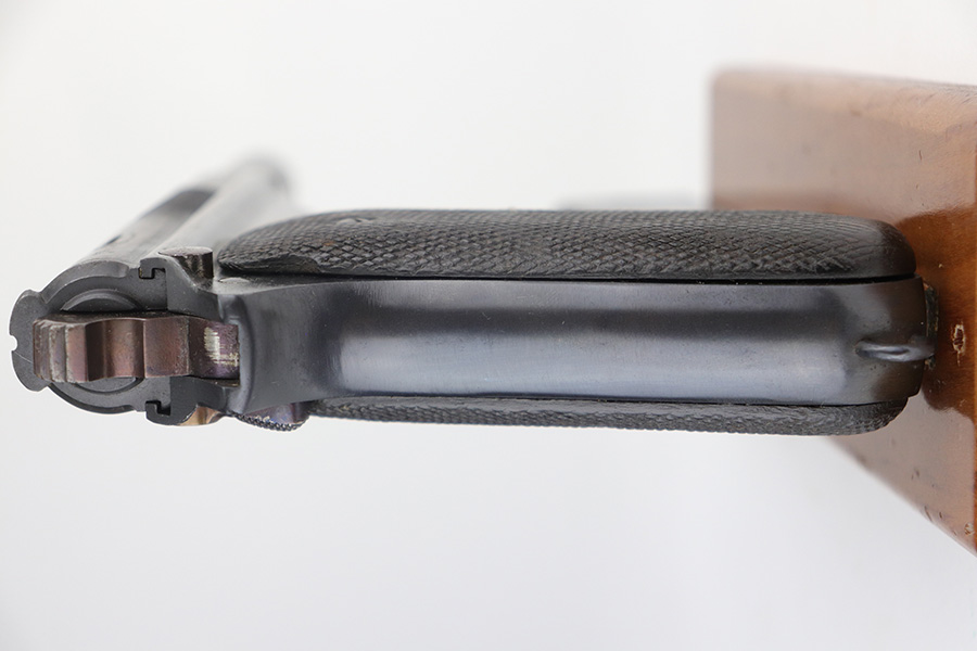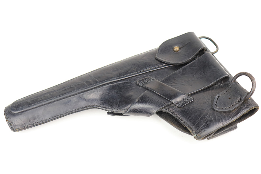 There’s hardly any bluing loss on this one but it does appear arsenal refinished. There’s some oxidation in a few areas but minimal pinpricking.  Bore has strong rifling but some freckling throughout.  The grips have some handling wear but no cracks or chips.  Correct, original magazine.  The holster is hard-to-find and in very good condition, with minor cracking throughout but no major defects.