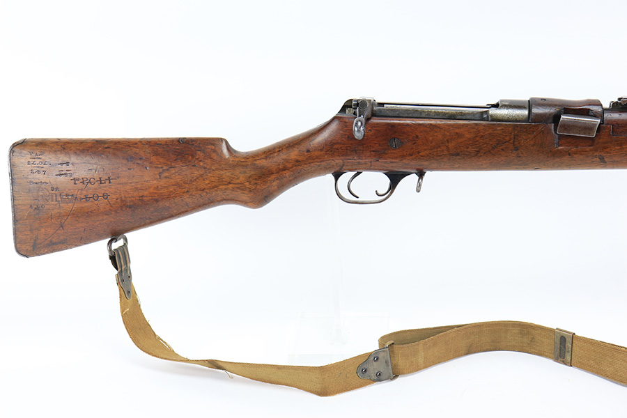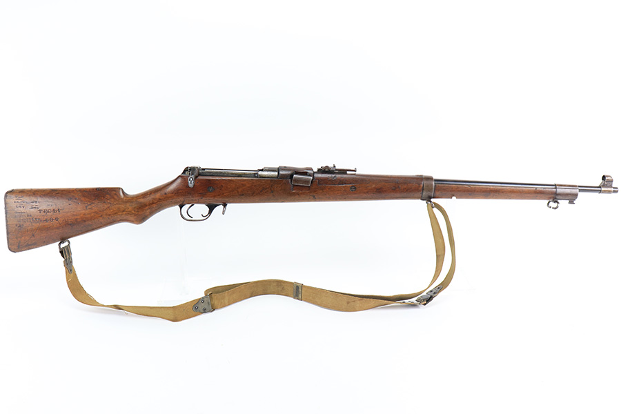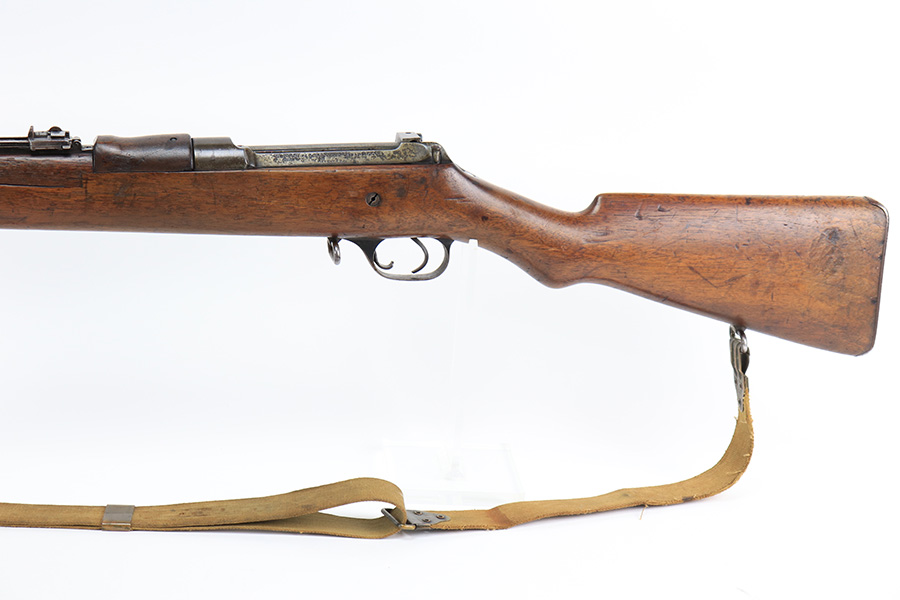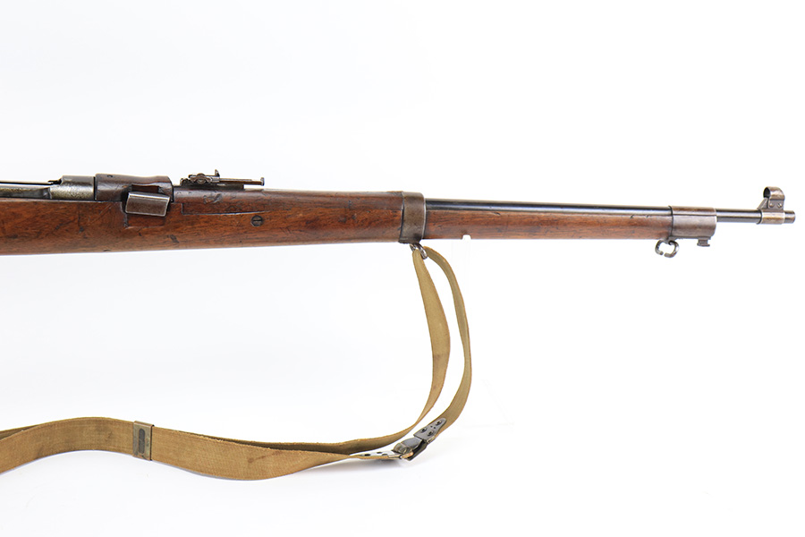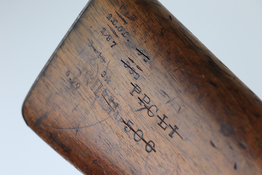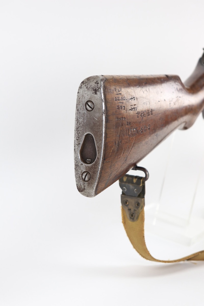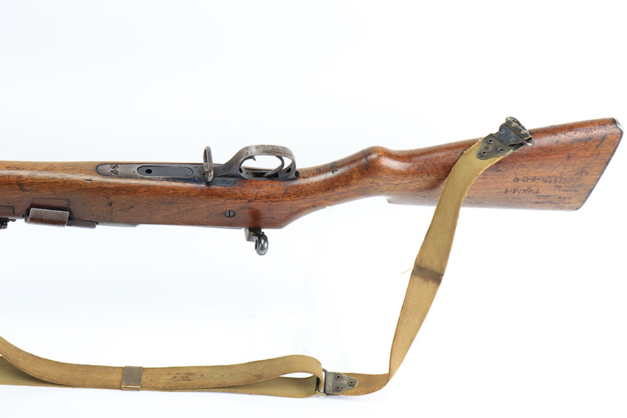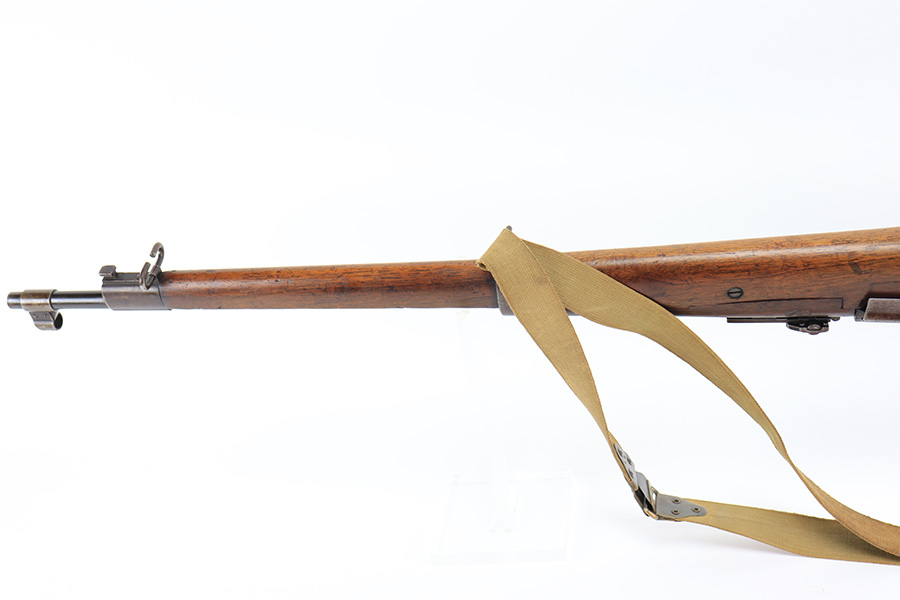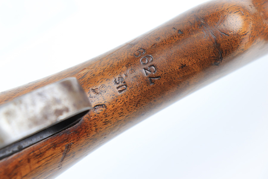 3/16/22 – This is a rare and interesting Ross Mk.II rifle, also referred to as the 1905. From Wikipedia: “The Ross rifle is a straight-pull bolt action .303 inch-calibre rifle that was produced in Canada from 1903 until 1918. The Ross Mk.II (or “model 1905”) rifle was highly successful in target shooting before World War I, but the close chamber tolerances, lack of primary extraction and length made the Mk.III (or “1910”) Ross rifle unsuitable for the conditions of trench warfare, exacerbated by the often poor quality ammunition issued. By 1916, the rifle had been withdrawn from front line service but continued to be used by many snipers of the Canadian Expeditionary Force until the end of the war due to its exceptional accuracy.” Following that sentiment, the U.S. government purchased about 10,000 to use as training rifles for their military, and this one features the U.S. marking with flaming bomb on the stock. The U.S. soldiers would then swap the Canadian slings for American-made Kerr examples, which this rifle still has. The finish on the rifle is original with some thinning throughout, but very good bluing on the barrel. There are clear proofs and cartouches on the right side of the stock but we aren’t certain their meaning. The bore has good rifling but notable frost, dirt and pitting in the grooves. It would likely still benefit from a thorough cleaning. Stock has various dings and an indent on the left side but no structural issues.