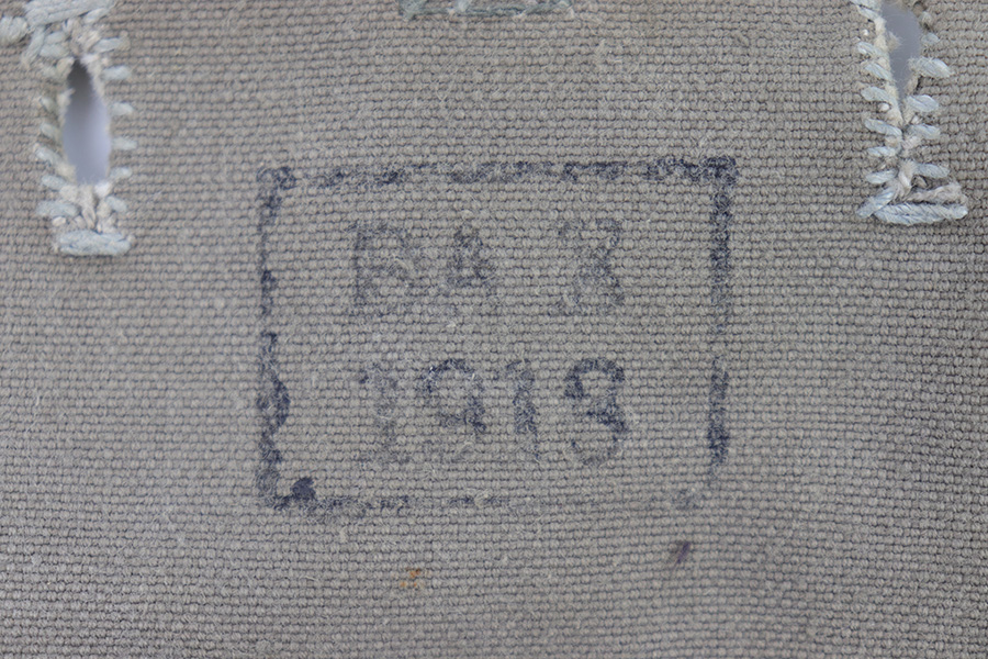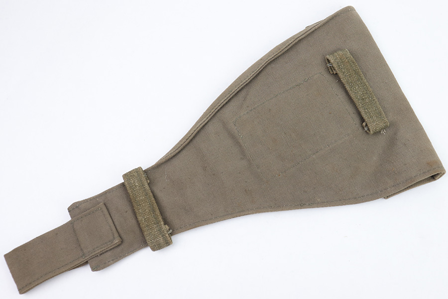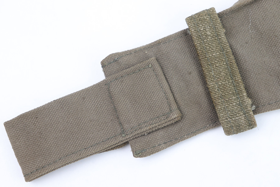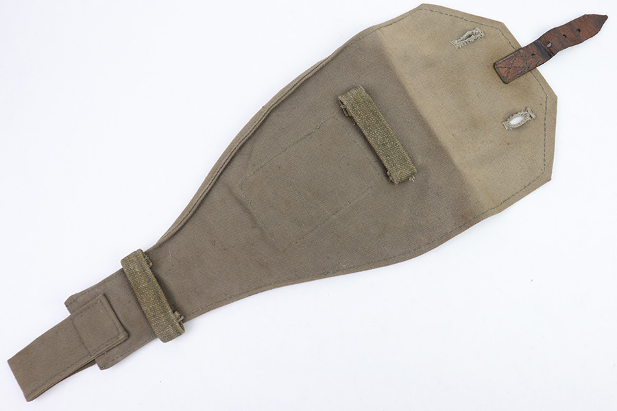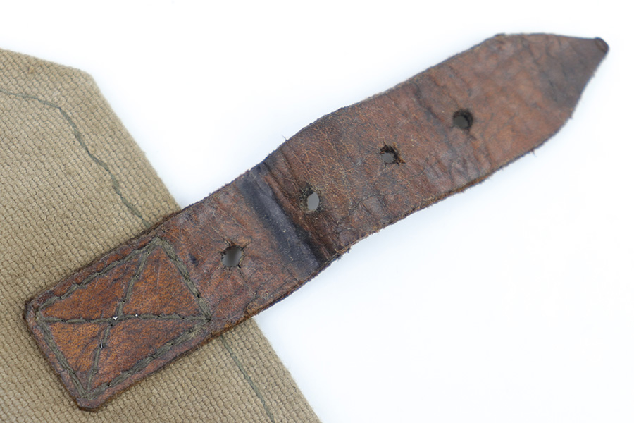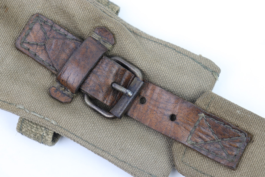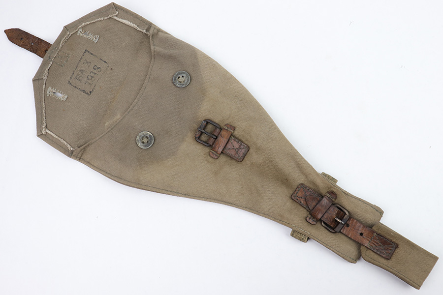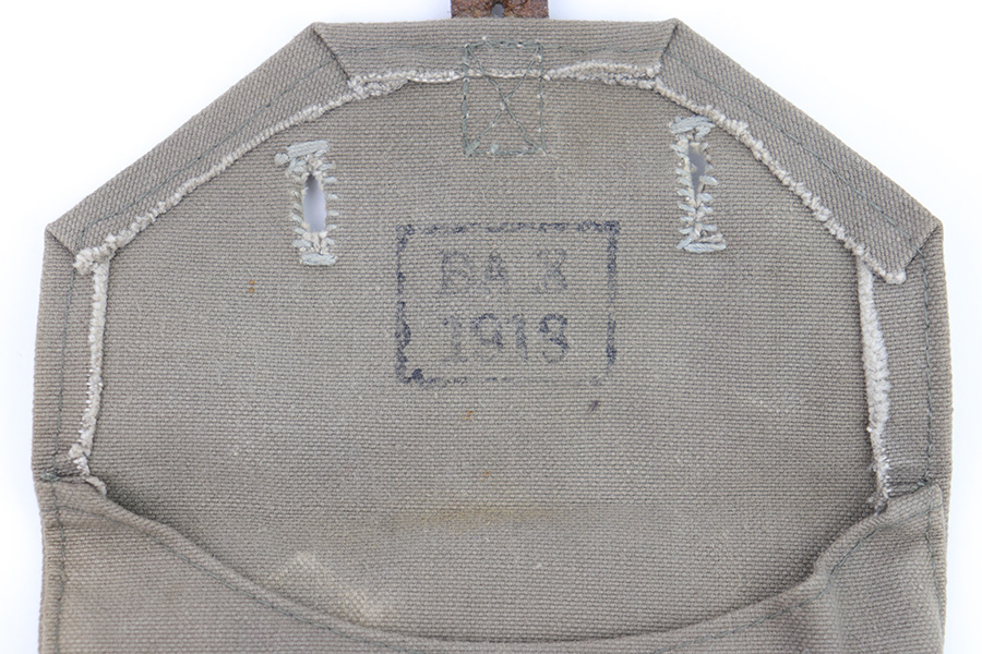 3/17/23 – This is an original and seldom seen canvas magazine pouch for a Snail Drum Luger magazine from WW1. The canvas pouch is in excellent condition with some mild sun staining on the front of the canvas. You can tell when you open the pouch, as the underlying canvas (and the backside canvas) is a much darker color. The canvas is excellent with minimal staining otherwise, and all original excellent stitching throughout. The interior is ink stamped with “BA X 1918” for the Bavarian Tenth Corps Clothing Supply Depot, and the date. The leather closure straps are excellent and original as well.