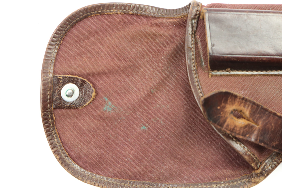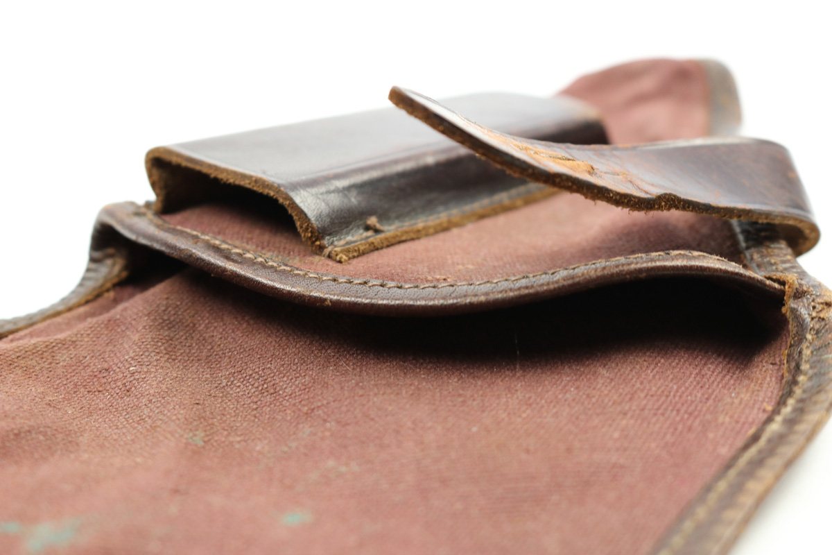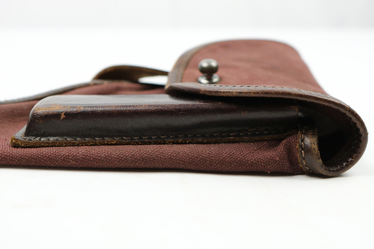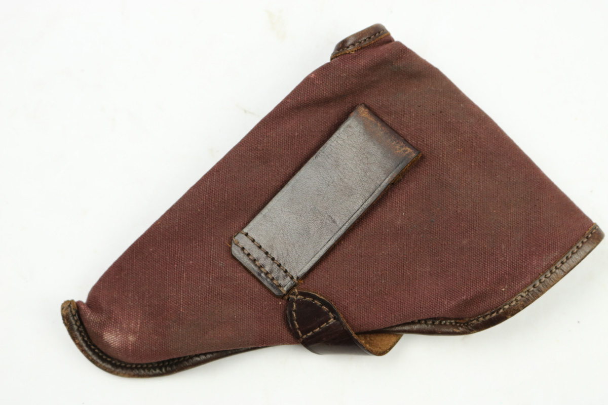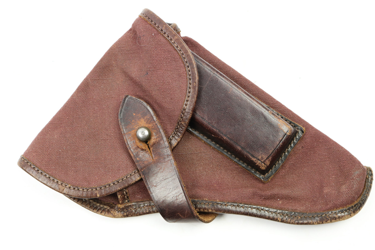 8/1/18 – This is an original WW2 production, scarce canvas 7.65mm holster. These seldom seen holsters were made in both red and blue canvas. There are no markings, but the style and signs of aging / use throughout the holster clearly indicate WW2. Some collectors theorize these were part of the late wartime efforts by the axis forces. The holster fits almost any 7.65mm axis pistol – this one came with a Walther PP inside. The PP and PPK are most often paired with these holsters. Guaranteed original and authentic.