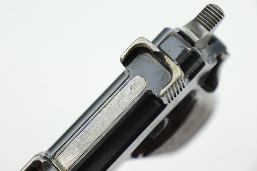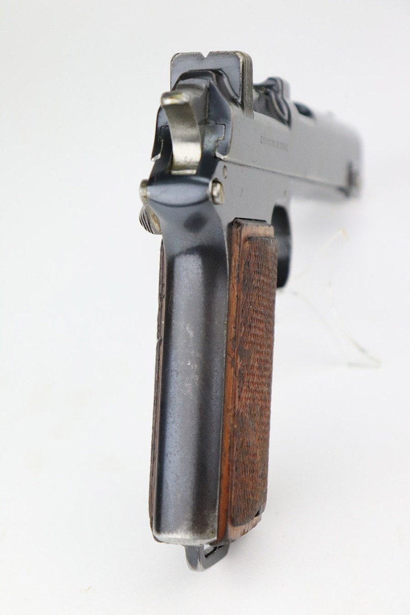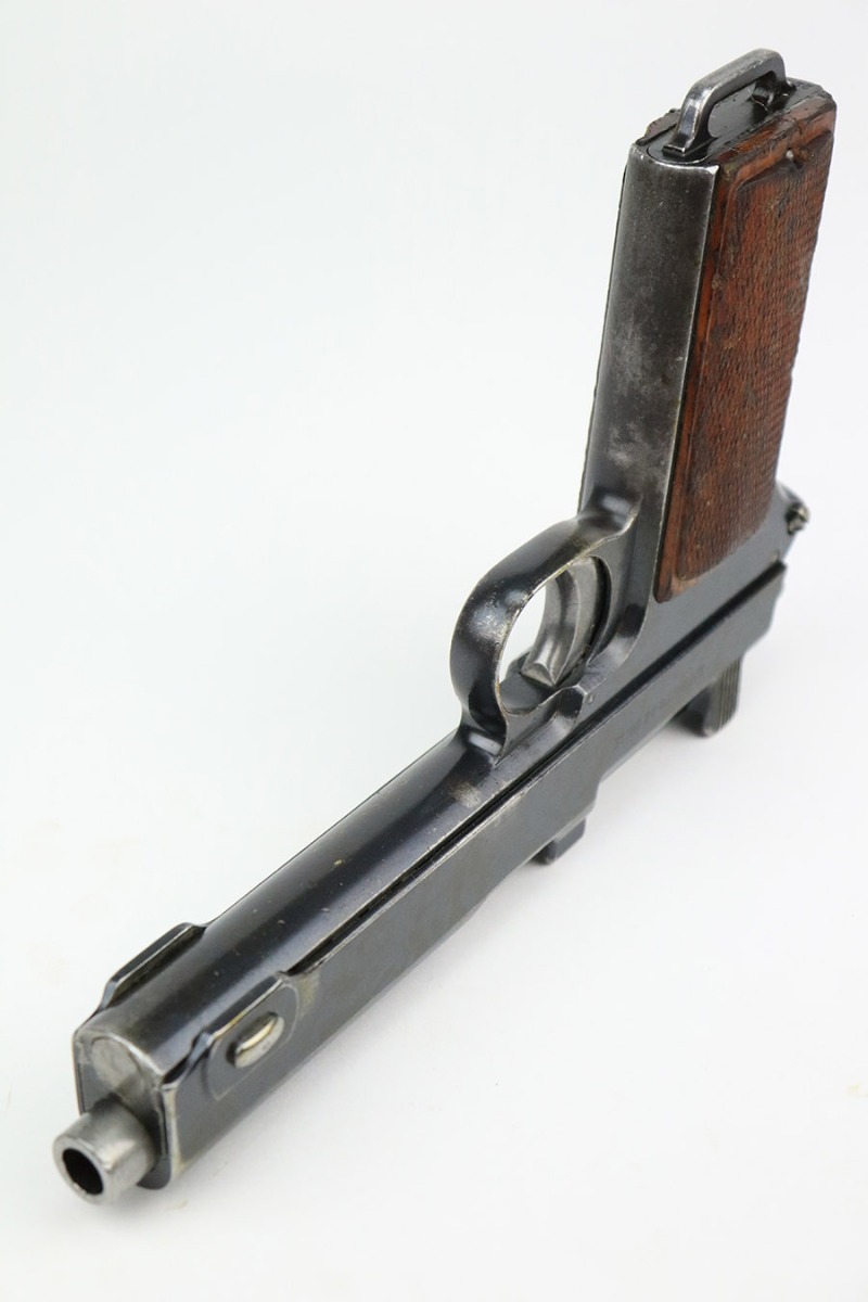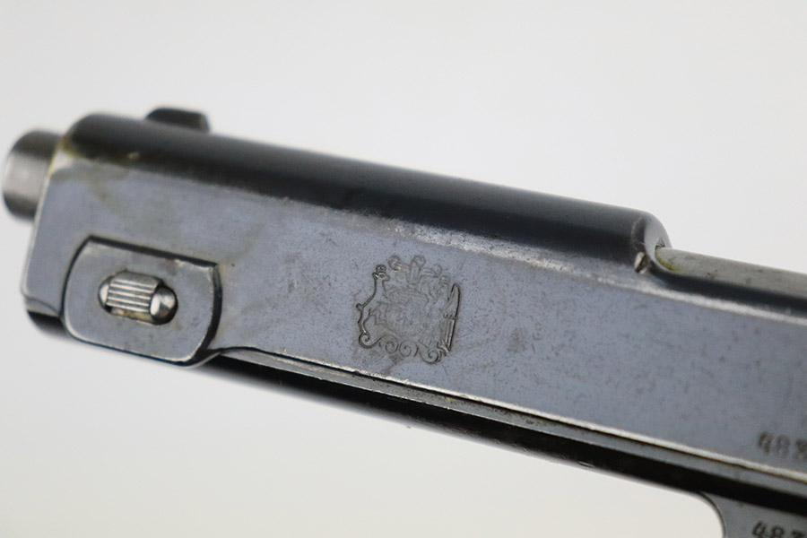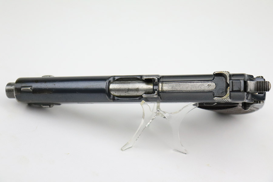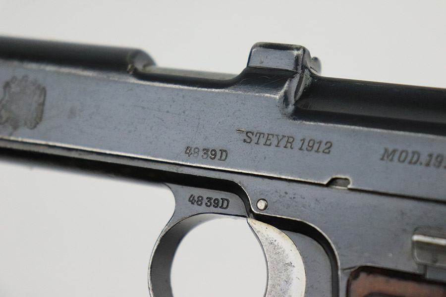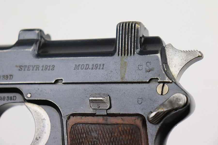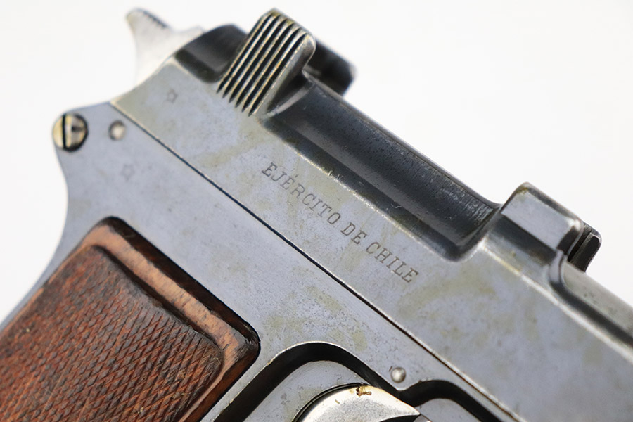 11/10/22 – This is a nice of a rare Steyr Hahn Model 1911 delivered to the Chilean government in 1912. It is all matching, has the proper Chilean proofs throughout, and has the Chilean property seal on the left side of the slide. It has retained about 85% of its finish. The majority of the bluing loss is on the front strap, where the wear is spotty. There is also minor wear around the high edges in general and some tiny dings along the underside of the frame. There is splotchy discoloration along both sides of the frame that appears to be dried grease from when it was stored. Comes with fairly worn wood grips – Tiny dings, bruises, and chips on both. The bore has good rifling with very minor pin-pricking throughout.