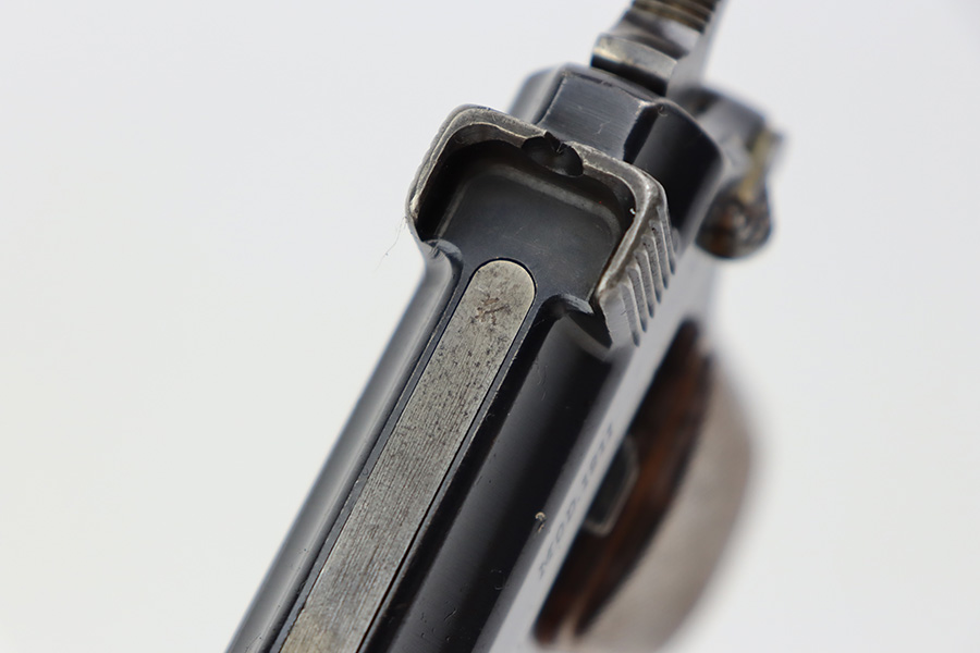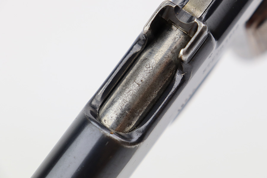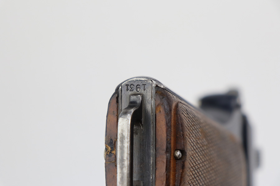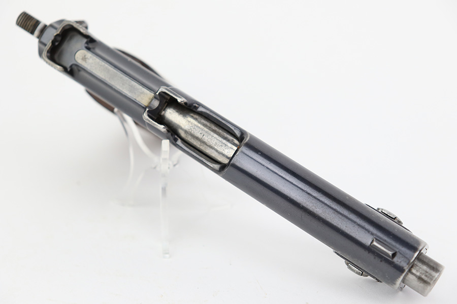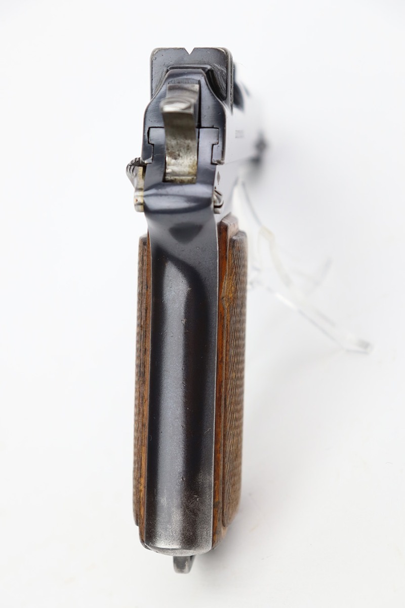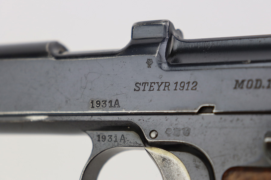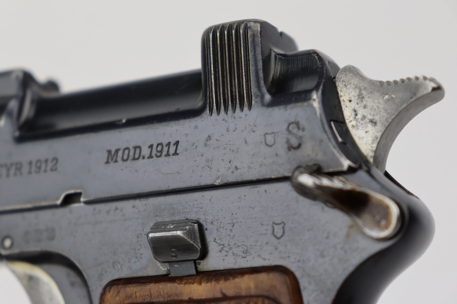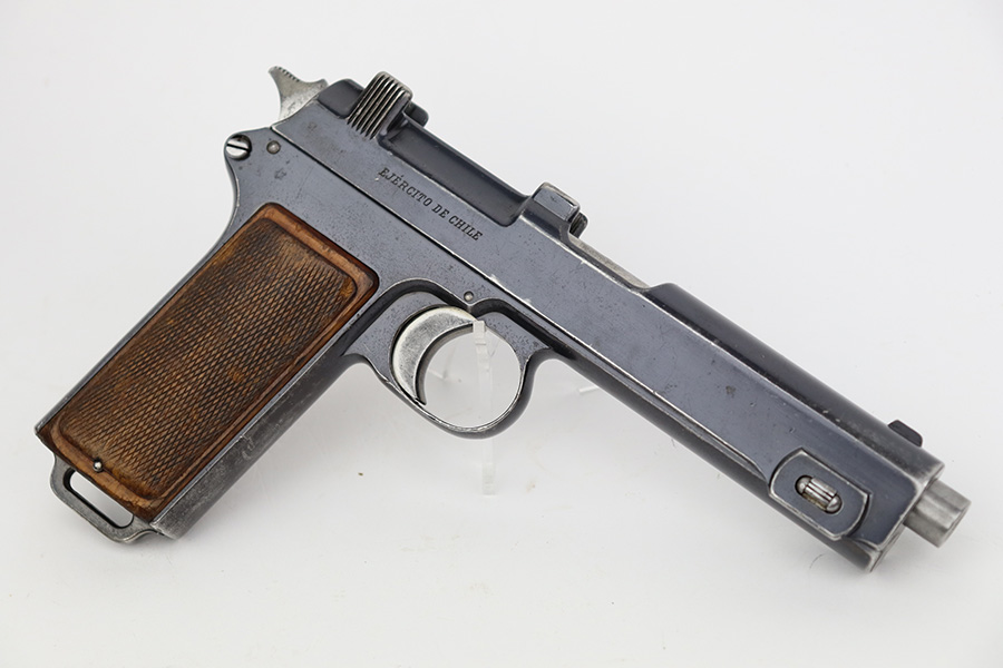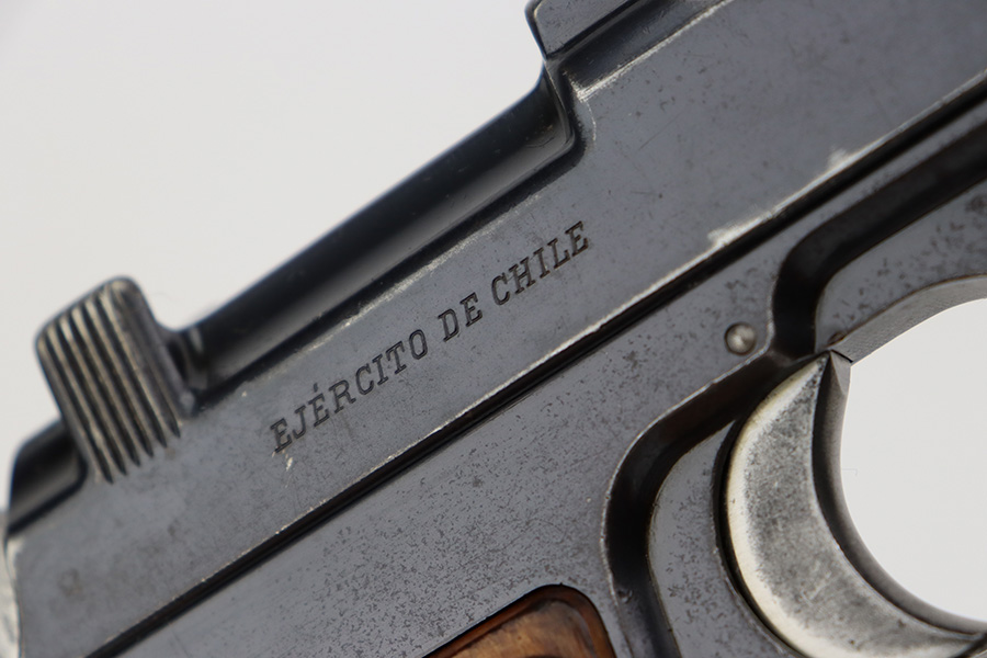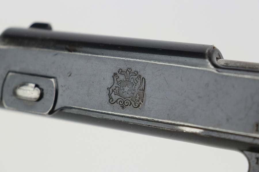 7/12/23 – This is a very nice of a rare Steyr Hahn Model 1911 delivered to the Chilean government in 1912. It is all matching, has the proper Chilean proofs throughout, and has the Chilean property seal on the left side of the slide. West German export markings on the left side of the slide and frame. It has retained somewhere between 85-90% of its original bluing. There is spotty wear on the front strap and areas of minor wear around the muzzle, on the high edges in general, and at the base of the back strap. Fitted with slightly worn period-correct wood grips. Minty bore.