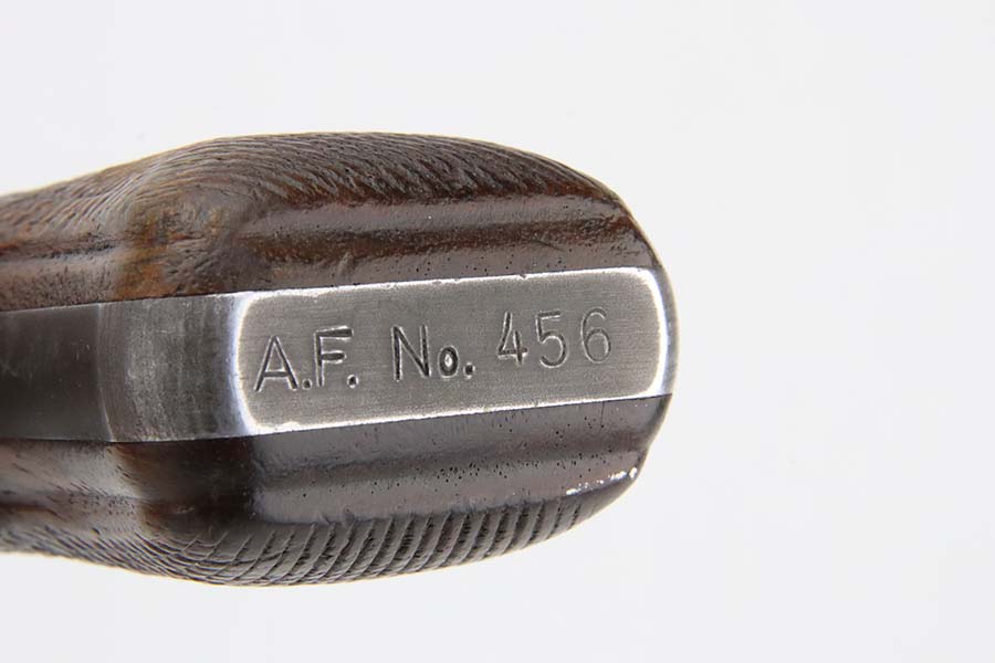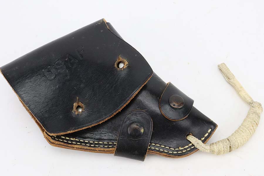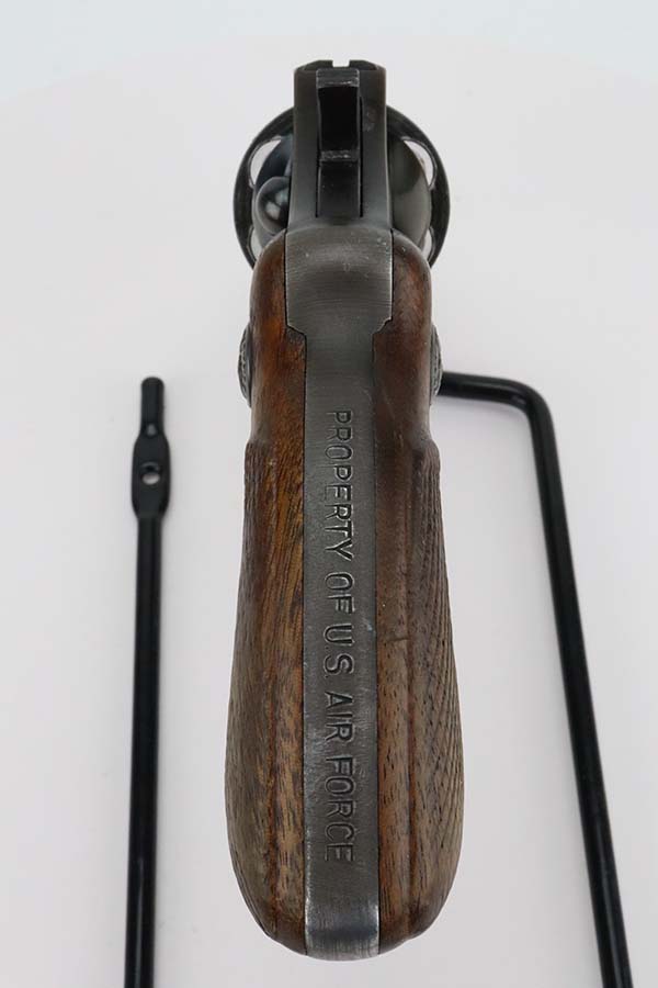 3/4/24 – This is a rare Colt Aircrewman revolver that was produced and issued to the US Air Force. Only a tiny fraction of guns made remain as they were deemed unsafe and most were destroyed by the Air Force. Cylinders would split due to overpowered ammunition being used. This one is “Property of US Air Force” Marked with an “AF No. 456” Property marking on the butt of the frame. Comes as a rig with a correct “USAF” marked holster. The gun has lost most of its original finish with obvious thinning throughout. Mint bore.