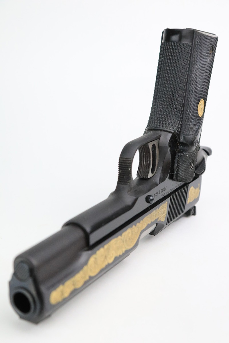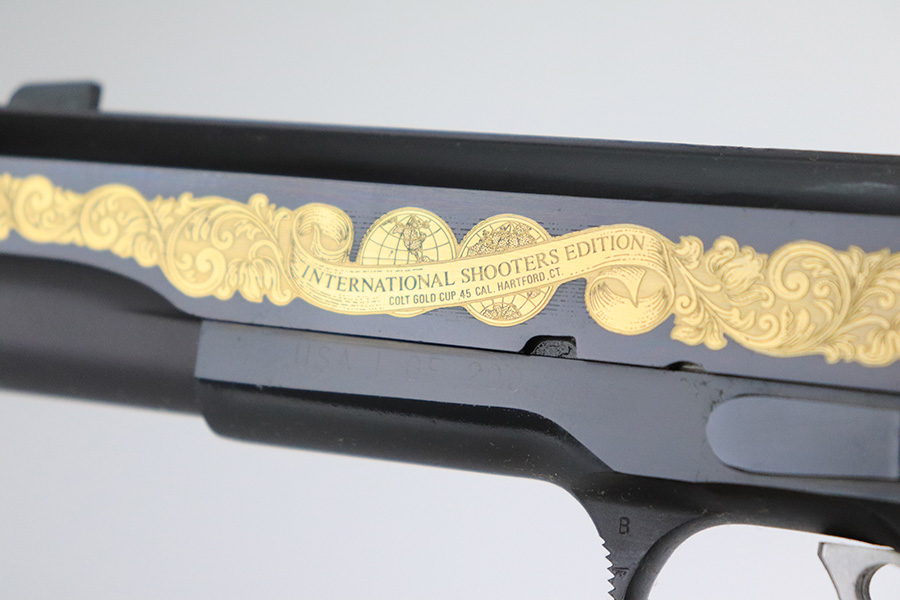 7/14/22 – This is a rare Colt Gold Cup 1911 that was one of 200 produced as the International Shooters Edition. We couldn’t find much info on this variation, but a matching Colt Custom shop label is present so it’s possible it was a Colt-licensed custom shop order. Both sides of the slide are engraved and filled with gold inlay. The gun appears unfired, and the bluing is mint. Rubber Colt/Pachmayr grips. The original Styrofoam insert and outer box are present, though the flaps are gone. Comes with manual. FFL required.