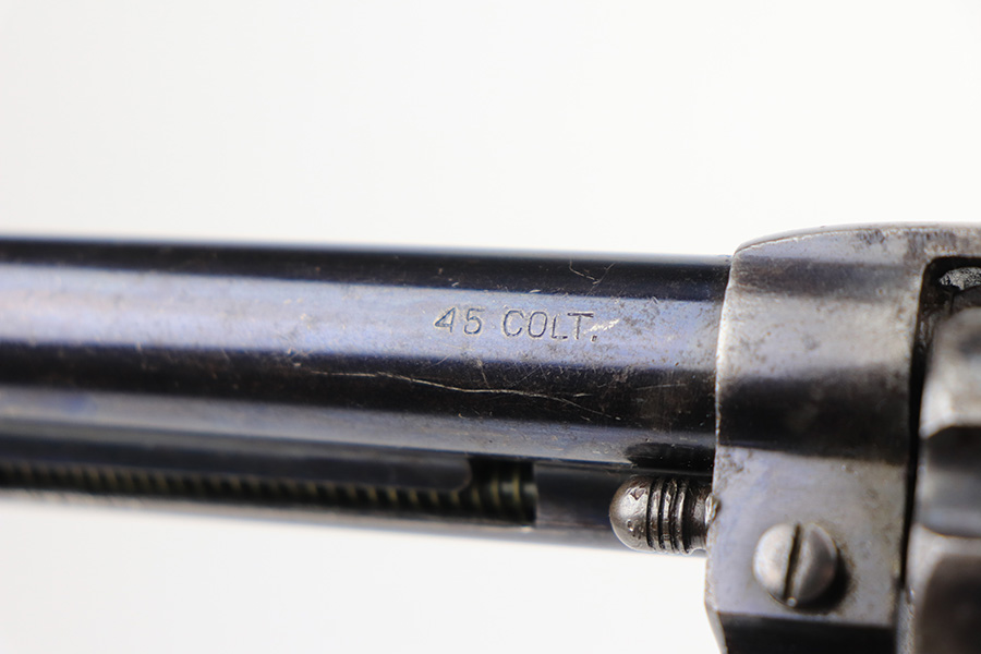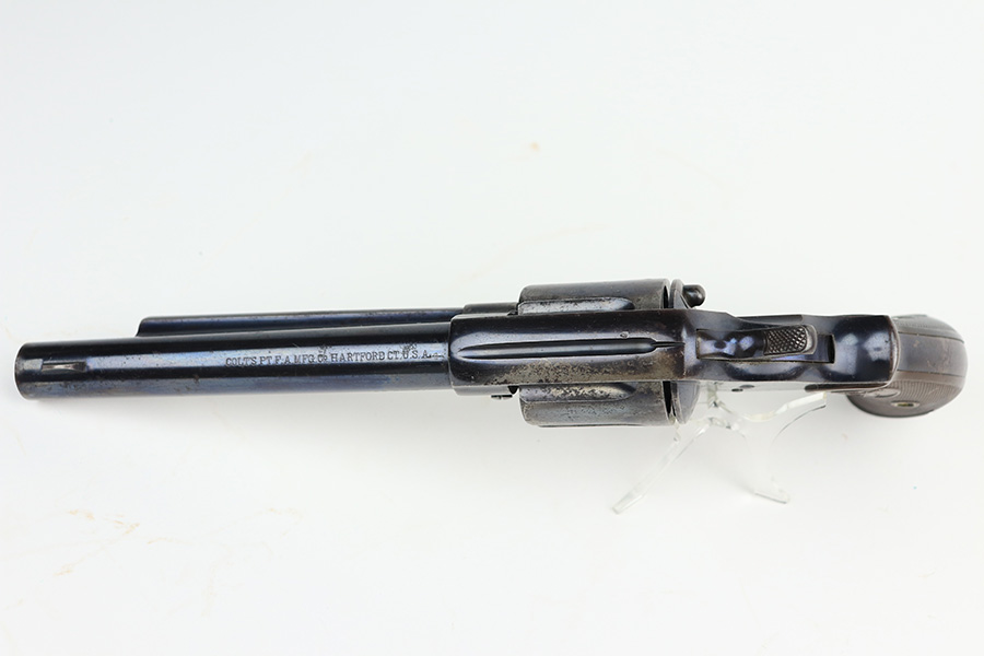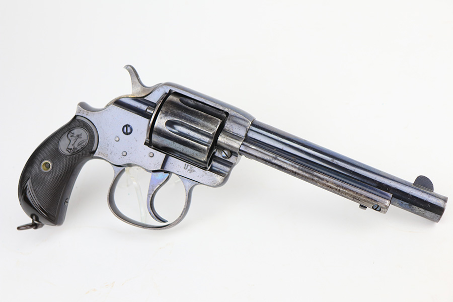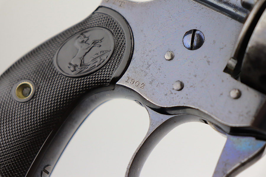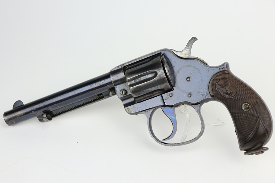 2/9/22 – This is a rare Colt M1902 Alaskan / Philippine model revolver that was manufactured upon request of the U.S. Army during the Philippine-American War and Moro Rebellion. One of only 4,600 produced! A stronger mainspring was installed to ensure the hammer had enough force to fire the .45 Long Colt government ammunition which was less sensitive than the ammunition on the civilian market. The smaller Model 1878 trigger and trigger guard were replaced with larger versions to help compensate for the resulting stiffer trigger pull. The Alaskan nickname was borne out of the misnomer that the larger trigger guard was designed for use in cold weather while wearing gloves. These revolvers also have a lanyard loop on the butt. This example has standard factory sights, markings, and grips; “U.S.,” John T. Thompson’s “JTT” inspector stamp, “U.S.”, and “1902” on the right side of the frame; and Rinaldo A. Carr’s “R.A.C.” stamp on the rear face of the cylinder, left side of the frame at the hump, and on the left side of the trigger guard. Matching serials on frame, loading gate and cylinder. About 70% of the original blue remains but this one presents nicely for a 70% gun. Original hard rubber Colt grips with no cracks or chips. Excellent bore. Mechanics/timing seem good.