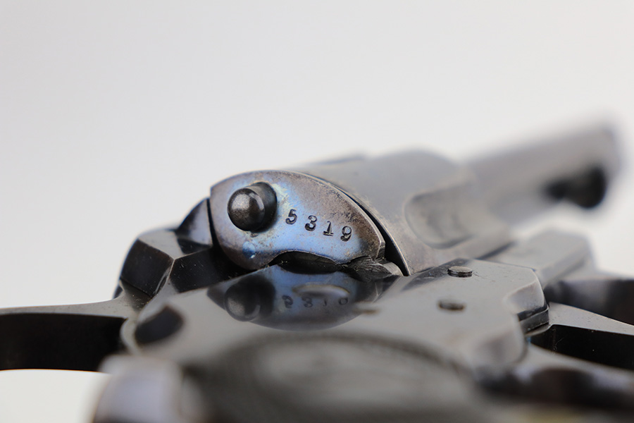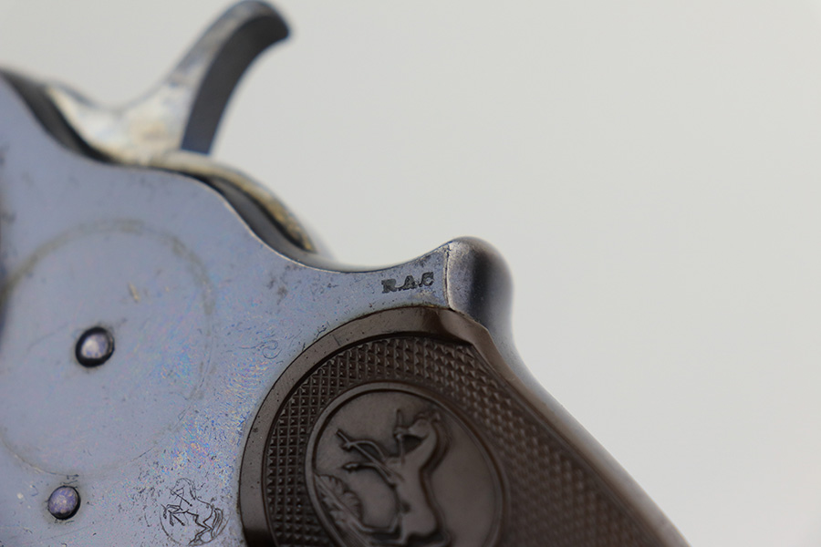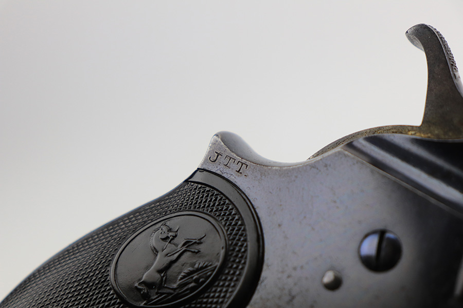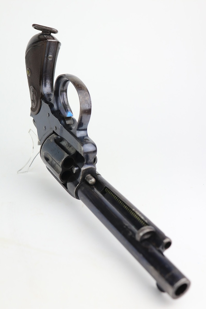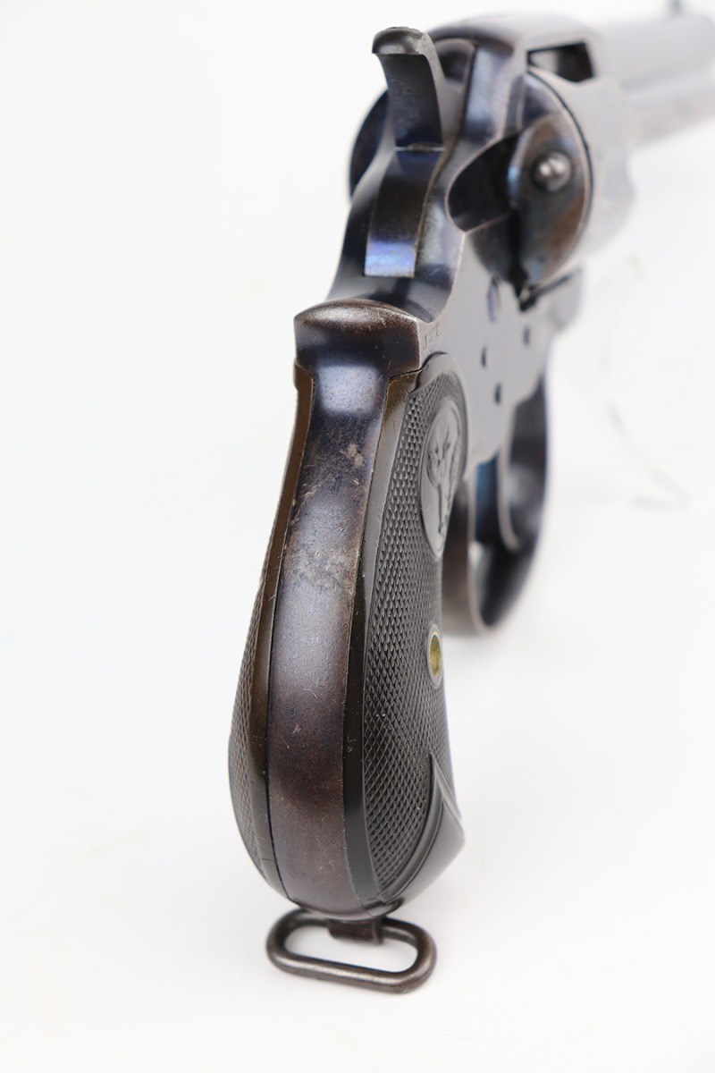 2/9/22 – This is a rare Colt M1902 Alaskan / Philippine model revolver that was manufactured upon request of the U.S. Army during the Philippine-American War and Moro Rebellion. One of only 4,600 produced! A stronger mainspring was installed to ensure the hammer had enough force to fire the .45 Long Colt government ammunition which was less sensitive than the ammunition on the civilian market. The smaller Model 1878 trigger and trigger guard were replaced with larger versions to help compensate for the resulting stiffer trigger pull. The Alaskan nickname was borne out of the misnomer that the larger trigger guard was designed for use in cold weather while wearing gloves. These revolvers also have a lanyard loop on the butt. This example has standard factory sights, markings, and grips; “U.S.,” John T. Thompson’s “JTT” inspector stamp, “U.S.”, and “1902” on the right side of the frame; and Rinaldo A. Carr’s “R.A.C.” stamp on the rear face of the cylinder, left side of the frame at the hump, and on the left side of the trigger guard. Matching serials on frame, loading gate and cylinder. About 70% of the original blue remains but this one presents nicely for a 70% gun. Original hard rubber Colt grips with no cracks or chips. Excellent bore. Mechanics/timing seem good.