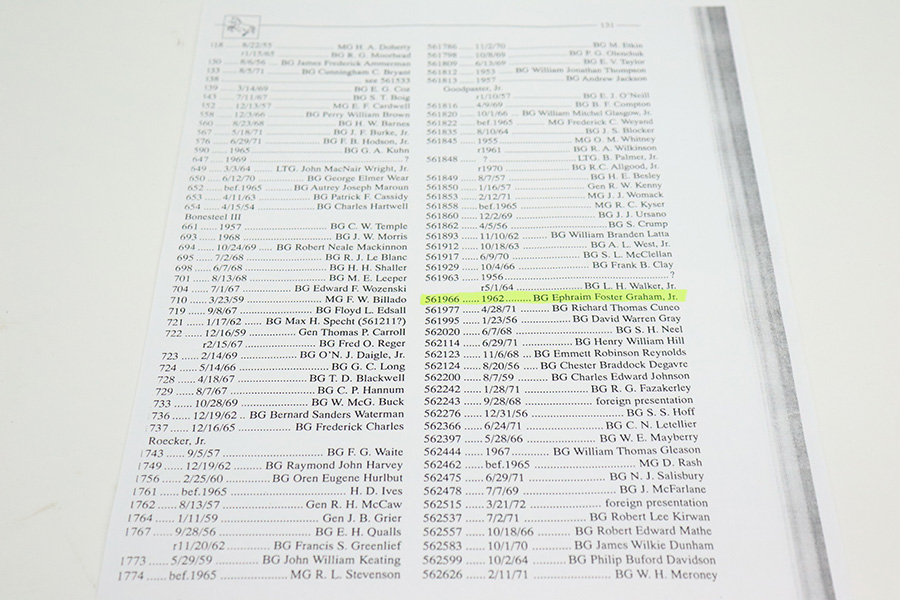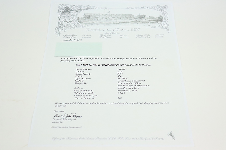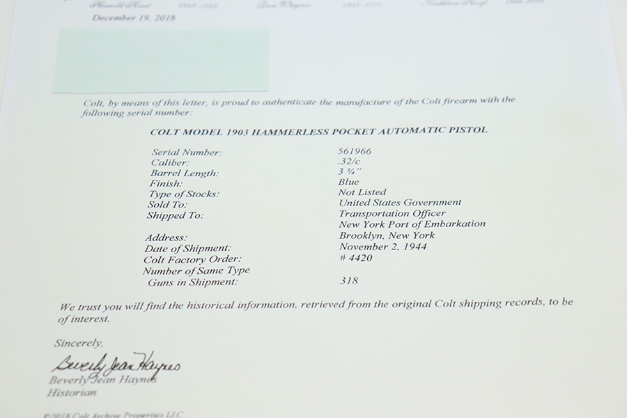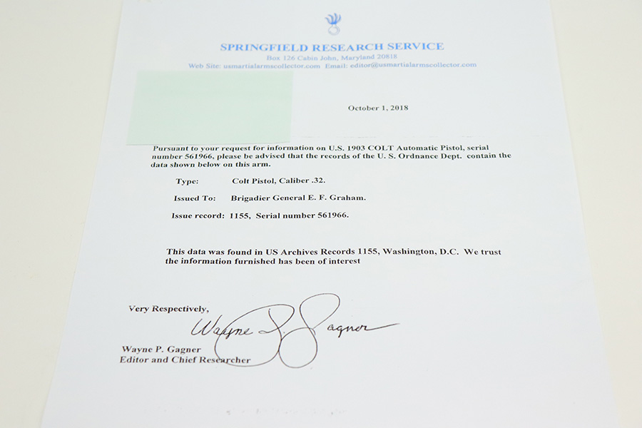 7/19/22 – This is a rare Colt Model 1903 that was manufactured in 1942 for the U.S. military and later presented to Brigadier General E.F. Graham. The pistol is in great condition with 96-98% of the parkerized finish remaining. This one is difficult to rate as there’s very little actual wear, but some patina has set in. This pistol is then documented by serial in Brunner’s Colt book as being presented to Graham in 1962. Ephraim Foster Graham Jr. commanded the 644th Tank Destroyer Battalion in training at Fort Hood, and then through five campaigns in the European theater. His unit was awarded the Presidential Unit Citation and the Belgian Fourragere. Their unit spent 300 days in combat, including at the Battle of the Bulge. For his service during WW2, Graham received two silver stars and two bronze stars. In Korea, he later served as chief of staff for the 3rd Infantry Division, and in Germany he commanded the 14th Armored Cavalry Regiment. He lived to the age of 90, as he passed away in 2003. The listing includes a copy of the Colt archive letter stating the pistol shipped in 1944 to the U.S. Government, as well as the Springfield research service letter further confirming this pistol was issued to Brigadier General Graham.