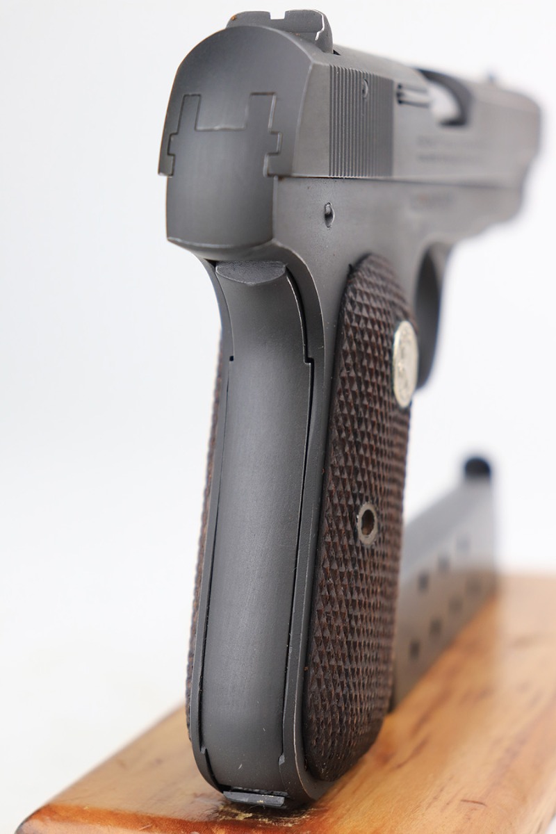 3/2/22 – This is an excellent and rare Colt M1903 that was issued to the U.S. Army during World War II. Only ~10,000 such examples were issued to the U.S. military branches, with about 7,000 going to the Army. This one is in excellent condition but may have been re-parkerized. We can’t say with 100% certainty but the Colt logo and crossed cannons cartouche are now faint. The parkerized finish is in excellent condition with only minor thinning, and the pistol does have a minty bore so it doesn’t appear it was used much. Excellent grips with sharp checkering. Mag is marked ‘CAL .32 COLT’ on the base. Listing includes a period unmarked holster.
