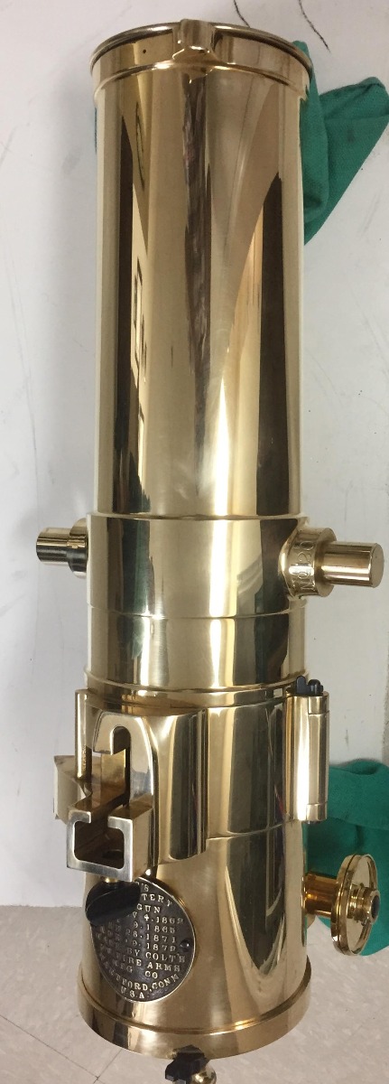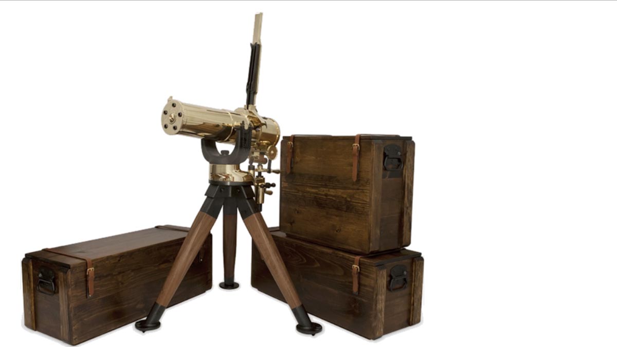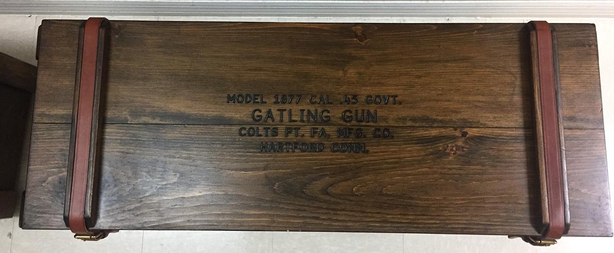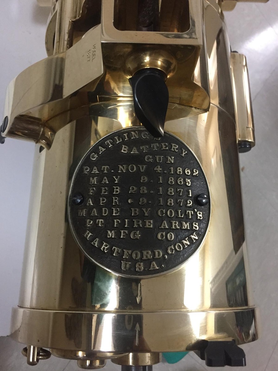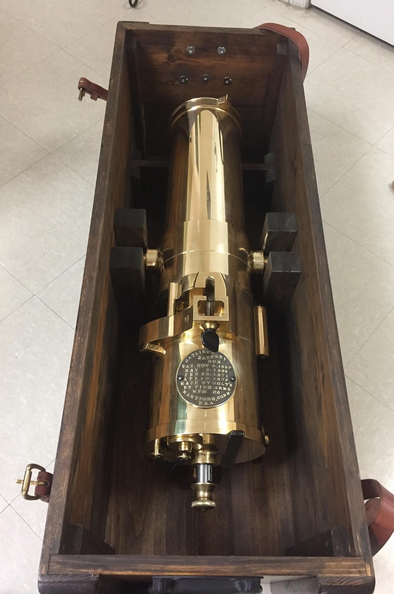 7/30/18 – This is a rare and gorgeous Colt Model 1877 Bulldog Gatling Gun, that is chambered in .45-70 Government and fires up to 800 rounds per minute! Colt made these guns new a few years back, and it is made of solid brass and comes with wooden tripod, three wooden transit cases, brass yolk for tripod, and all original packing material and small accessories. Colt made only 50 of these, and this one is number 20. It is new in box and unfired, and it is non-NFA so no 6-12 month waiting period! This would make a marvelous centerpiece item for a serious collector of early American firearms.