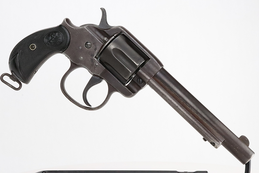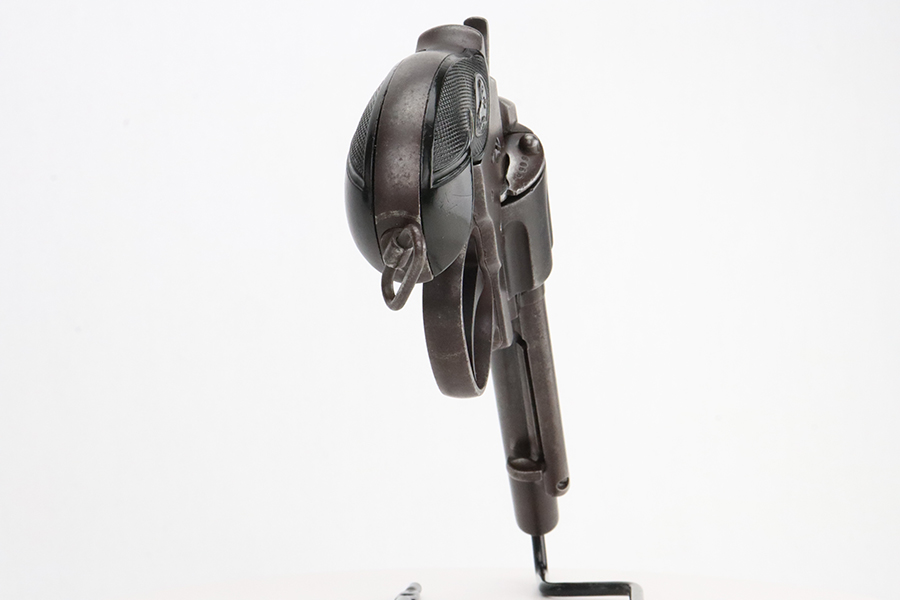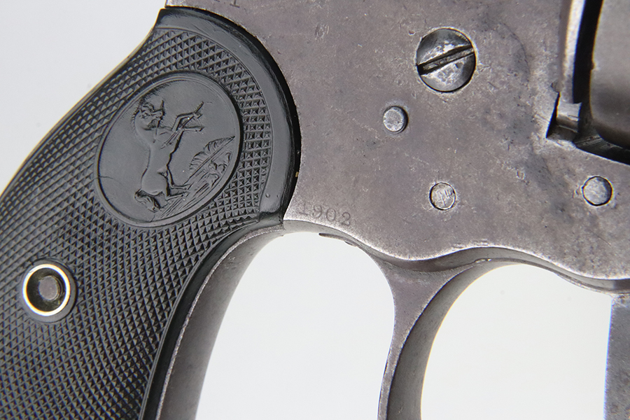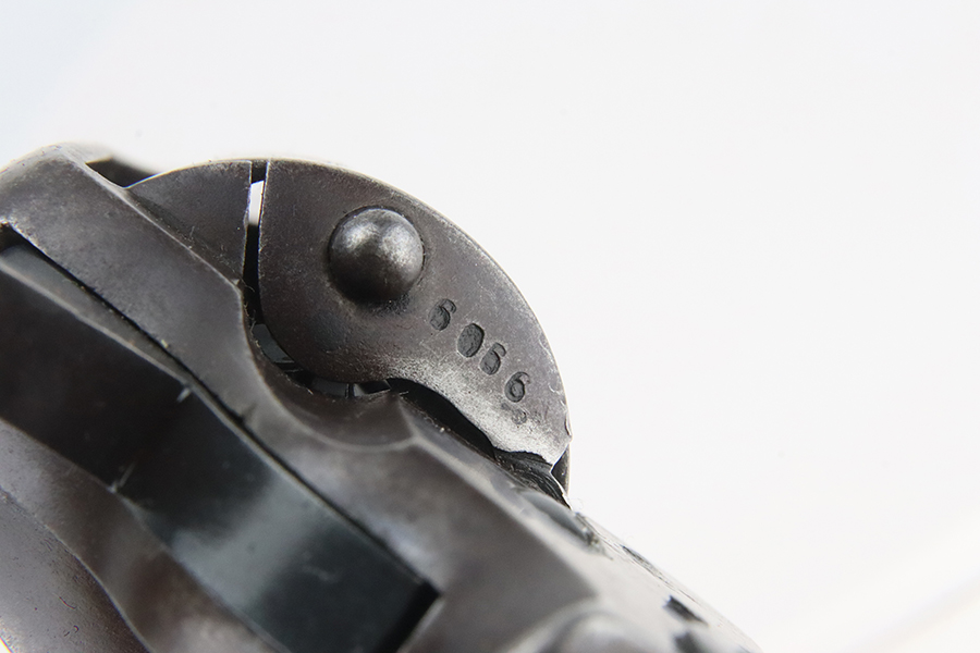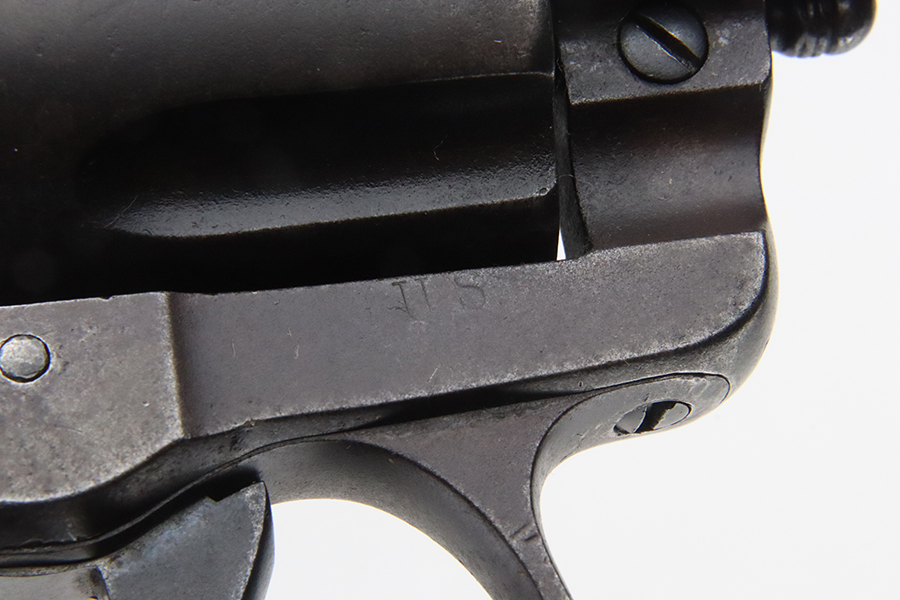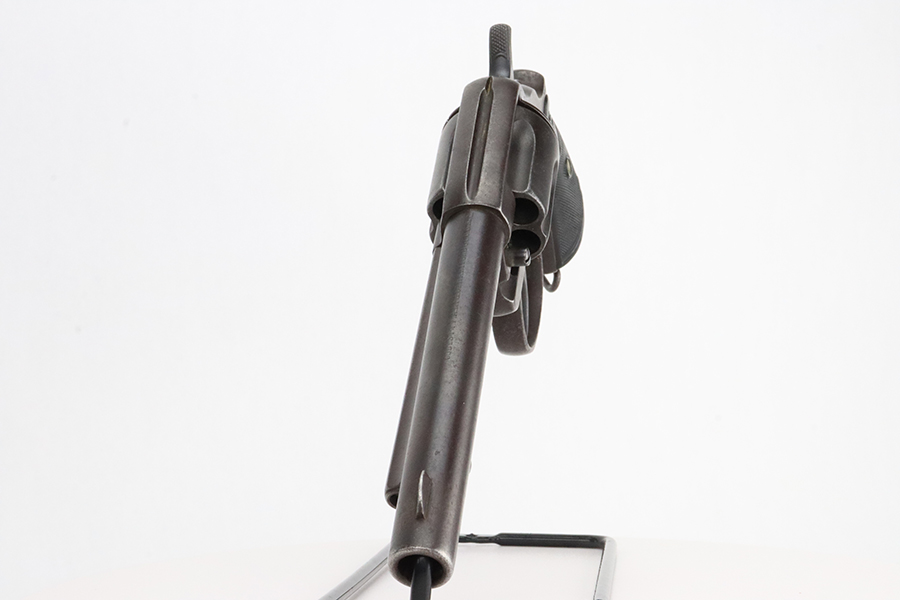 1/31/24 – This is a rare Colt M1902 Philippine model revolver that was manufactured upon request of the U.S. Army during the Philippine-American War and Moro Rebellion. One of only 4,600 produced! A stronger mainspring was installed to ensure the hammer had enough force to fire the .45 Long Colt government ammunition which was less sensitive than the ammunition on the civilian market. The smaller Model 1878 trigger and trigger guard were replaced with larger versions to help compensate for the resulting stiffer trigger pull. These revolvers also have a lanyard loop on the butt. This example is matching and has “U.S.,” John T. Thompson’s “JTT” inspector stamp, “U.S.”, and “1902” on the right side of the frame; and Rinaldo A. Carr’s “R.A.C.” stamp on the rear face of the cylinder, left side of the frame at the hump, and on the left side of the trigger guard. There is not much actual finish loss on this gun, but there is obvious brown patina covering the whole gun. Fitted with black plastic grips. The rifling in the bore is a bit worn with pitting throughout. These guns are notorious for their timing issues, as is the case for this one.