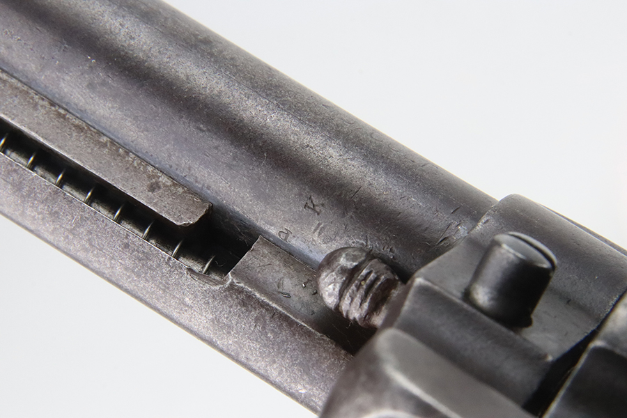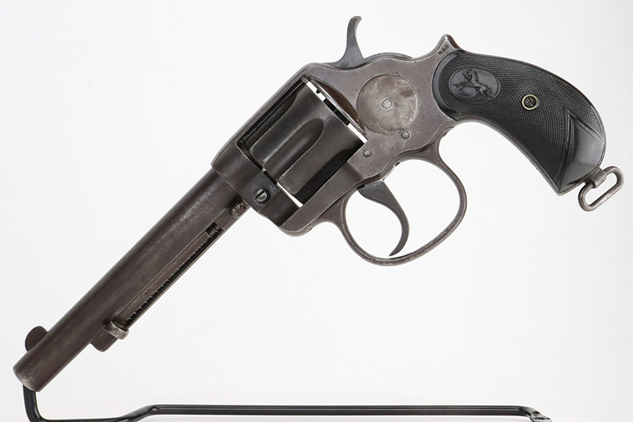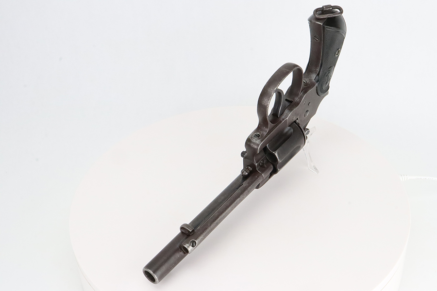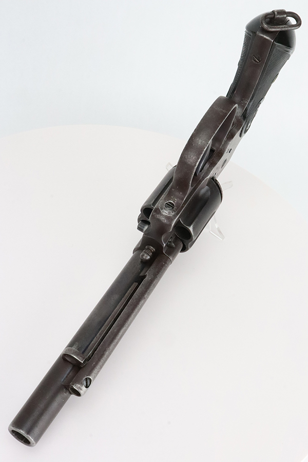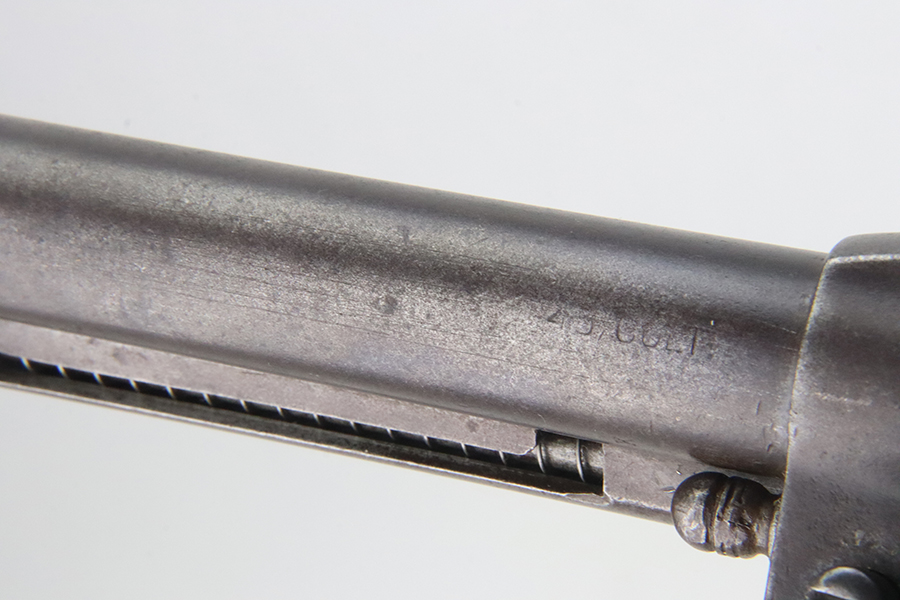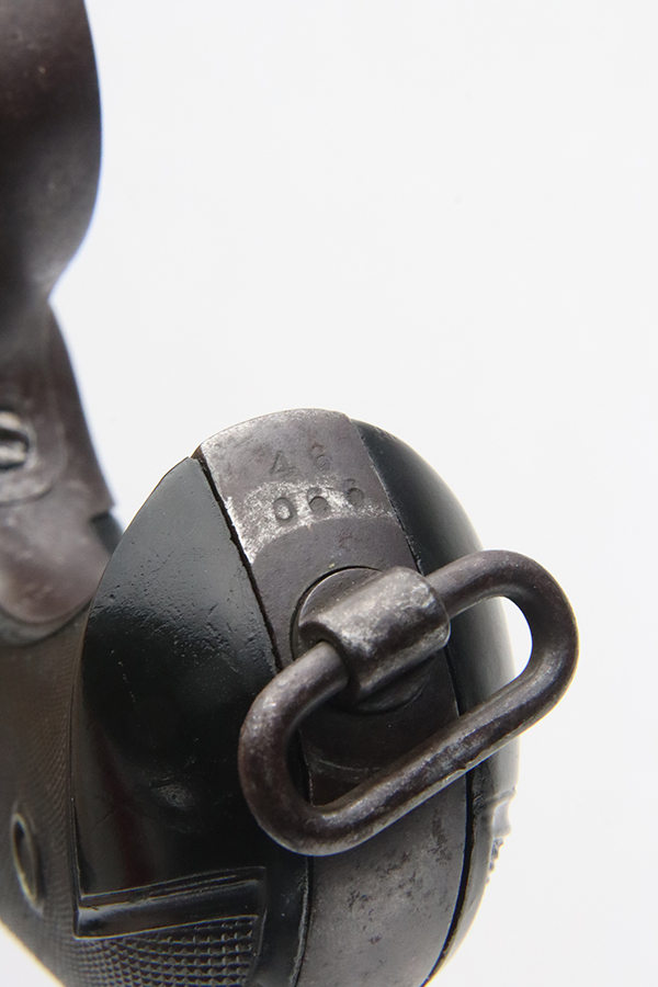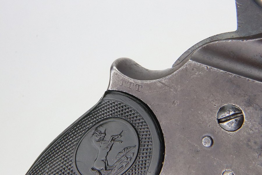 1/31/24 – This is a rare Colt M1902 Philippine model revolver that was manufactured upon request of the U.S. Army during the Philippine-American War and Moro Rebellion. One of only 4,600 produced! A stronger mainspring was installed to ensure the hammer had enough force to fire the .45 Long Colt government ammunition which was less sensitive than the ammunition on the civilian market. The smaller Model 1878 trigger and trigger guard were replaced with larger versions to help compensate for the resulting stiffer trigger pull. These revolvers also have a lanyard loop on the butt. This example is matching and has “U.S.,” John T. Thompson’s “JTT” inspector stamp, “U.S.”, and “1902” on the right side of the frame; and Rinaldo A. Carr’s “R.A.C.” stamp on the rear face of the cylinder, left side of the frame at the hump, and on the left side of the trigger guard. There is not much actual finish loss on this gun, but there is obvious brown patina covering the whole gun. Fitted with black plastic grips. The rifling in the bore is a bit worn with pitting throughout. These guns are notorious for their timing issues, as is the case for this one.