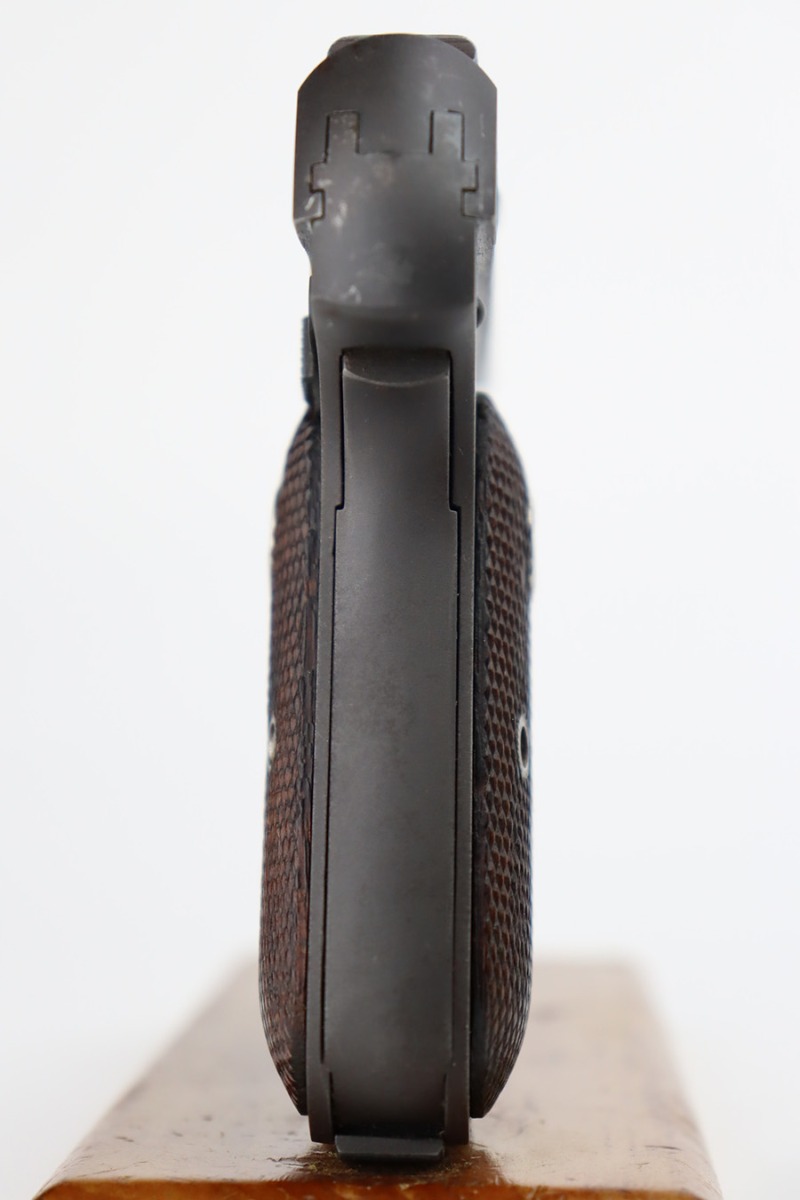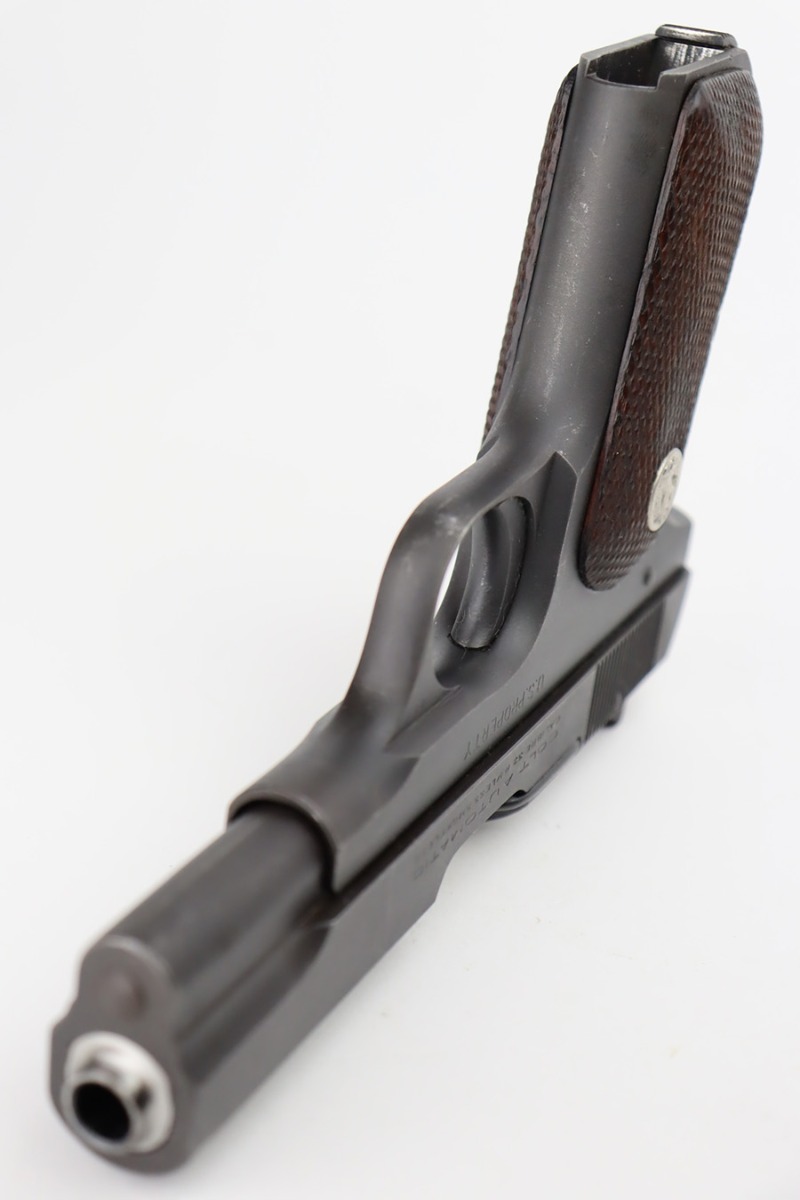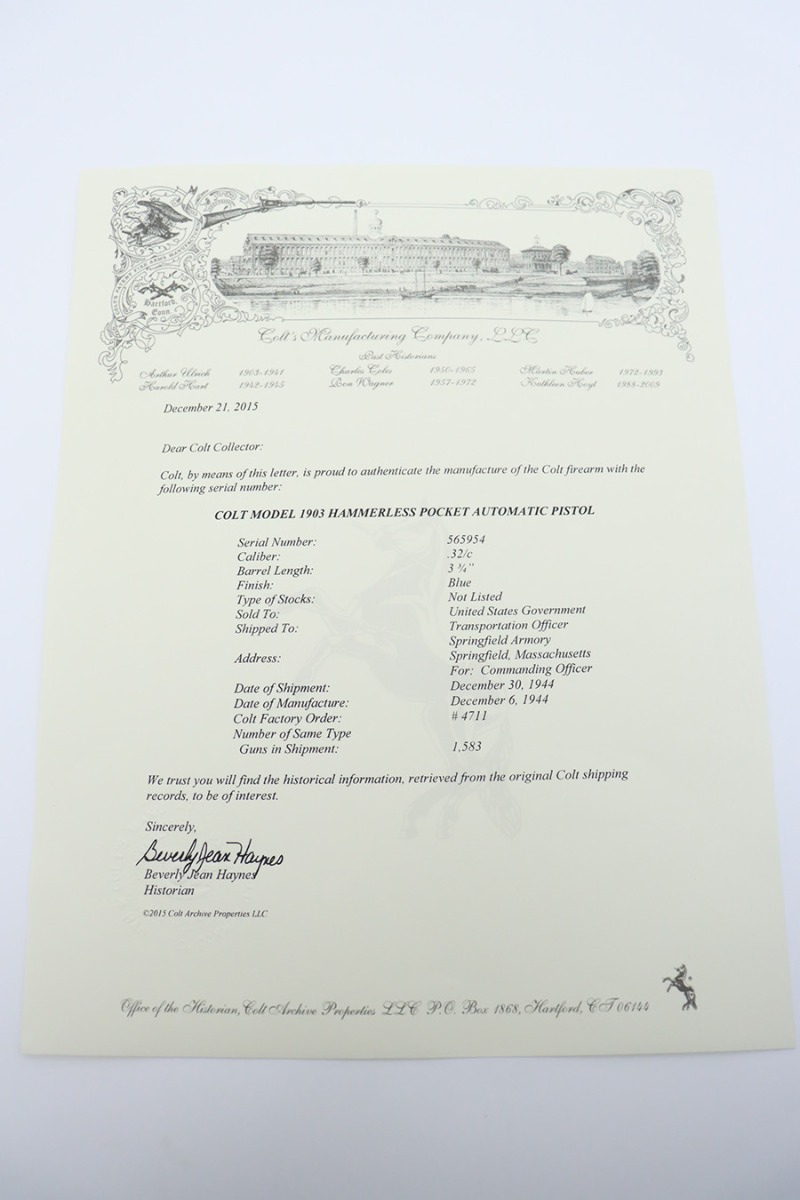 9/28/23 – This is a rare Colt Model 1903 that was issued to the U.S. military in 1944. One of 6,000 issued, this one comes with a Colt archives letter confirming it was shipped to the military in December of 1944. The pistol is all matching and original with some minor thinning on the sides of the frame and general, light scuff marks. Minty bore and nice grips with no cracks. The pistol comes in a matching, hand-numbered box with spare mag.
