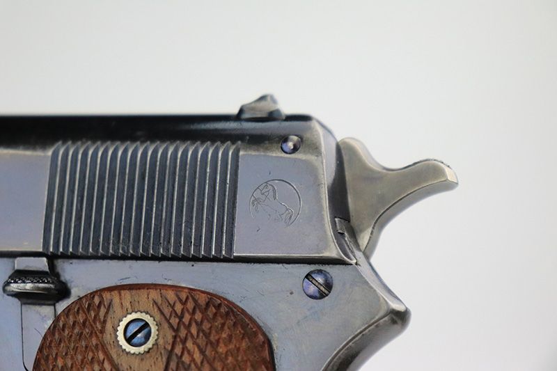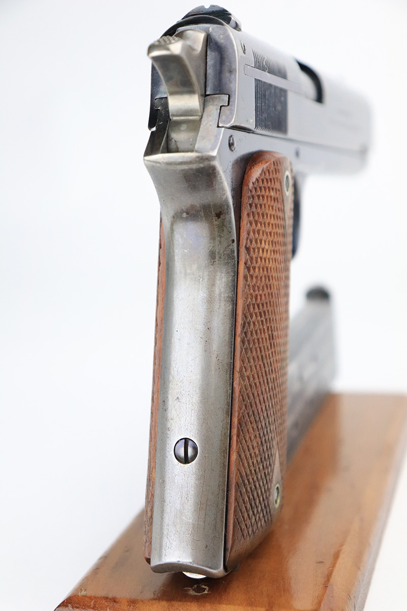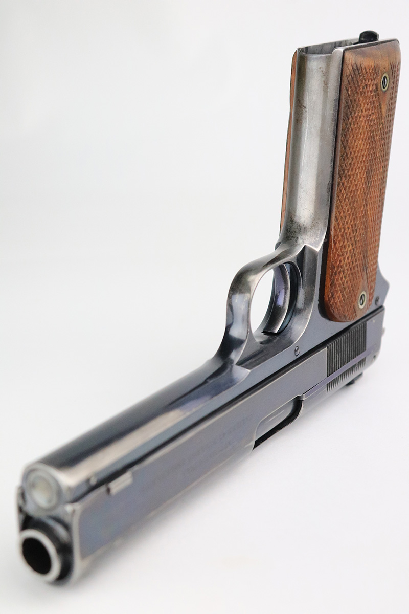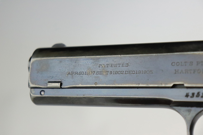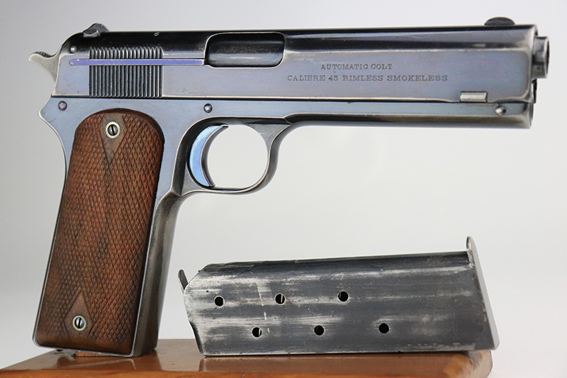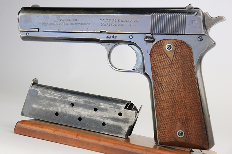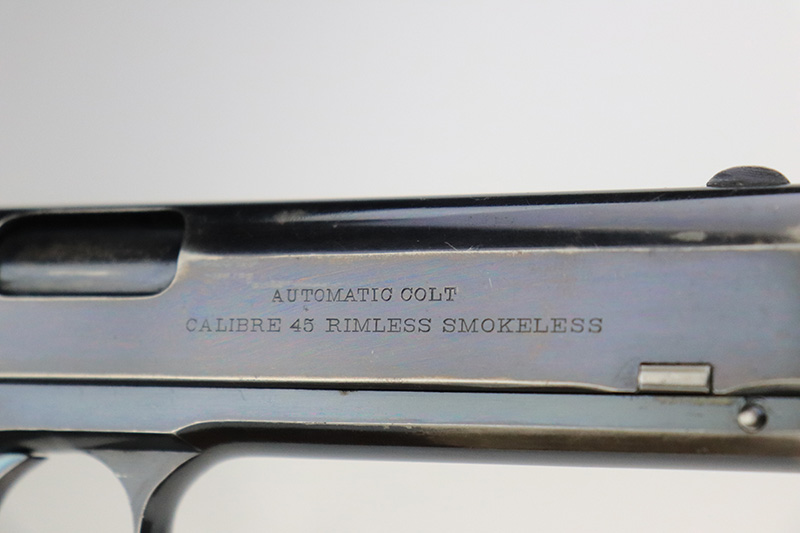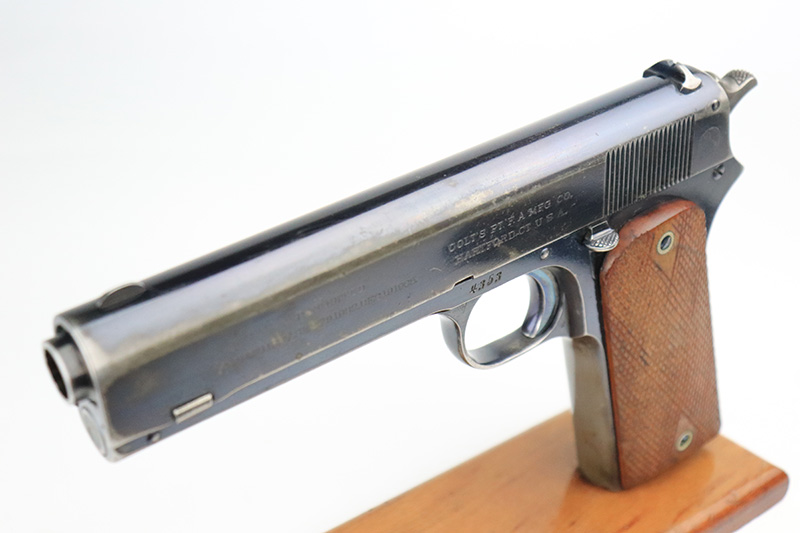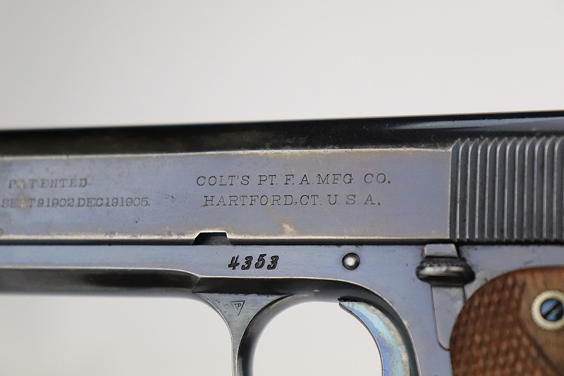 9/15/22 – This is a nice example of a Colt Model 1905 Military, chambered in .45 ACP. From the serial, it was manufactured in 1910. This is an early example and one of only about 6,000 produced. Beautiful case-hardening on the hammer. This particular gun is all matching and in fair condition. It has retained roughly 65-70% of its original Colt bluing. The profile is fairly nice but the straps are worn throughout. Grips show some smoothing of the wood but no cracks or chips. Comes with one proper magazine. The bore is shiny with good rifling and just a little frost.
