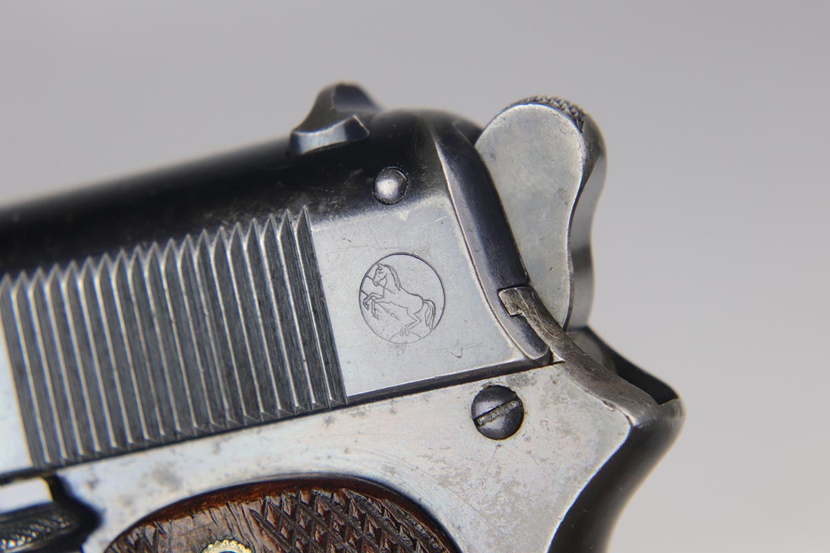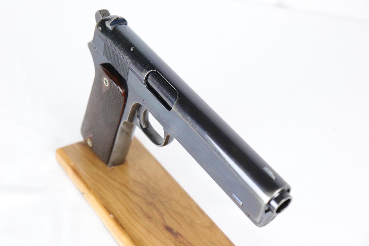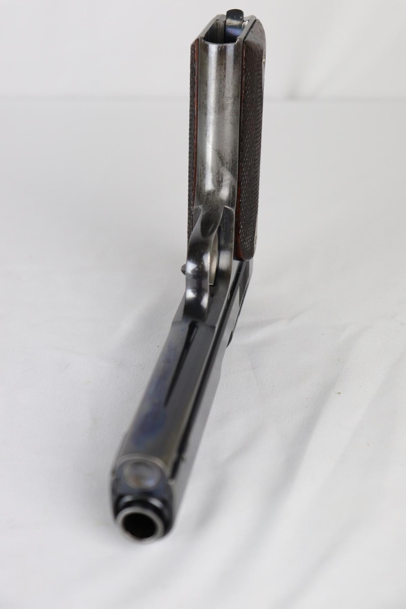 7/12/18 – This is a rare and desirable Colt Model 1905 that was manufactured in 1906.  This is a very early example, with three-digit serial!  There were only about 6,100 of this variation produced from 1906-1911, and this one obviously falls toward the very beginnings of that range.  Chambered in .45, this pistol is all original and correct with about 70% blue remaining.  The slide and profile are very nice with minor patina and thinning of the slide, but the straps are very thin throughout.  Correct original magazine and snub hammer. The hammer does retain a small amount of original case hardening.  Excellent original grips and minty bore!