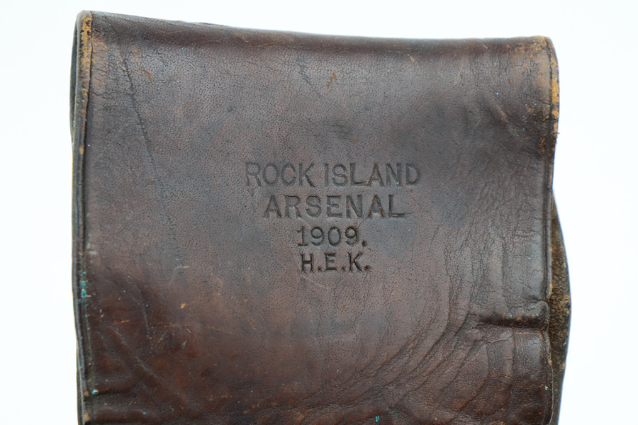 7/24/19 – This is an original, very hard to find model 1909 revolver holster. The holster is completely in tact with very nice leather, especially given the item’s age. Stitching is all original and in tact with no missing stitching. The back leather is Rock Island Arsenal maker stamped with a 1909 date. H.E.K. inspector stamp. Beautiful piece of history!