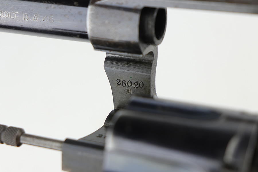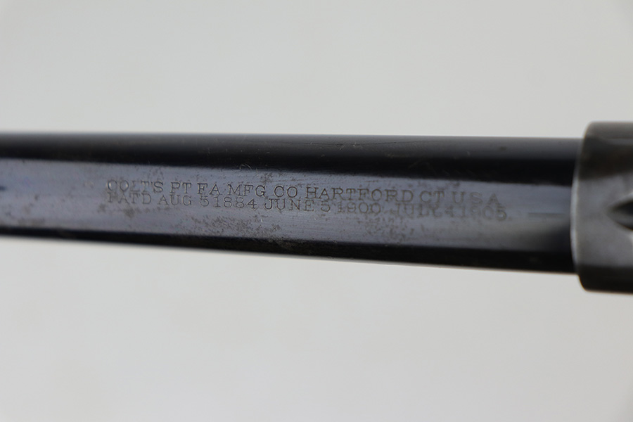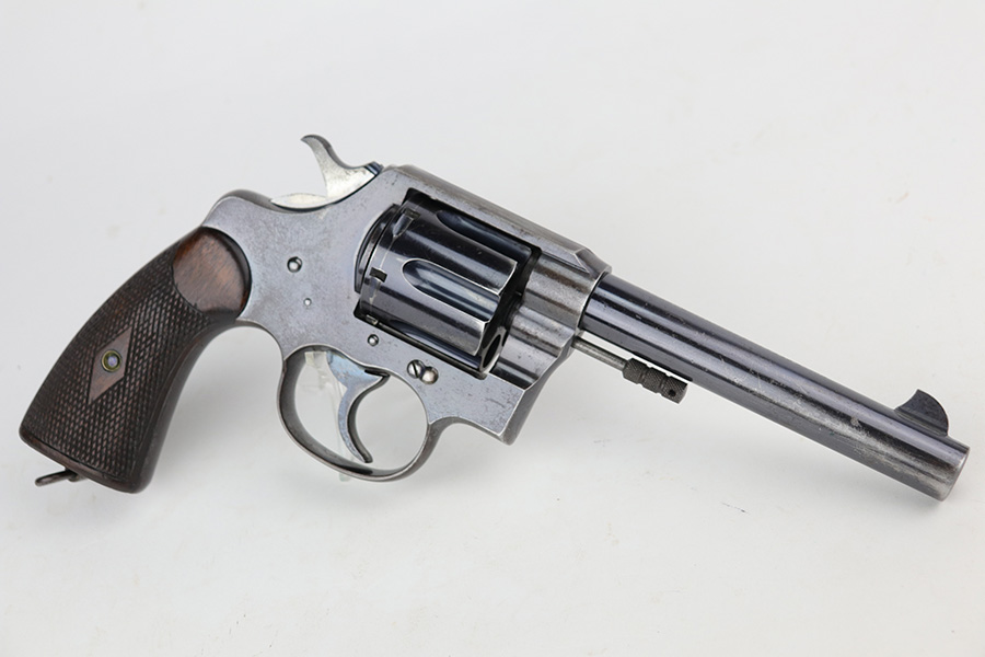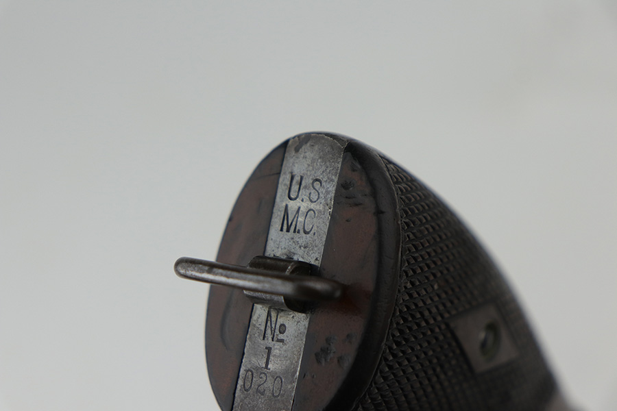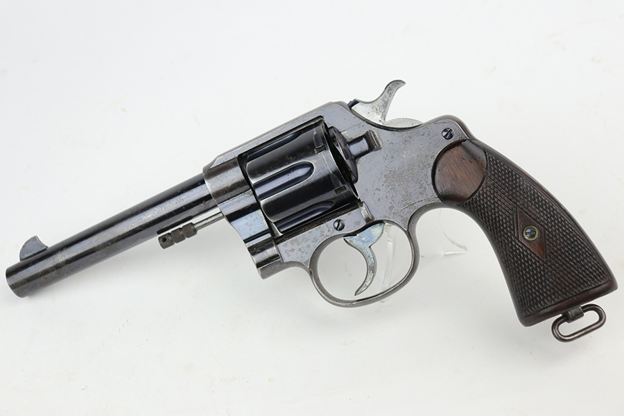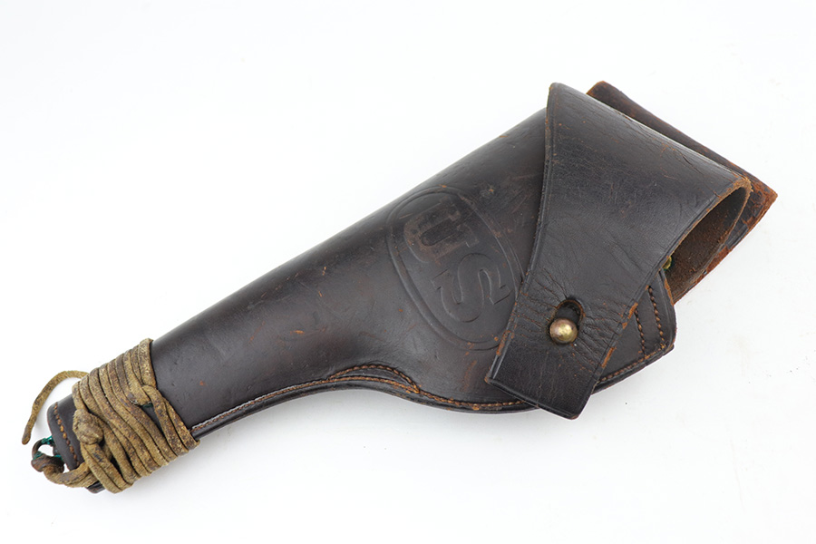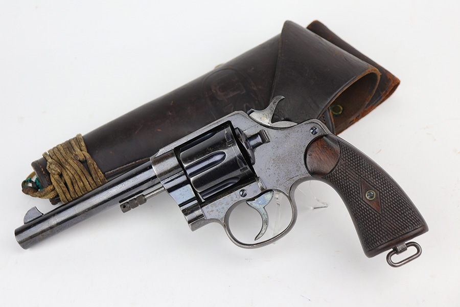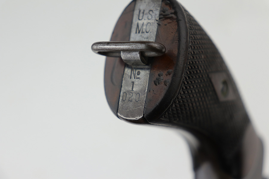 10/1/21 – This is a scare Colt Model 1909 issued to the USMC with a correct Rock Island made holster dated 1911. It retains about 60% of its original high polish blued finish, with some light pin pricking on the left side of the frame. The screws are clean and show some remaining fire blue finish. The bore is near mint and the action works properly in both single and double action. The grips are original and unique to the Model 1909. They are in excellent condition and both sides of the grip are numbered to the gun on the inside. Overall, this is a hard to find, rare variation in very nice, original condition.