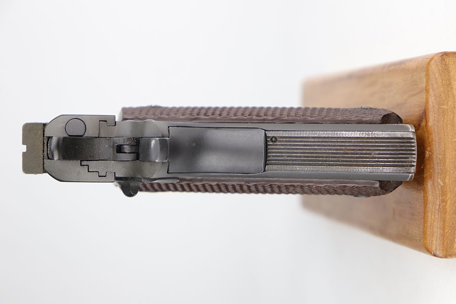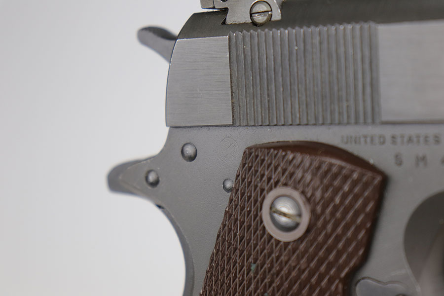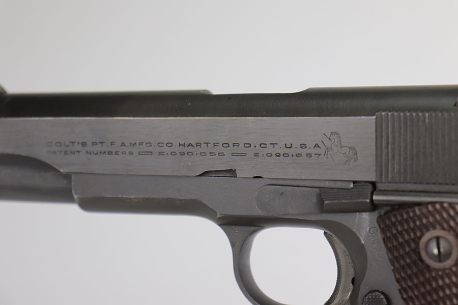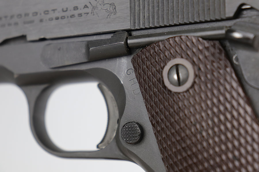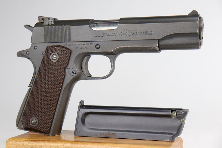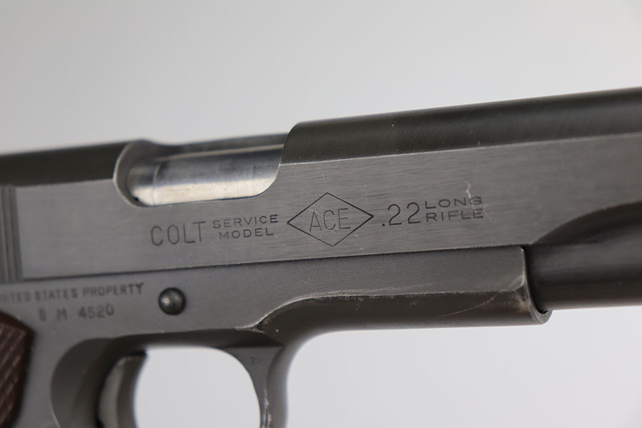 12/29/20 – This is a rare, original Colt Service Model ACE that went to the U.S. military in 1945. There were only 10,000 of these produced for the war, and they were chambered for .22LR and used as training examples. The gun is United States Property marked on the right side of the frame, with G.H.D. inspector mark and crossed cannons cartouche as well. The parkerized finish is generally in great shape, especially the profile view, but the majority of the wear is on the front strap and trigger guard. Excellent grips with no defects. Minty bore. Original magazine.