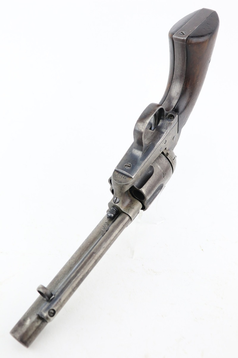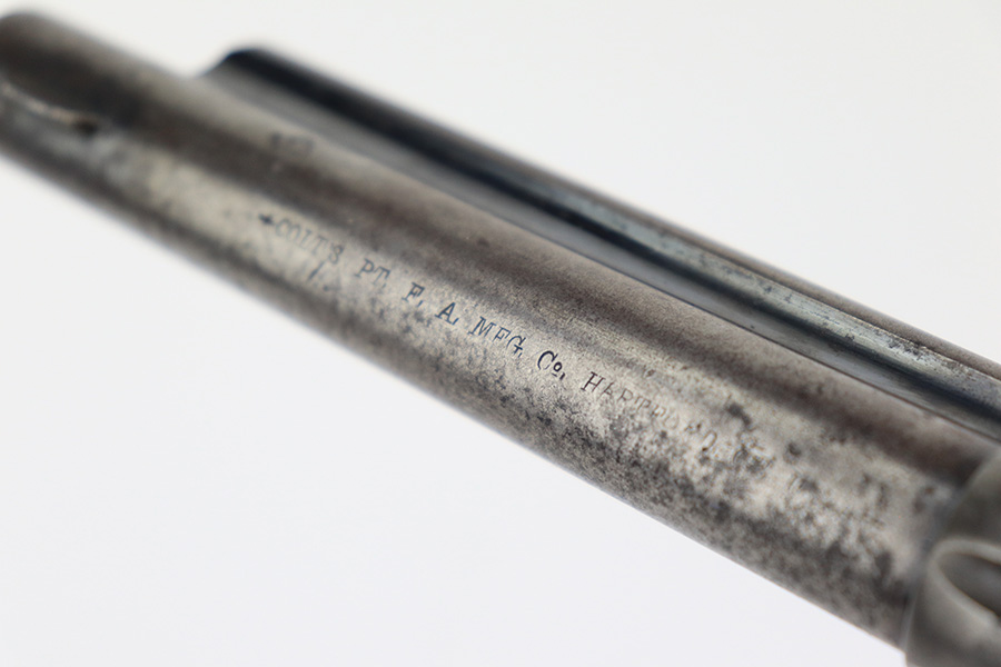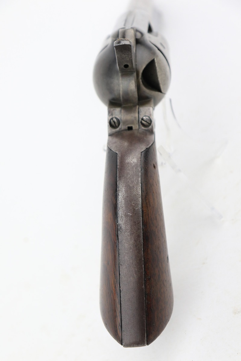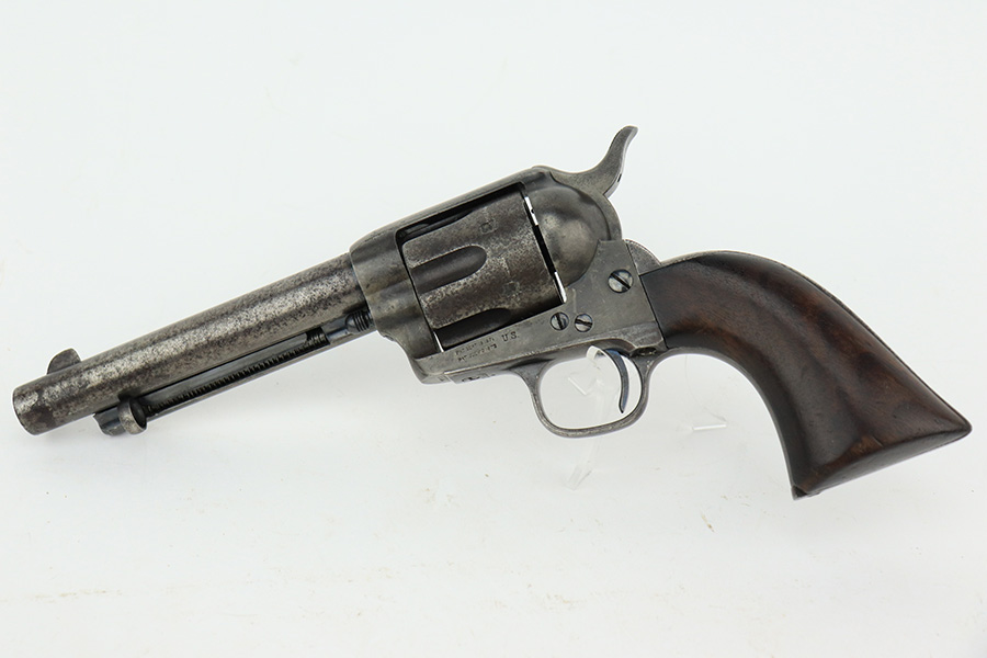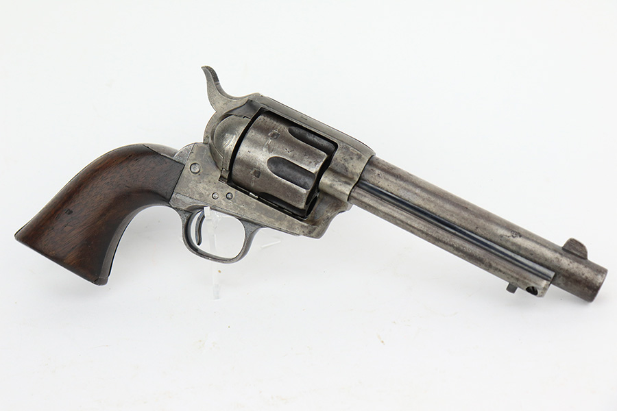 6/2/23 – This is a rare and desirable Colt Single Action Army revolver from the 1870s, known as the Artillery Model. The bluing is original but worn throughout, with only a small amount of case hardening still visible on the receiver. Excellent markings, crisp action works on all 4 clicks and is tight and positive. Receiver is U.S. marked. Bore has decent rifling but some frost and pitting throughout. No licensing required.