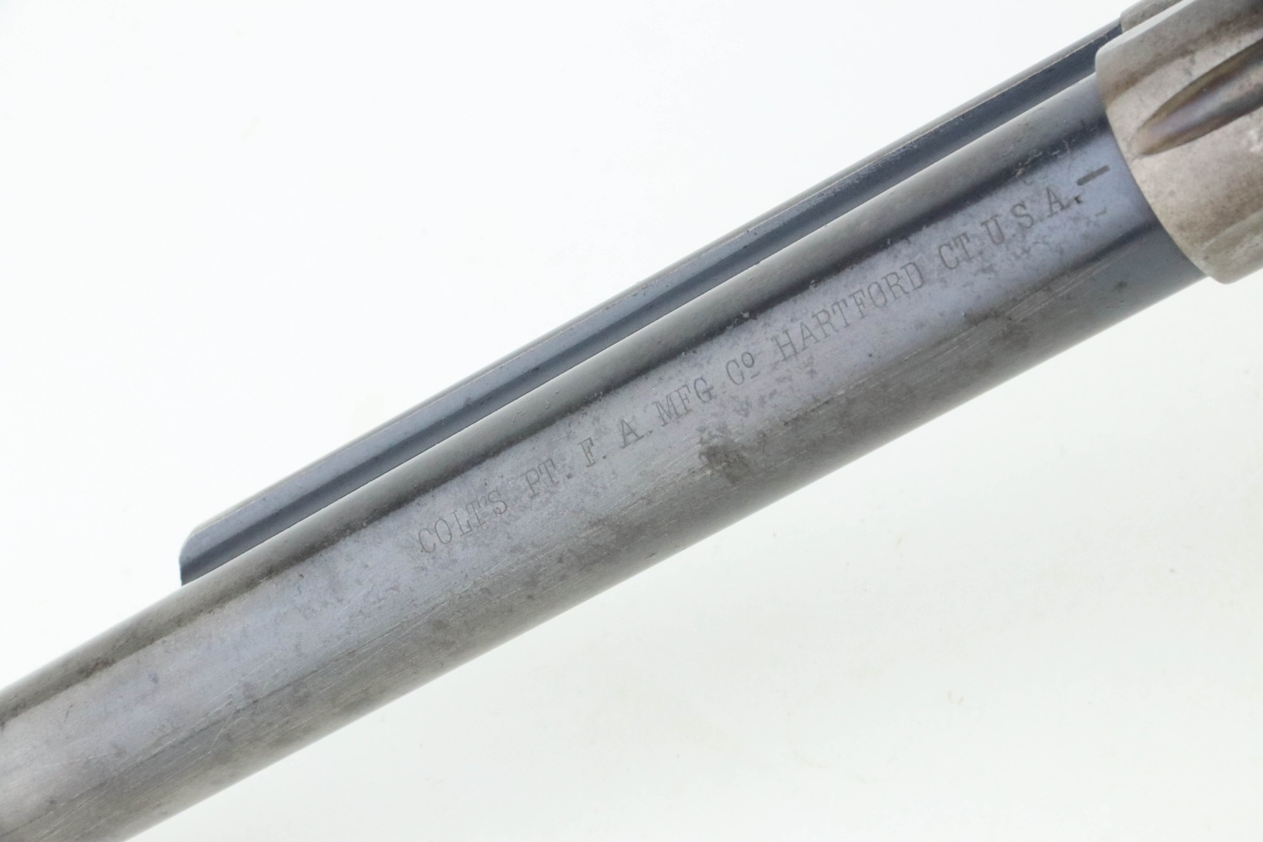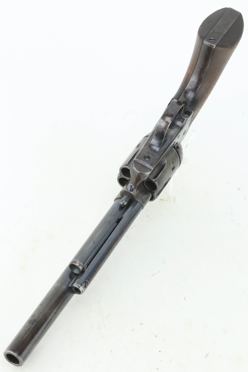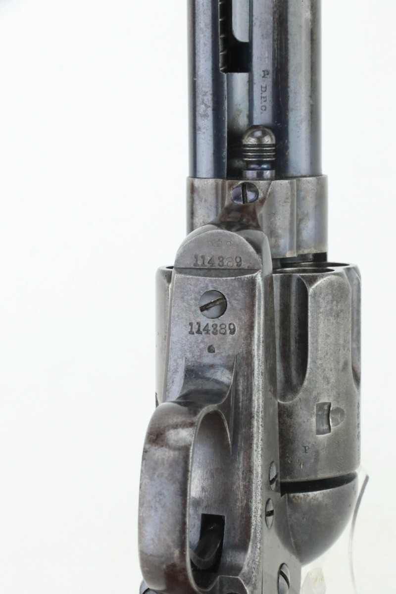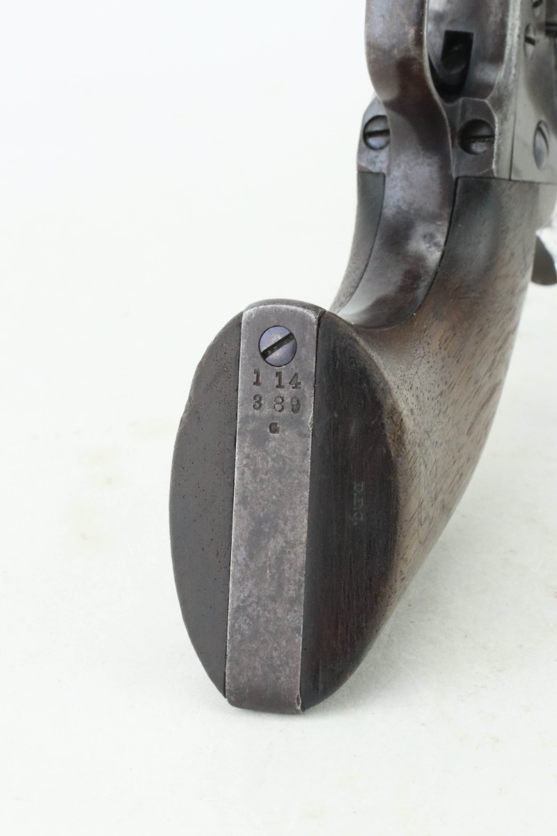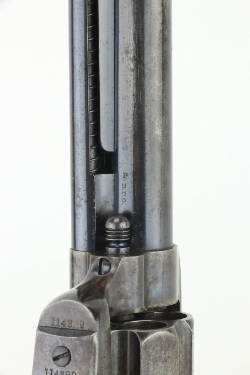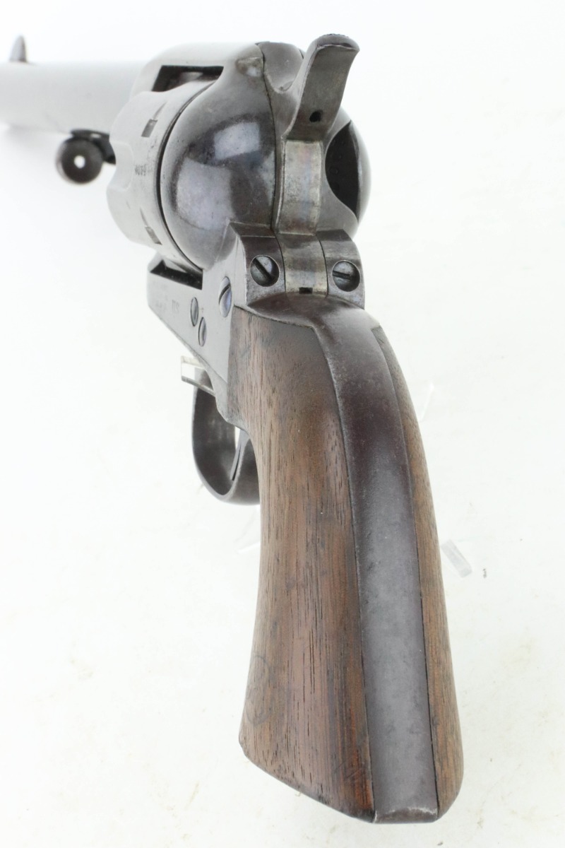 9/9/24 – This is a rare and desirable Colt Cavalry Single Action Army revolver from 1885. All exposed numbers match but the barrel is mismatched. It is DFC inspector marked like the rest of the revolver, so may have been done at an arsenal. It is “US” Property marked on the frame with “G”, “P”, and “DFC” martial markings. The bottom edge of the left grip panel is also “DFC” marked. There are military cartouches on both grip panels, but the left is in an oval, the right is in a rectangle. The gun is entirely matching but has lost nearly all of its finish. There is spotty oxidation and brown “attic patina” throughout. A few small areas with tiny pits here and there. The wood grips are in nice condition overall, but show signs of age. The bore is mostly shiny with strong rifling, but there are small spots of surface oxidation here and there. Fully functional.