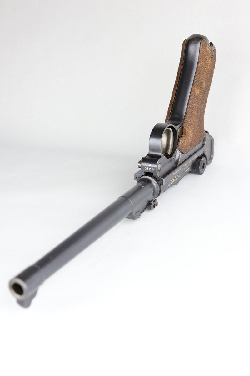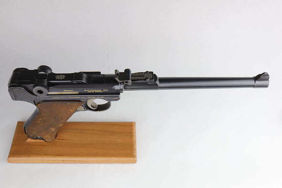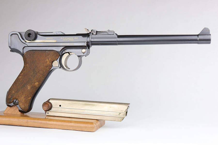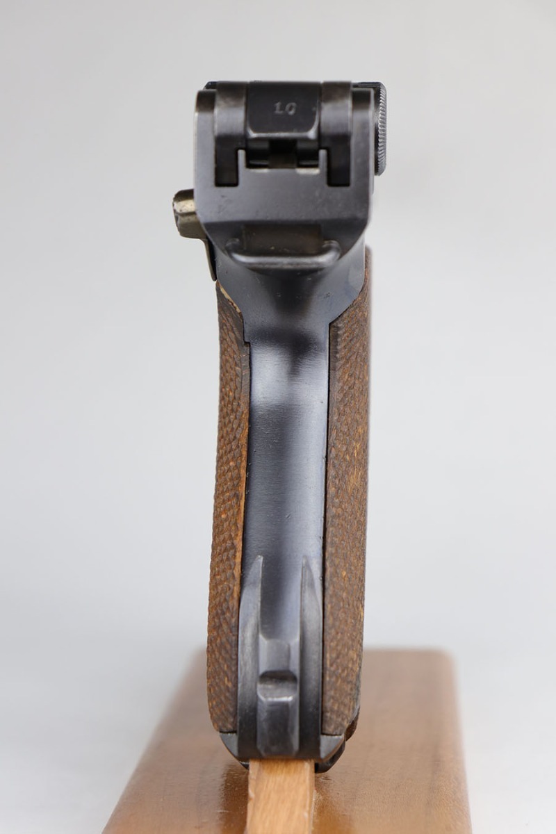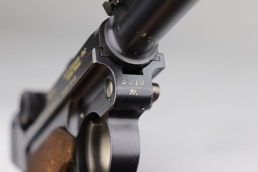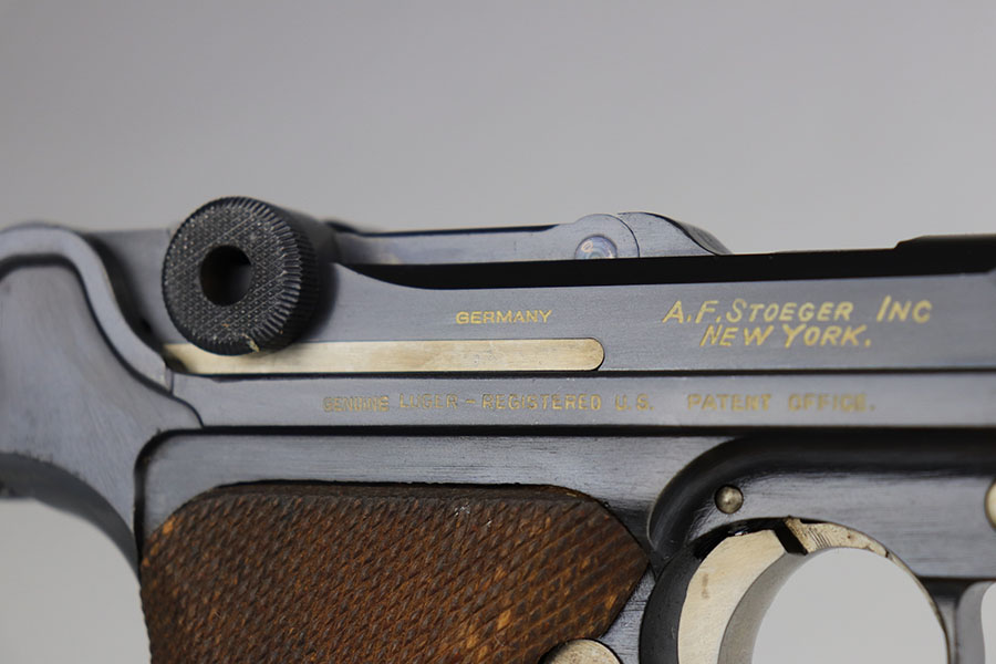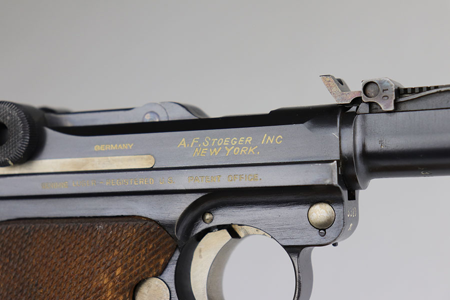 6/12/20 – This is a very rare commercial artillery Luger that was produced by DWM and then sold to private retailer A.F. Stoeger in New York. It has about 98% of the original blue with just a bit of wear on the bottom of the front strap. Beautiful original straw on the small parts. Germany export mark on right side of receiver. The original matching numbered grips are intact and in excellent shape aside from a very minor chip under the safety. Bore shows minor frost but mostly clean with strong rifling.