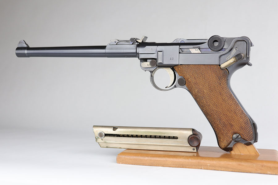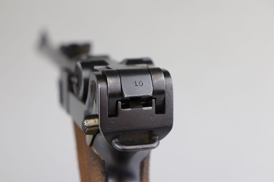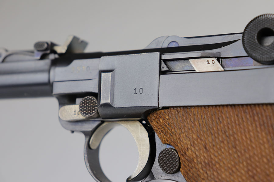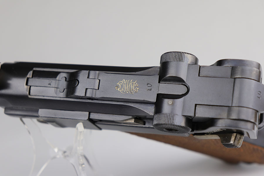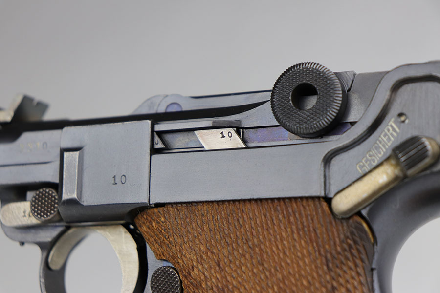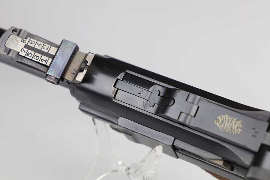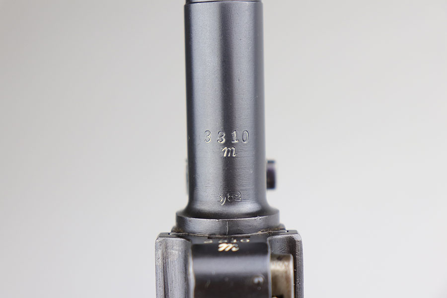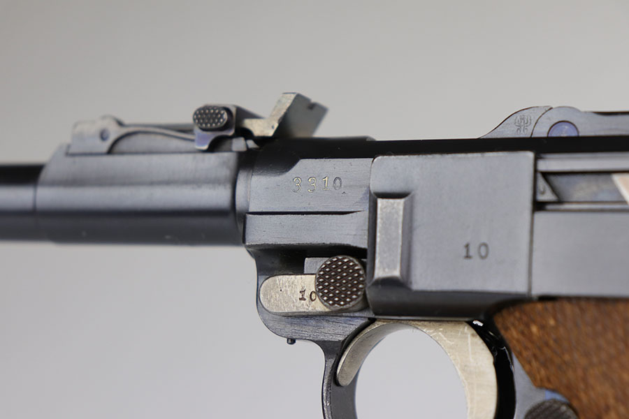 6/12/20 – This is a very rare commercial artillery Luger that was produced by DWM and then sold to private retailer A.F. Stoeger in New York. It has about 98% of the original blue with just a bit of wear on the bottom of the front strap. Beautiful original straw on the small parts. Germany export mark on right side of receiver. The original matching numbered grips are intact and in excellent shape aside from a very minor chip under the safety. Bore shows minor frost but mostly clean with strong rifling.