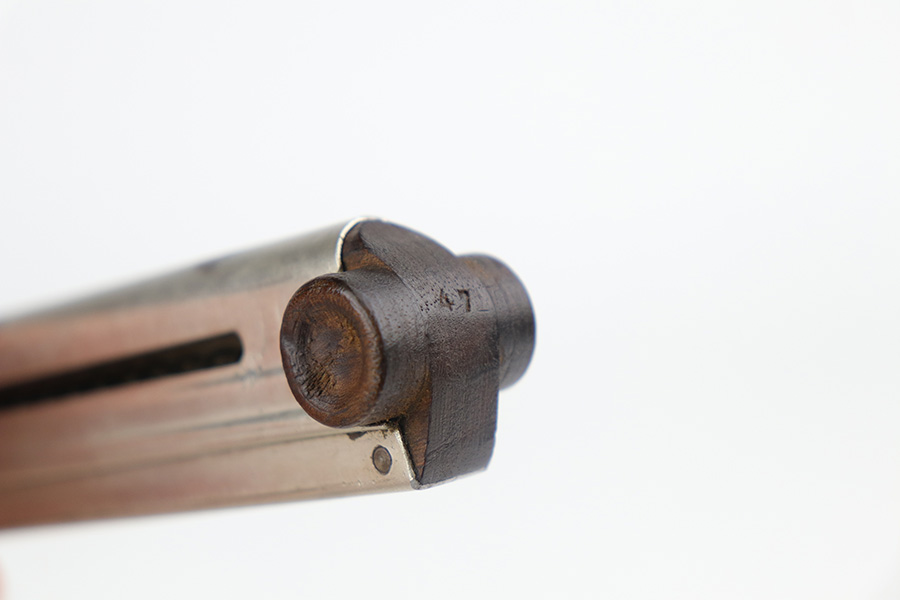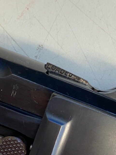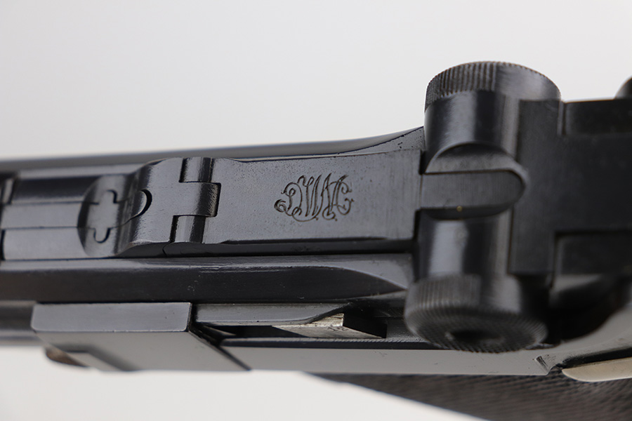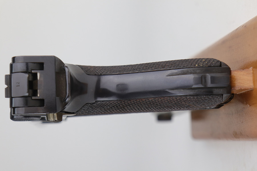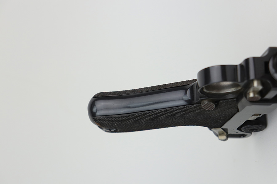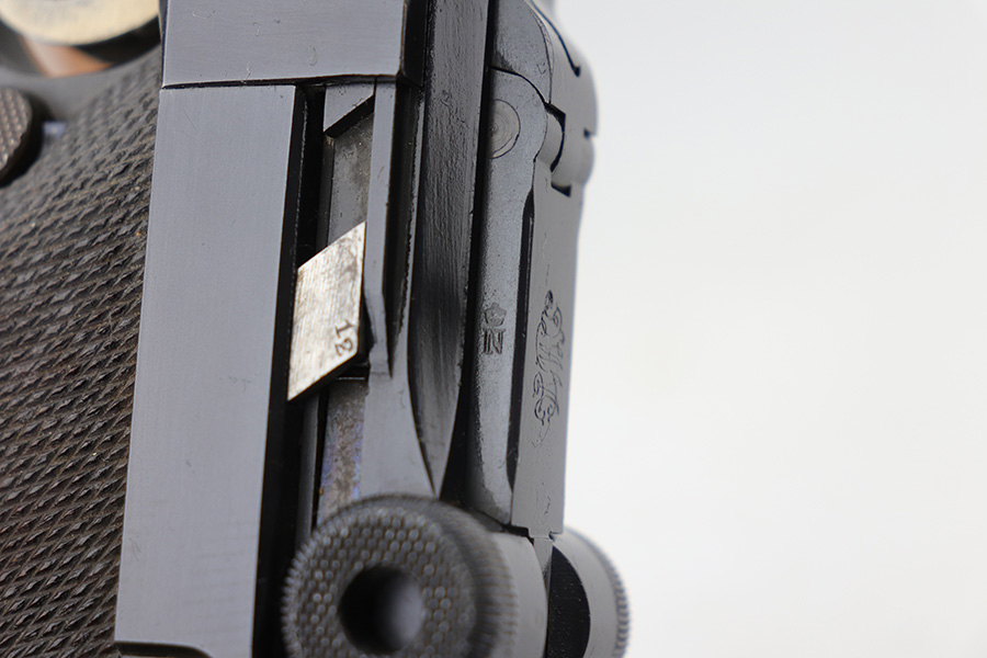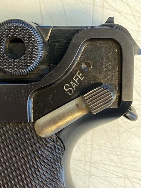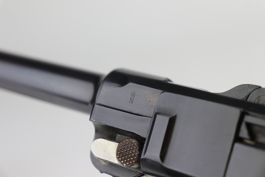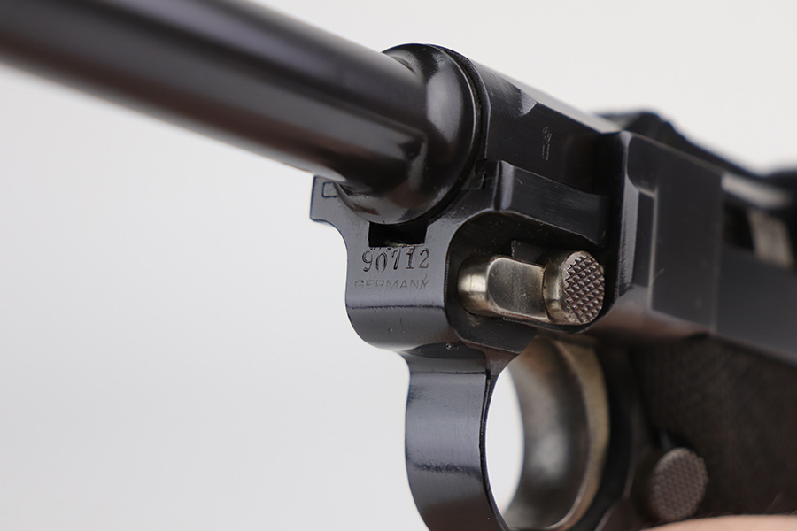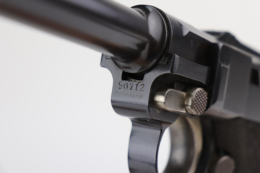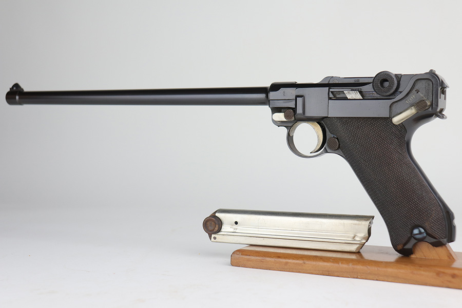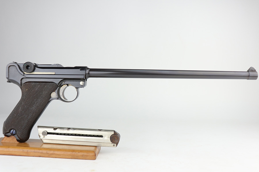 2/21/22 – This is a rare and unique DWM Commercial Luger with 12in barrel and “safe” and “loaded” marked frame, indicating it was made specifically for the American commercial market. The pistol has all matching numbers throughout and minty bluing. The barrel length was presumably part of a custom order by either the American retailer or the customer of the retailer that initially sold this pistol in the states. Beautiful straw on small parts. The grips are in great shape with minor handling wear but no cracks. They are numbered and matching to each other but not the pistol. The magazine is also period original but numbered on the base. Bore is shiny with strong rifling but at some point wasn’t cleaned well or cared for properly so there is some pitting throughout.