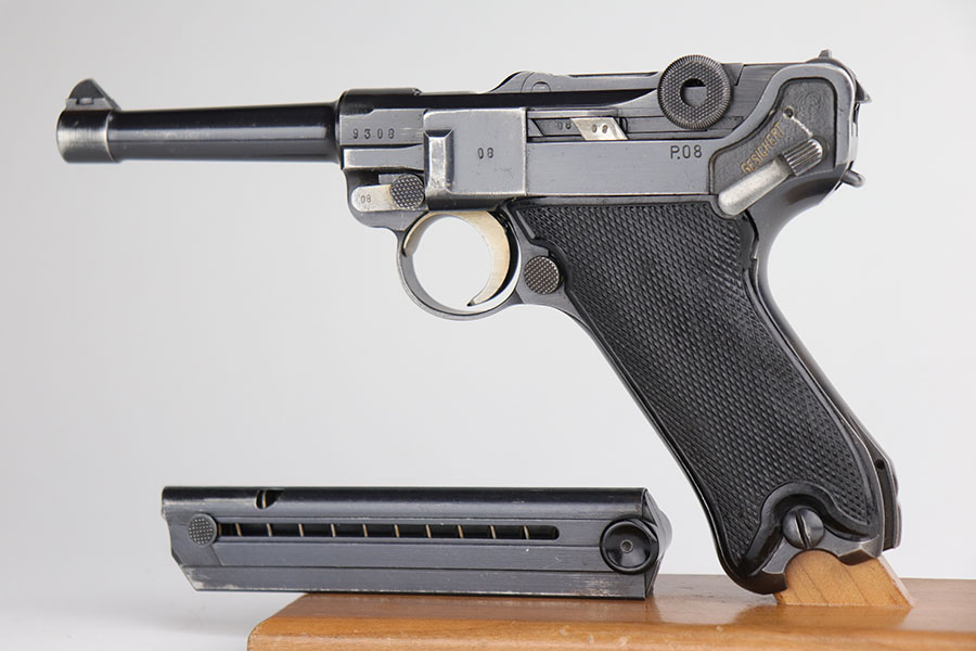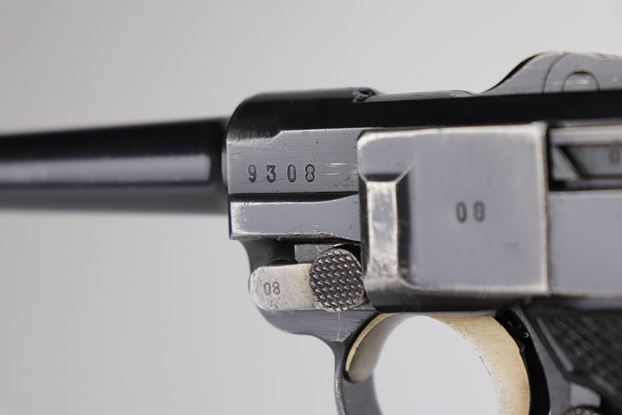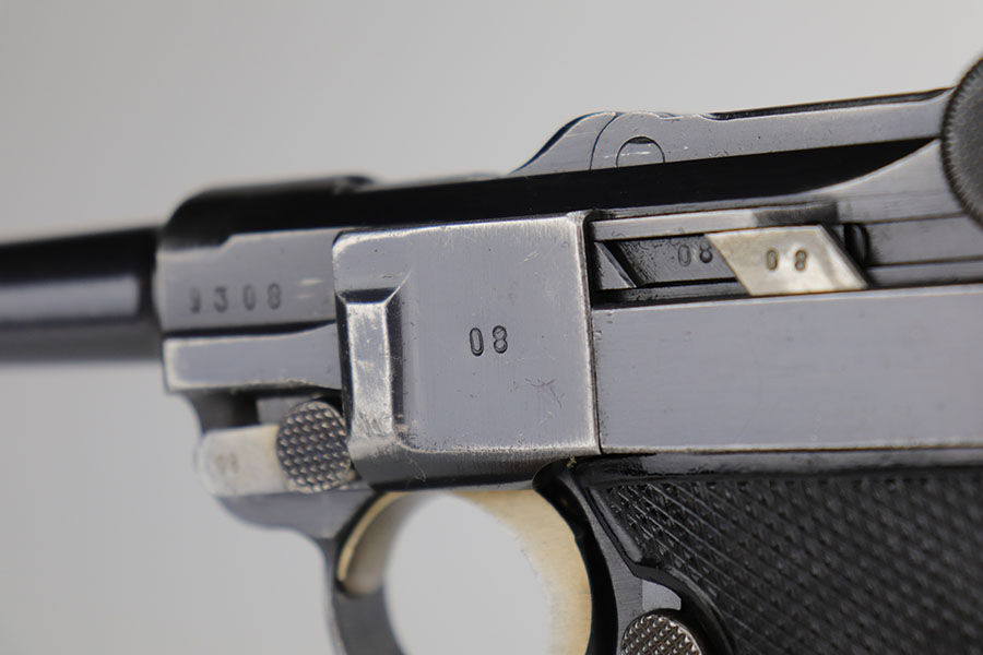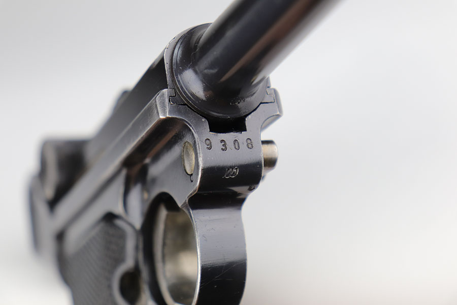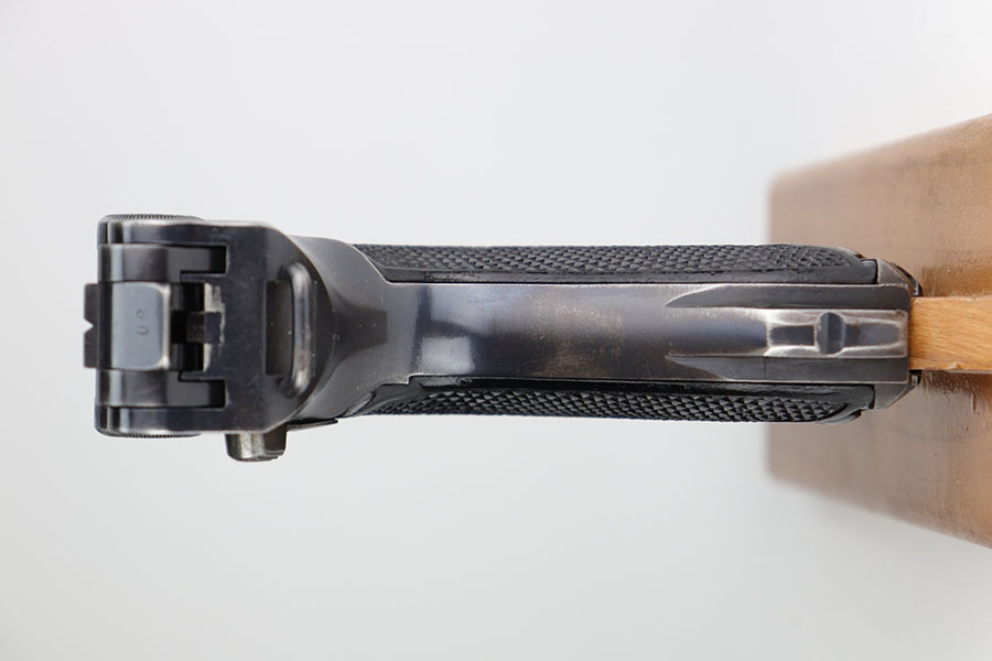 12/29/20 – This is a rare commercial Mauser Luger from 1942. There were only about 15,000 commercial Mauser Lugers ever produced, and only a couple thousand with 1942 date. The pistol is all matching and original with Black Widow style grips and magazine. The finish rates at maybe 80% with high edge wear on the profile, but most of the finish loss on the straps. Minty bore. Small parts retain little of the original straw. The Black Widow grips have no cracks or chips but some handling wear. Magazine is in excellent condition.