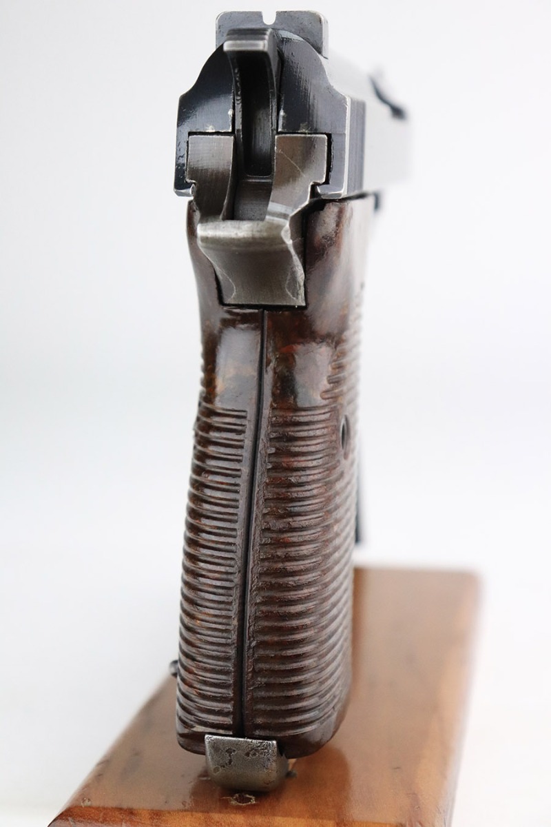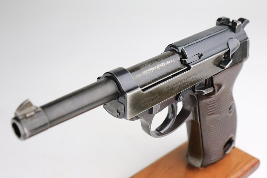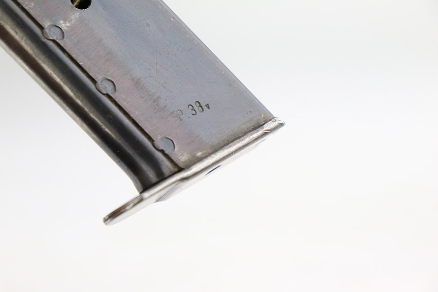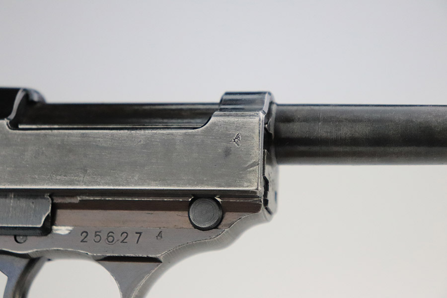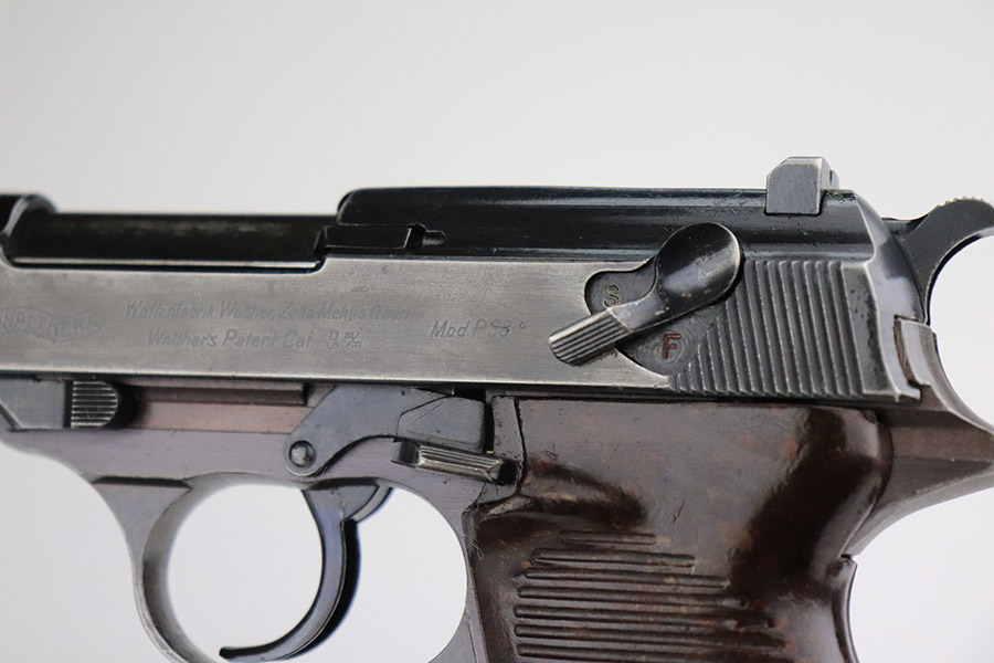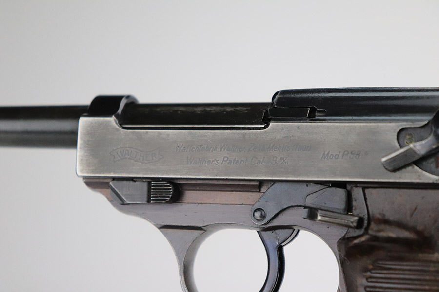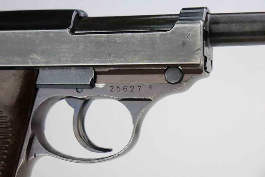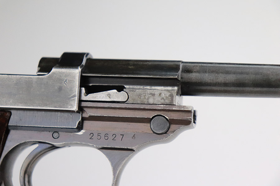 11/7/22 – This is a rare Walther Mod P.38 sold in the commercial market during WW2. One of only 1,800 produced. This one is all matching and has the proper “Eagle N” commercial proofs. It has retained roughly 80% of its finish. The majority of the finish loss is along both sides of the slide, where there are also some areas that have been touched-up with cold blue. There is also minor muzzle wear, wear along the barrel, and some thinning and obvious brown patina on the front strap and underside of the frame. The frame has a slight plum color to it – commonly seen with these commercial guns. It comes with excellent reddish-brown bakelite grips and an “Eagle 359” proofed Walther magazine. Excellent bore with great rifling. De-cocker is functional.