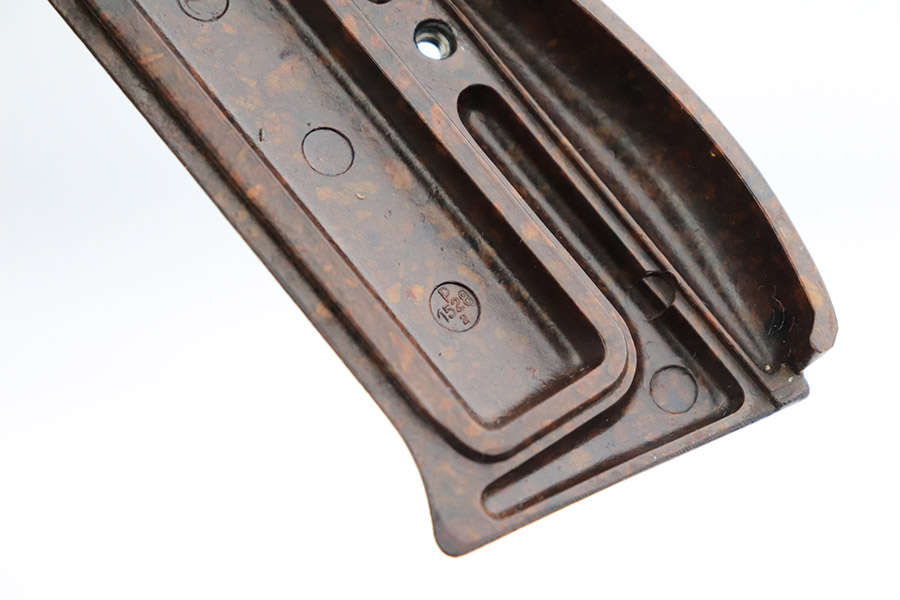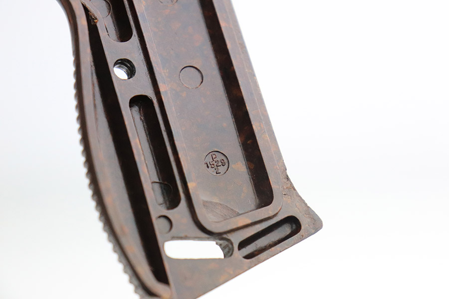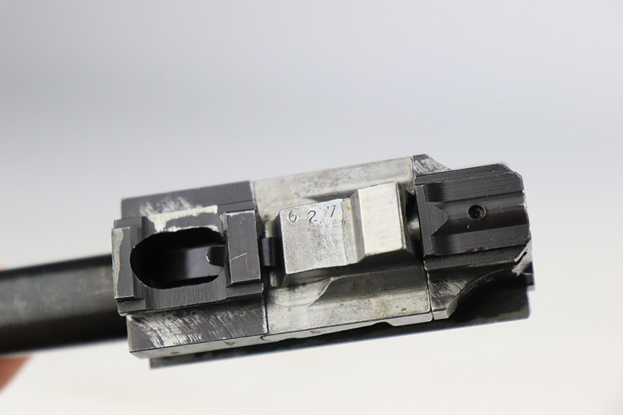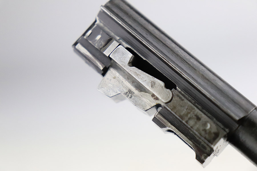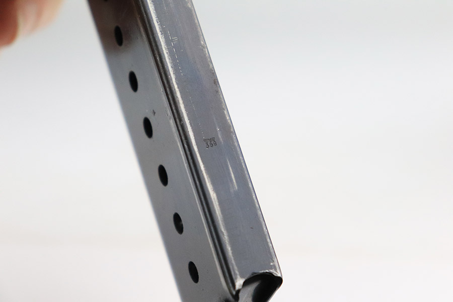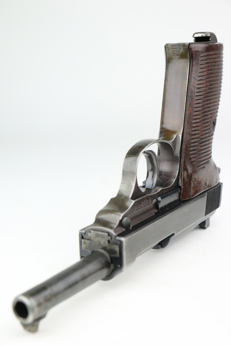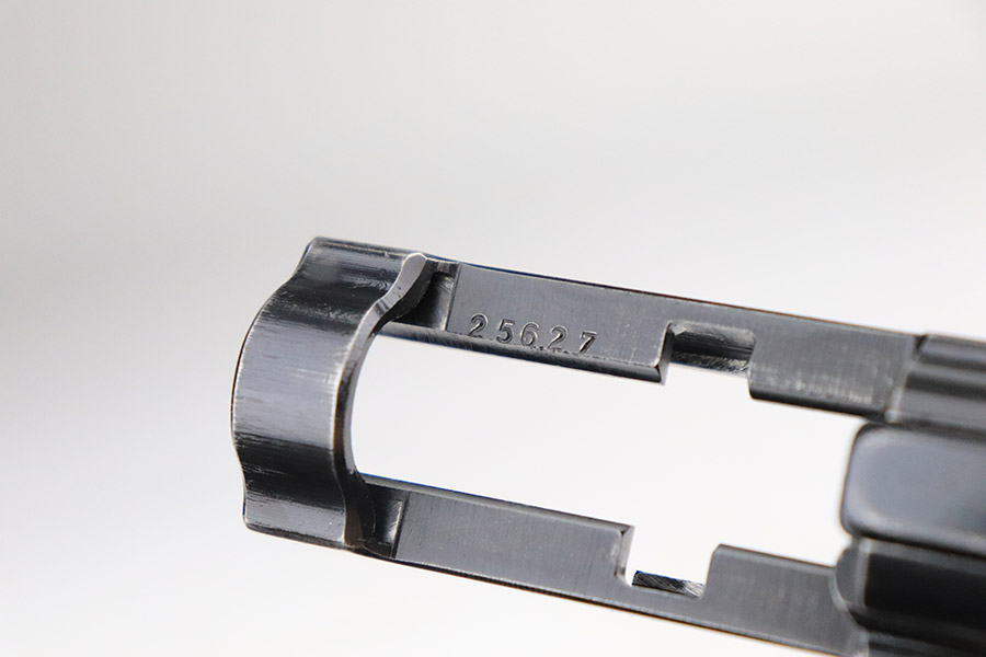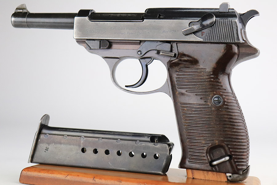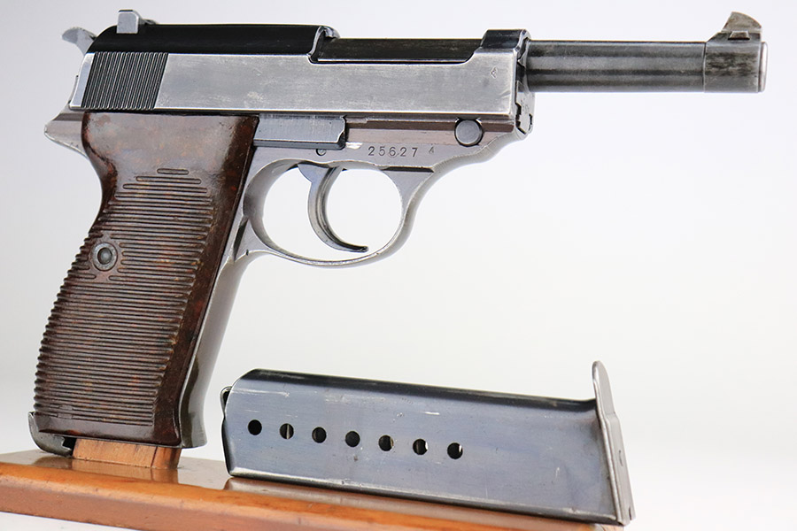 11/7/22 – This is a rare Walther Mod P.38 sold in the commercial market during WW2. One of only 1,800 produced. This one is all matching and has the proper “Eagle N” commercial proofs. It has retained roughly 80% of its finish. The majority of the finish loss is along both sides of the slide, where there are also some areas that have been touched-up with cold blue. There is also minor muzzle wear, wear along the barrel, and some thinning and obvious brown patina on the front strap and underside of the frame. The frame has a slight plum color to it – commonly seen with these commercial guns. It comes with excellent reddish-brown bakelite grips and an “Eagle 359” proofed Walther magazine. Excellent bore with great rifling. De-cocker is functional.